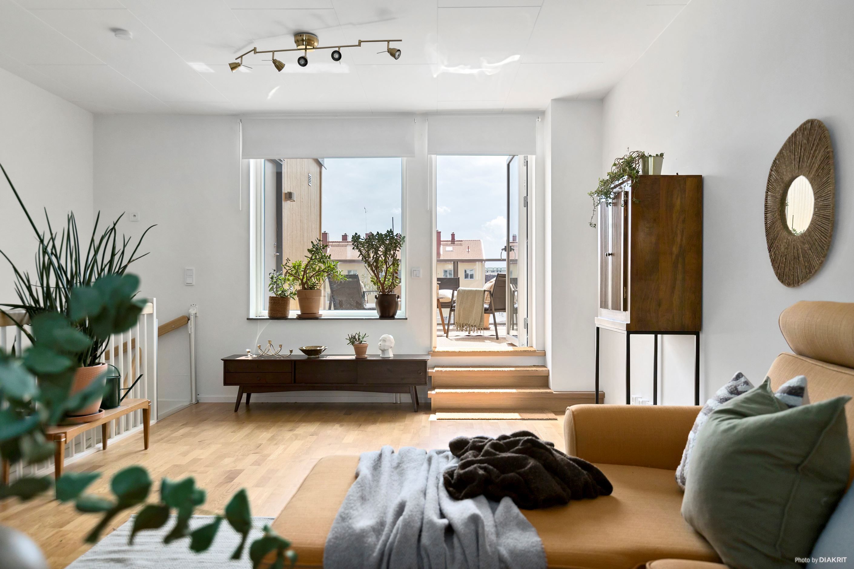 Högst upp väntar hemmets verkliga höjdpunkt: ett underbart allrum med generöst ljusinsläpp som ger en härlig rymd och karaktär. Härifrån kliver du rakt ut på takterrassen i soligt söderläge – en oas med utsikt över takåsarna där du kan njuta av både morgonkaffet och ljumma sommarkvällar i avskildhet - En lyx utöver det vanliga!