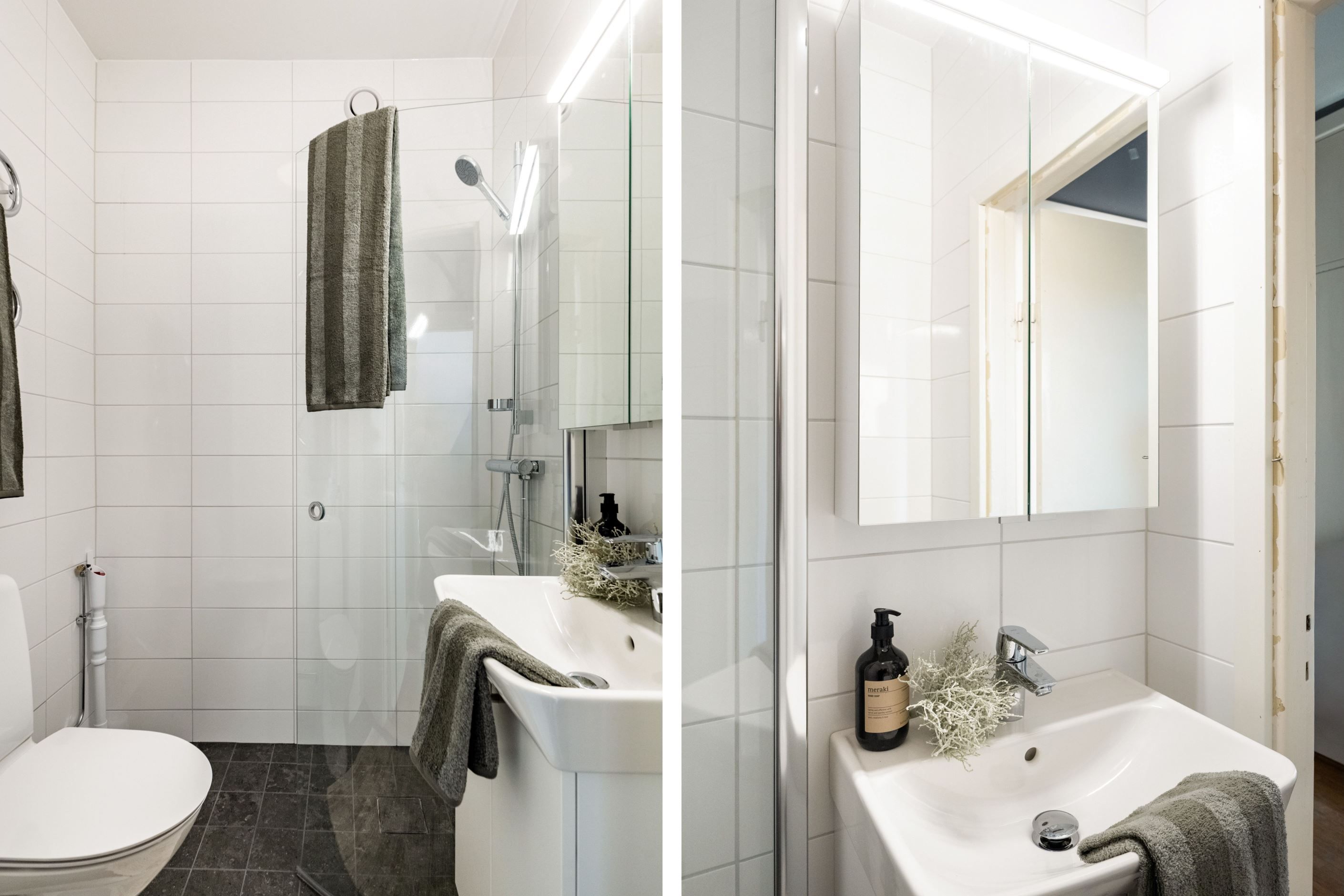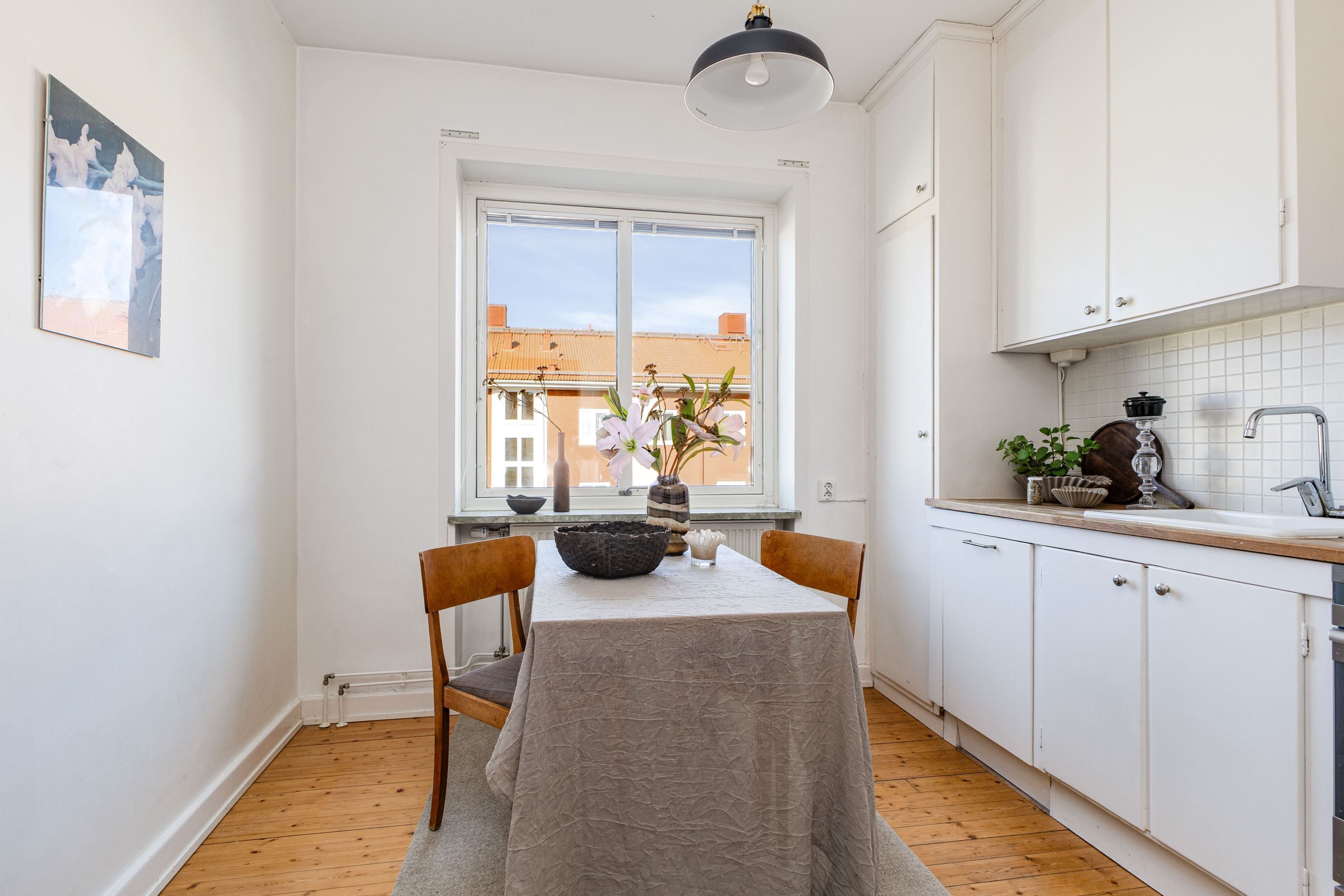 Köket är välplanerat och erbjuder gott om arbetsyta samt plats för matgrupp - en naturlig samlingspunkt för middagar och umgänge. Badrummet är nyligen renoverat i smakfulla, moderna toner och är dessutom förberett för tvättmaskin.