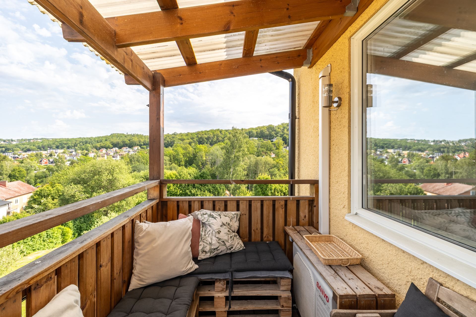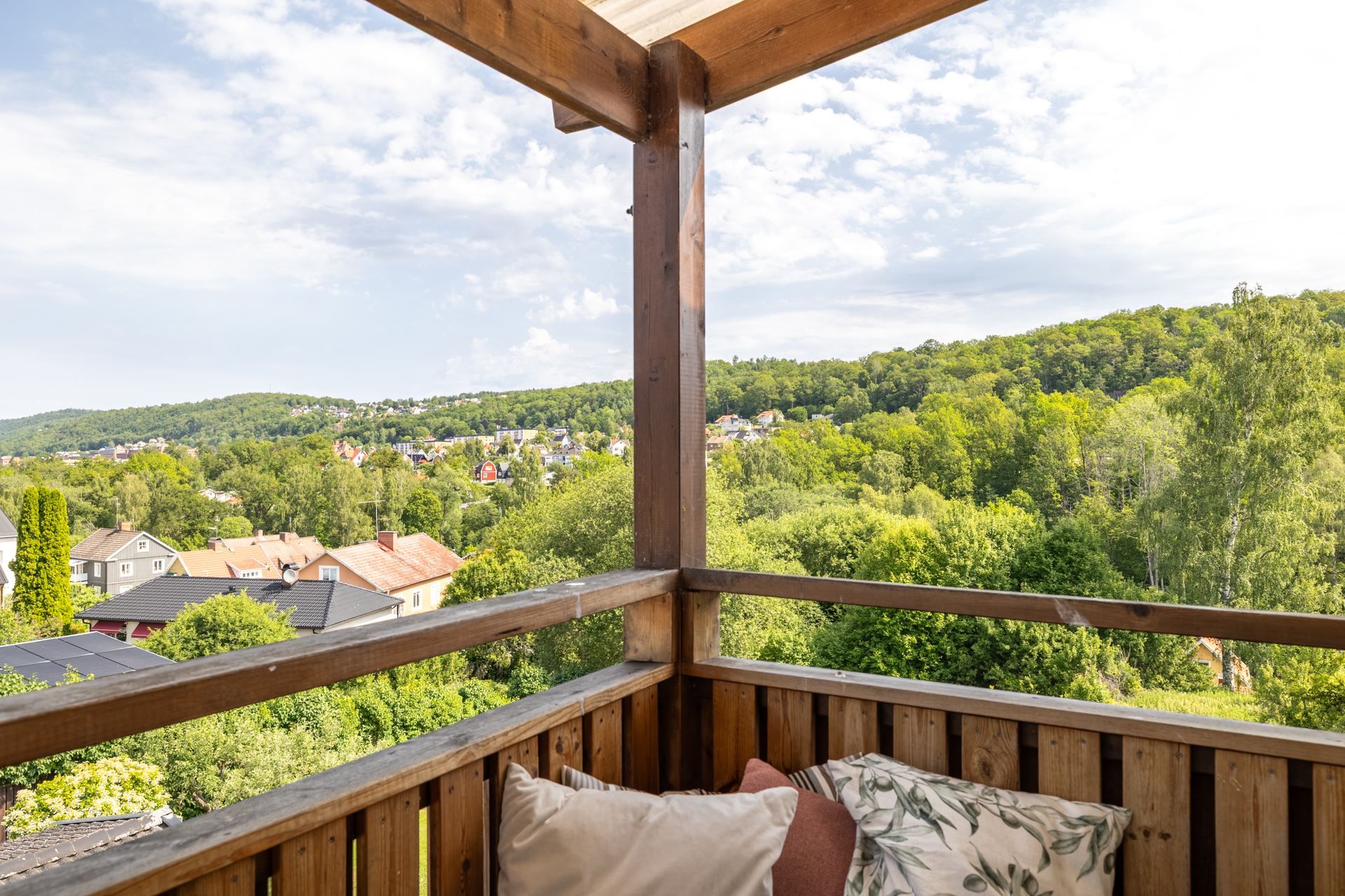 Från vardagsrummet når du den rymliga balkongen i västerläge – en skön plats att slå sig ner efter jobbet. Här har du utsikt över berg, grönområden och en glimt av Vättern. Det är rogivande och vackert – en vy som verkligen gör gott för ögonen.