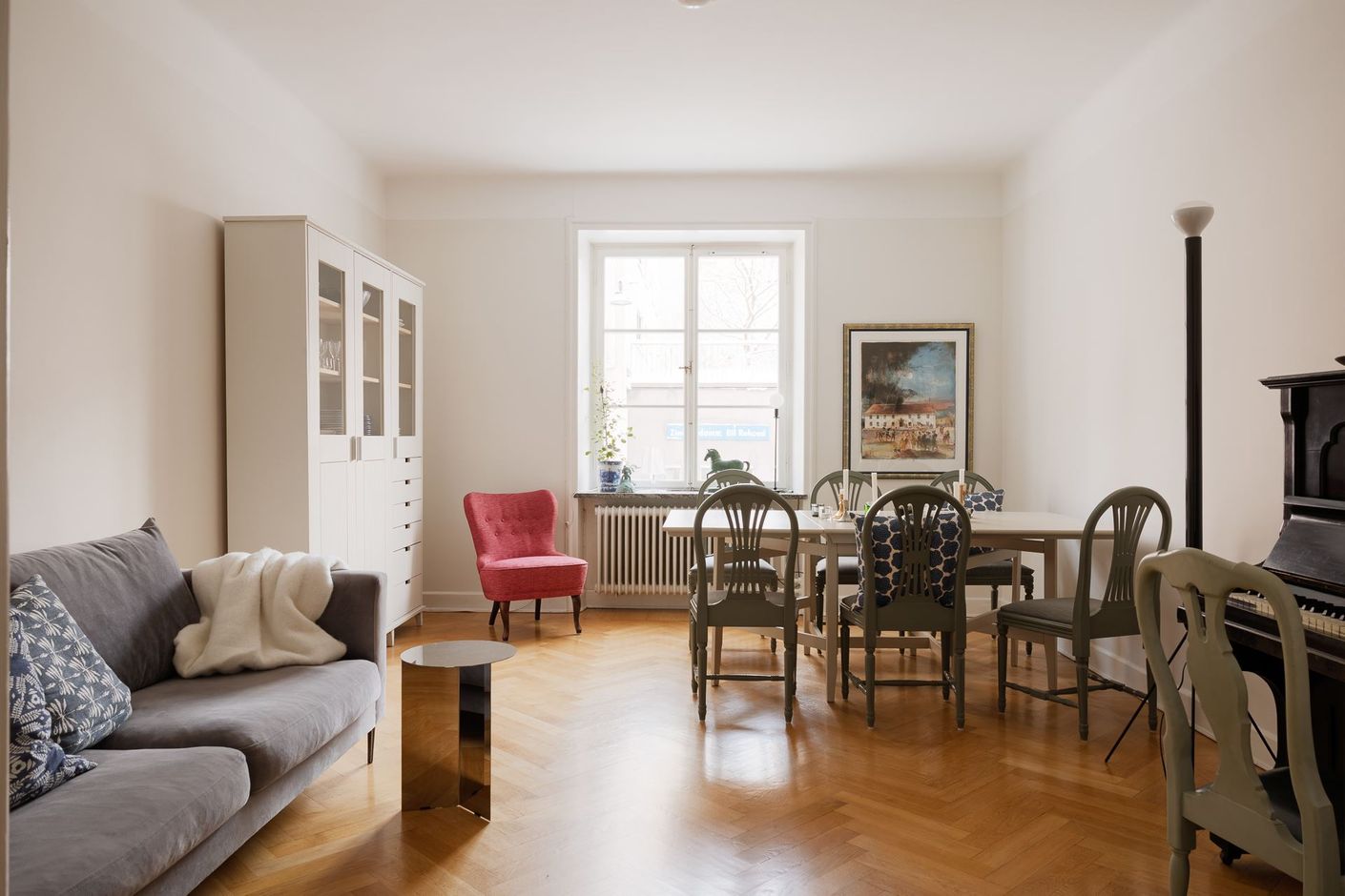 Ljus och charmig 2 rok med stor balkong i bästa söderläge! Bostaden präglas av en genomgående planlösning, härliga sociala ytor och ett nyligen stambytt badrum (2025). De vackra 20-talsdetaljerna – såsom tidstypiska fönster och bevarat serveringsskåp – ger hemmet extra karaktär och värme. Här bor man stillsamt men ändå mycket centralt, med utmärkta kommunikationer och ett stort utbud av restauranger alldeles runt hörnet. Varmt välkomna på visning!