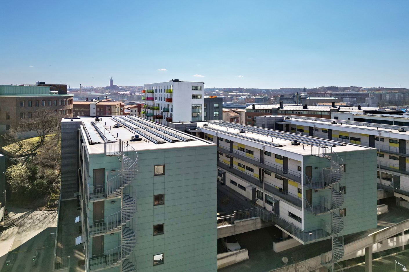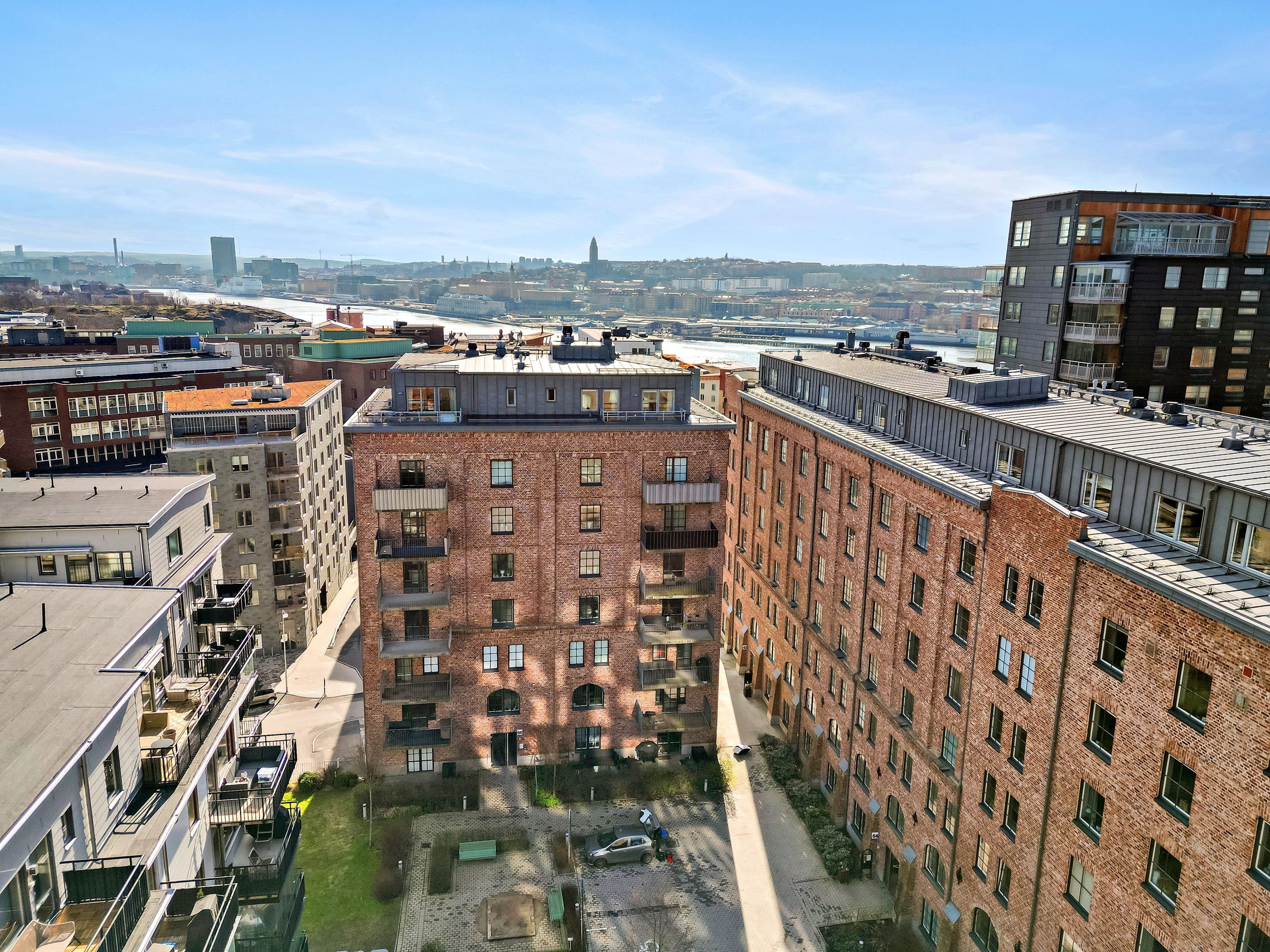 Här bor du på våning 5 av 8 med en utsikt över takåsarna och vidare in mot Göteborgs innerstad – en vy som bör upplevas på plats då det känns betydligt högre upp pga att huset är byggt i suterräng.