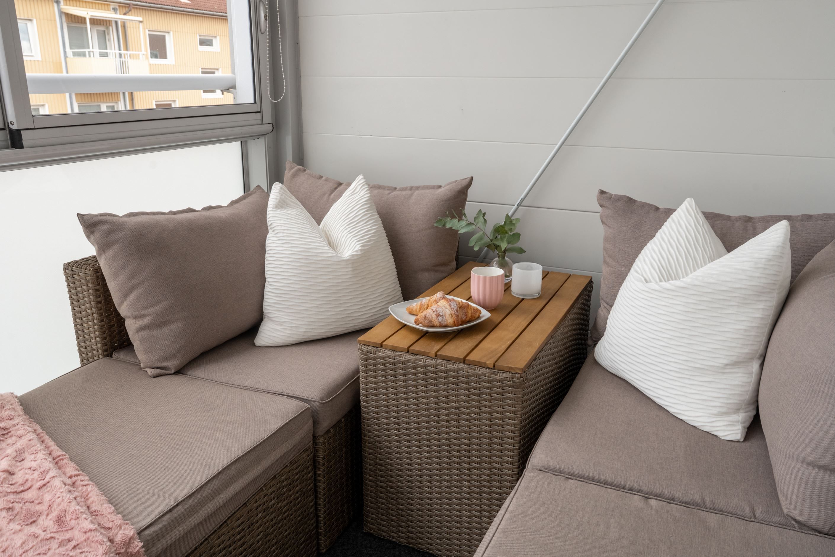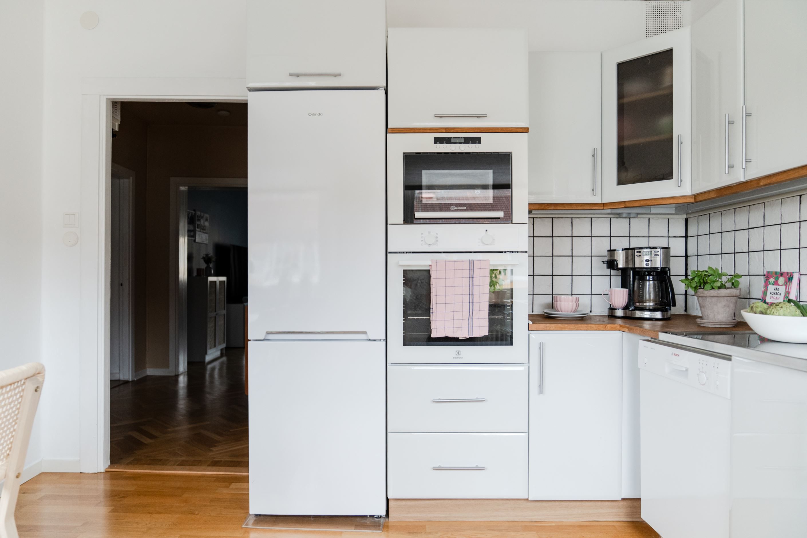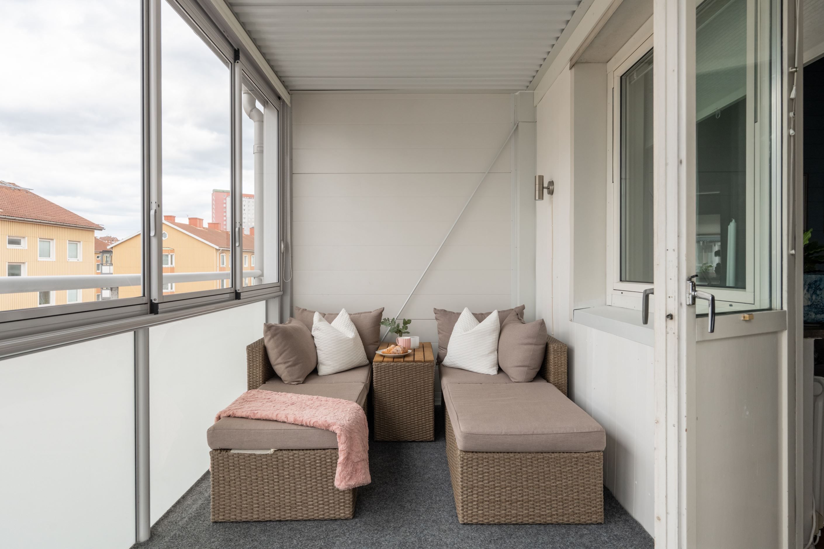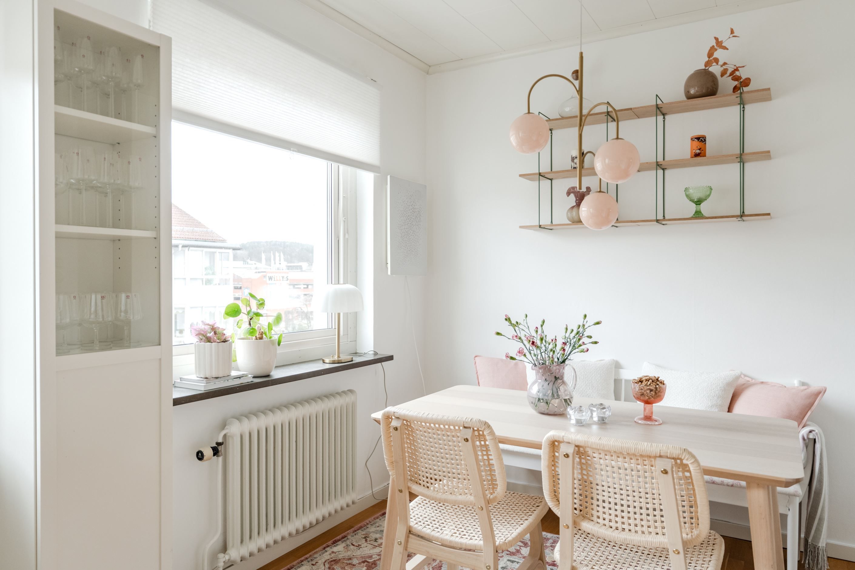 Köket är rymligt och funktionellt med generösa arbetsytor – en naturlig plats för både matlagning och sociala stunder. Stora fönster med fint ljusinsläpp och plats för middagsbord. Vardagsrummet är luftigt och ljust med nyligen uppdaterade väggar i sobra kulörer som förstärker den moderna och avslappnade känslan. God plats för soffa och ev hemmakontor. Härifrån nås den inglasade balkongen – en stillsam plats som fungerar som en extra liten oas större delen av året.