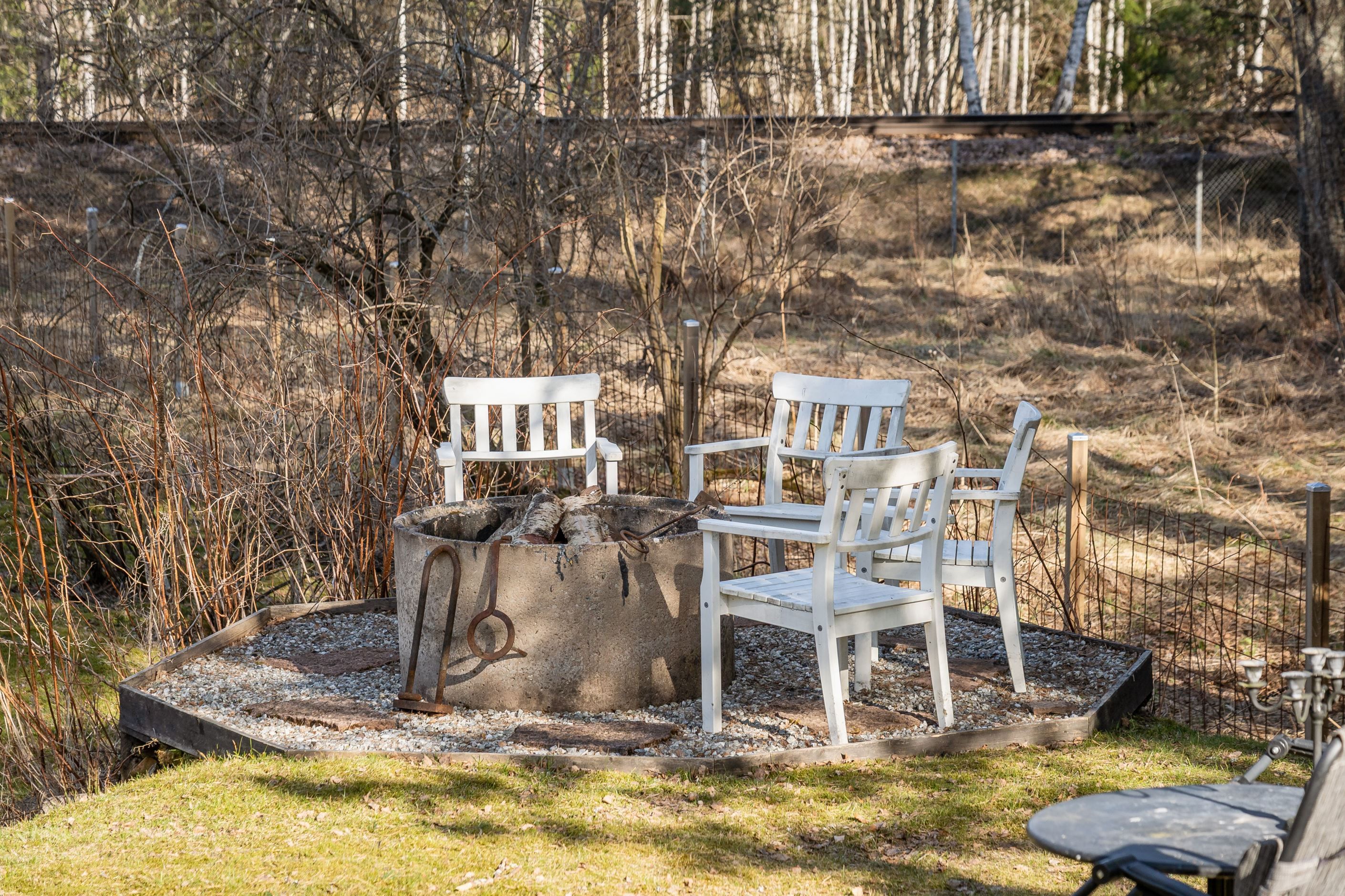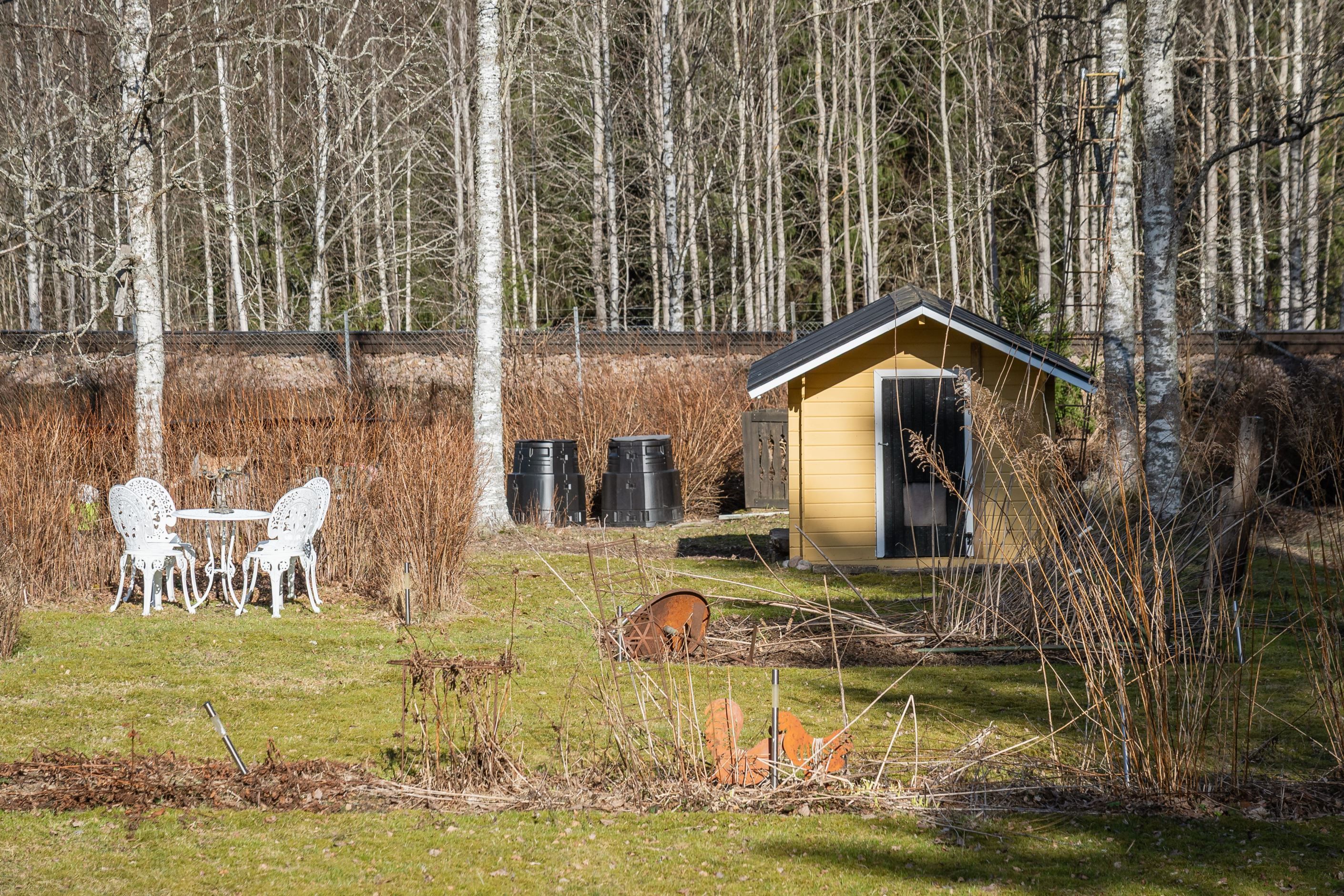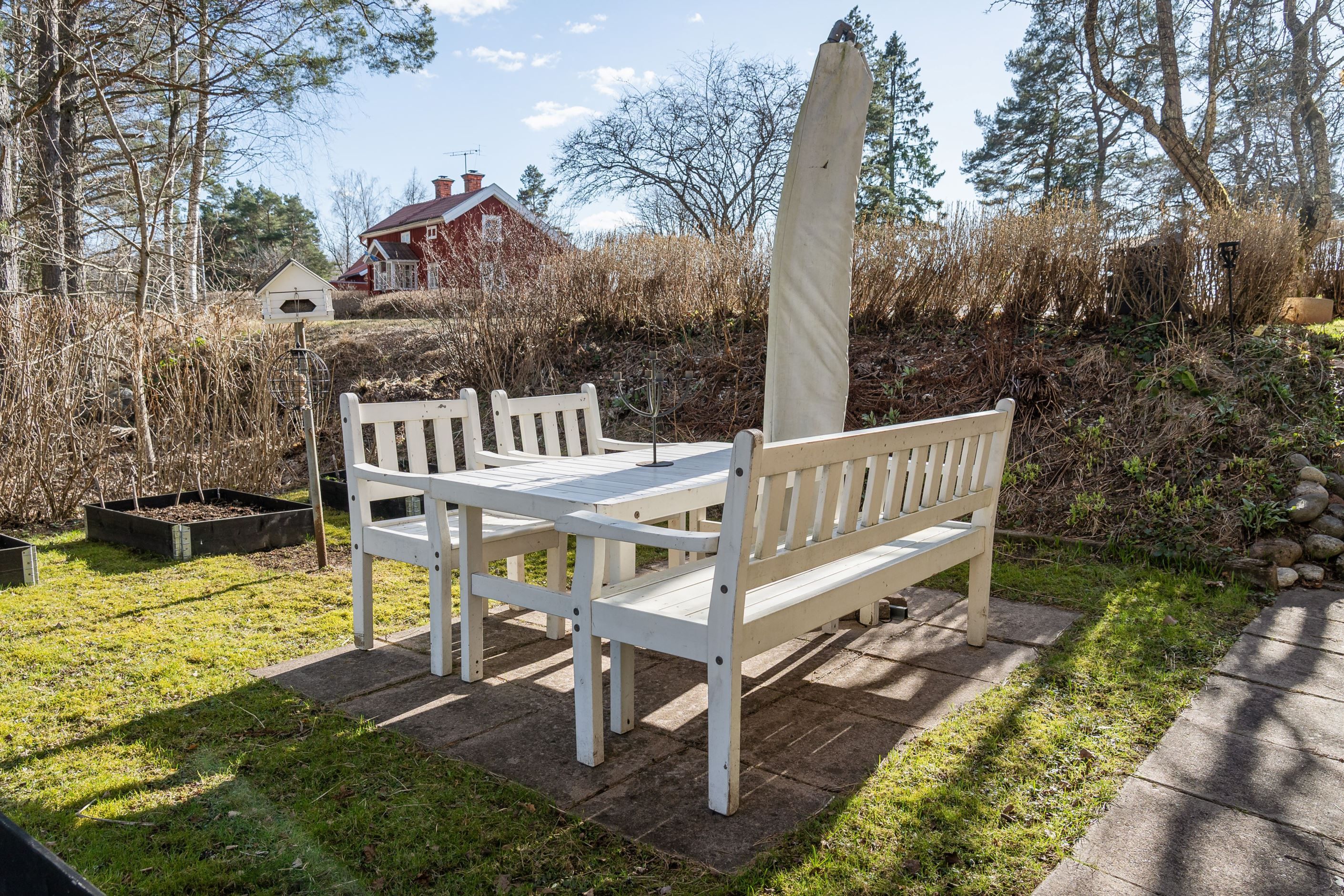 Trädgården är en grön oas – uppvuxen, levande och rik på växter, träd och bärbuskar. Här finns flera naturliga rum att vistas i – uteplatser, grillplats samt flertalet anlagda odlingsytor. Det är en trädgård att både njuta av, rå om och vidareutveckla för den som har intresse. Grusad nyanlagd parkeringsplats och nedfart.