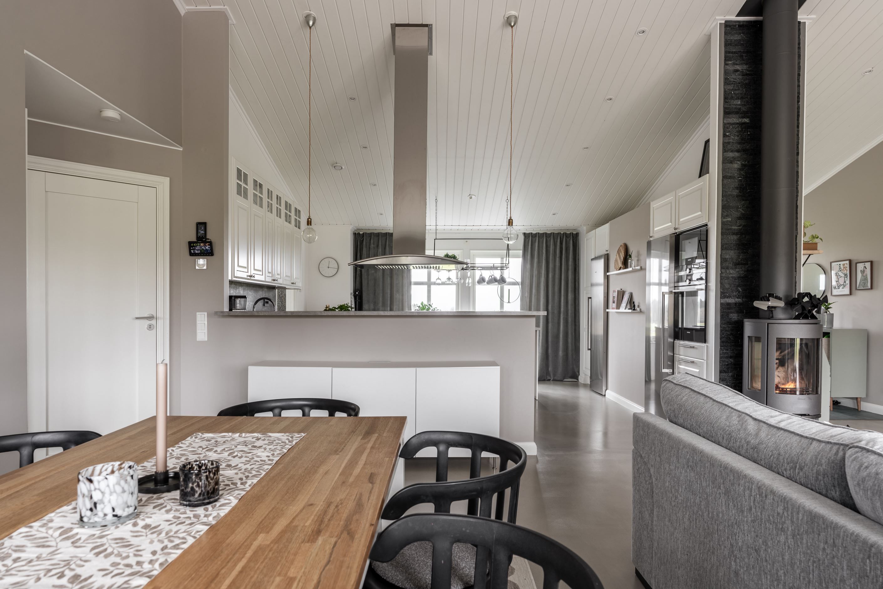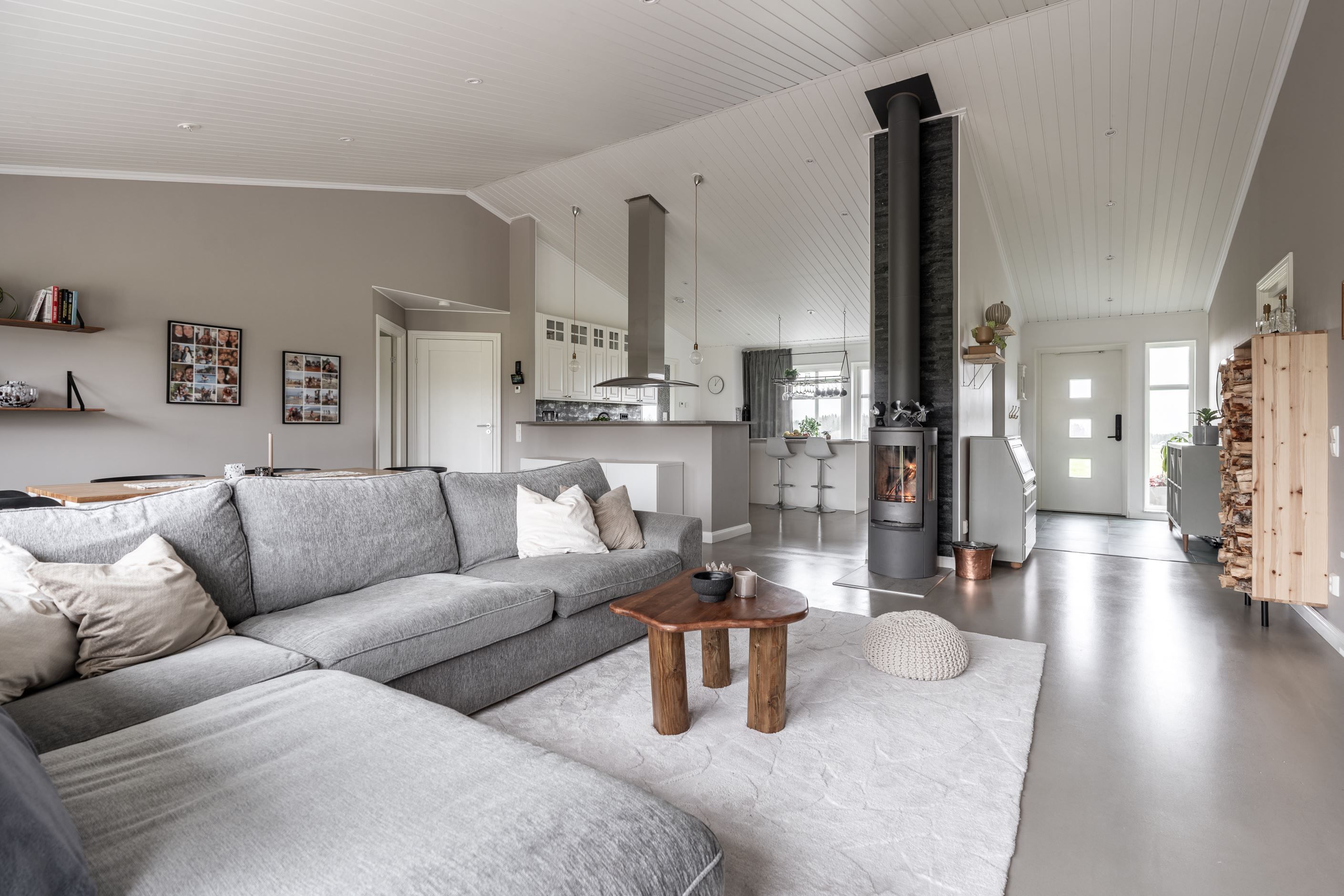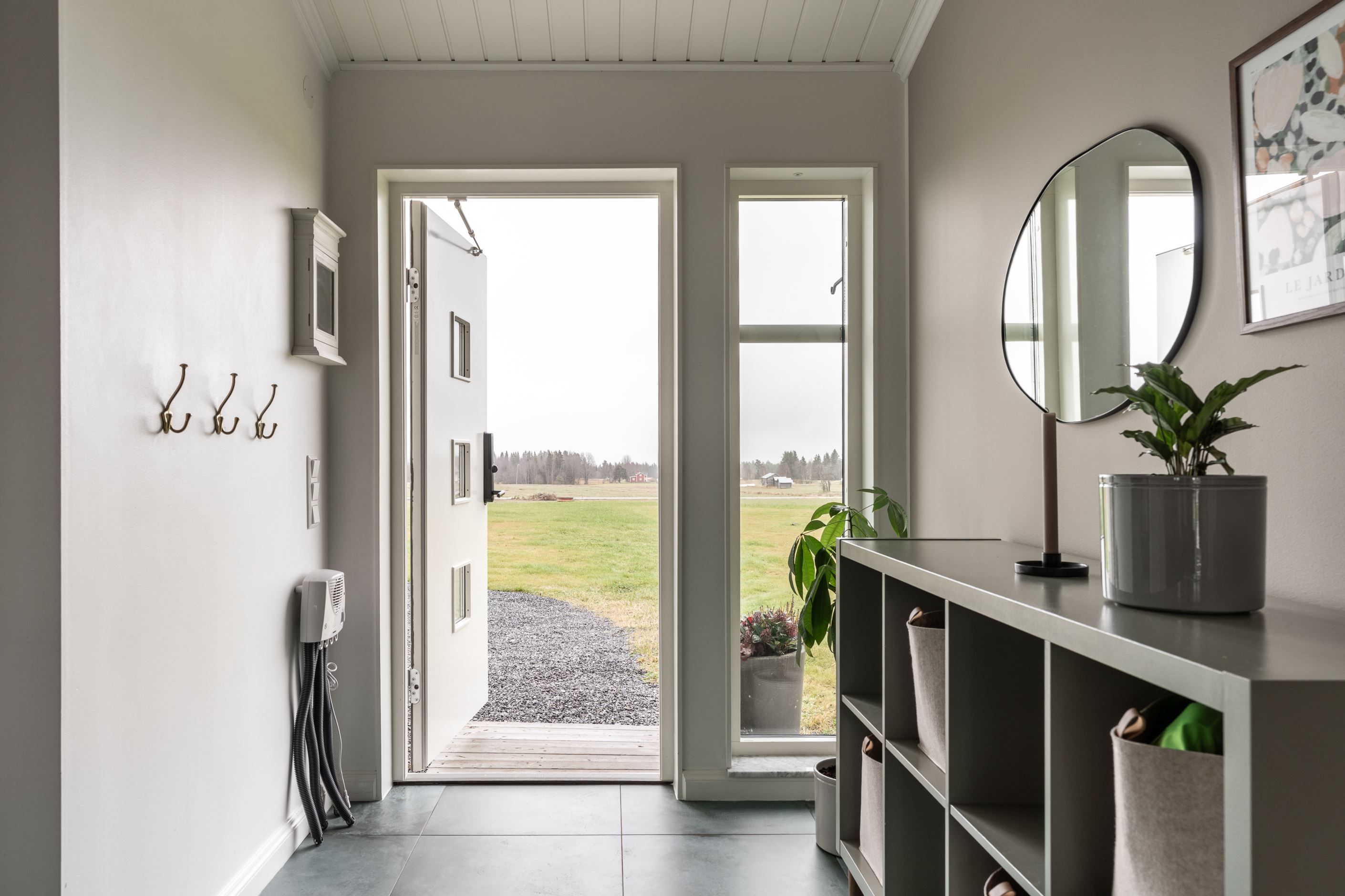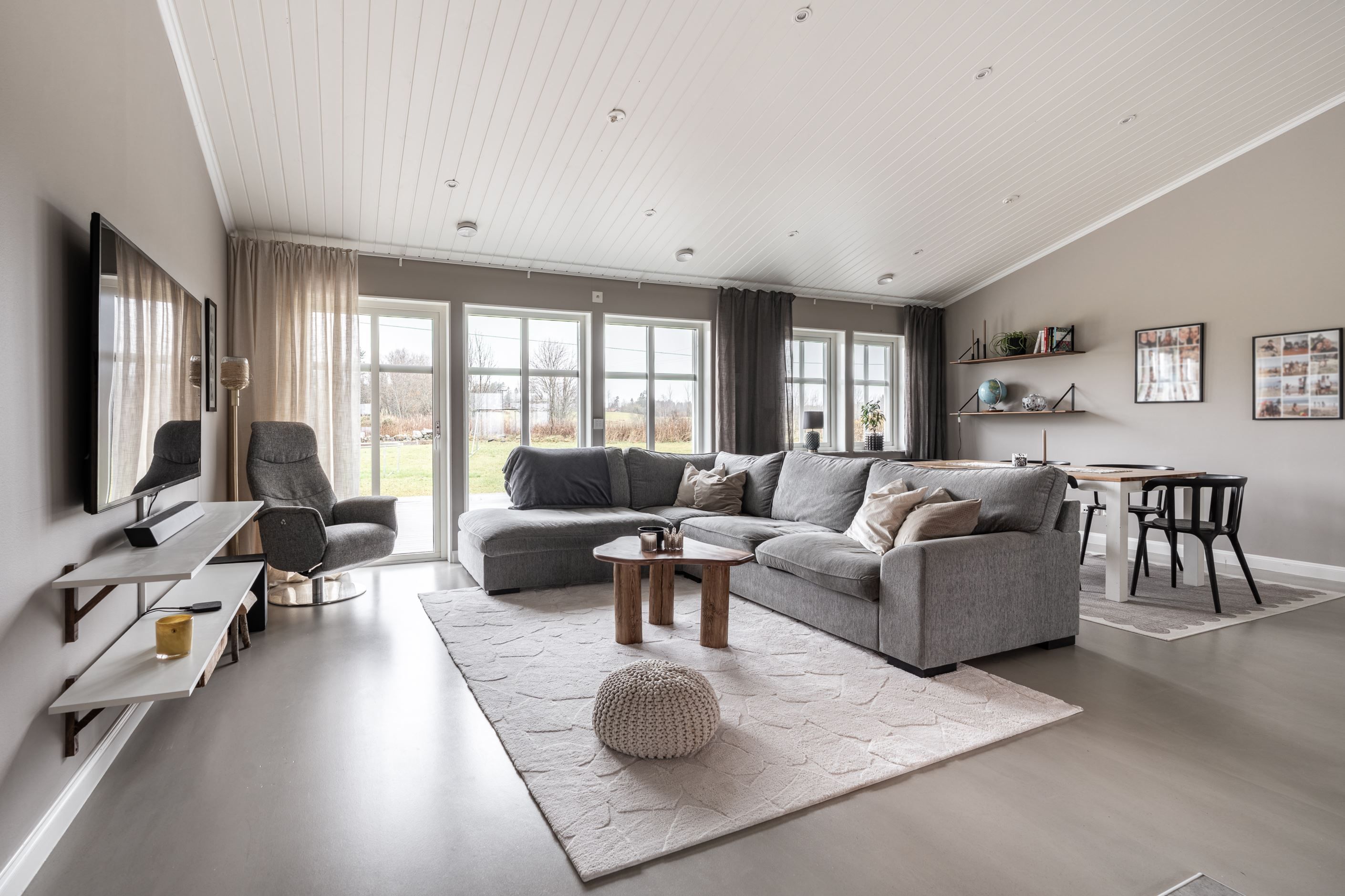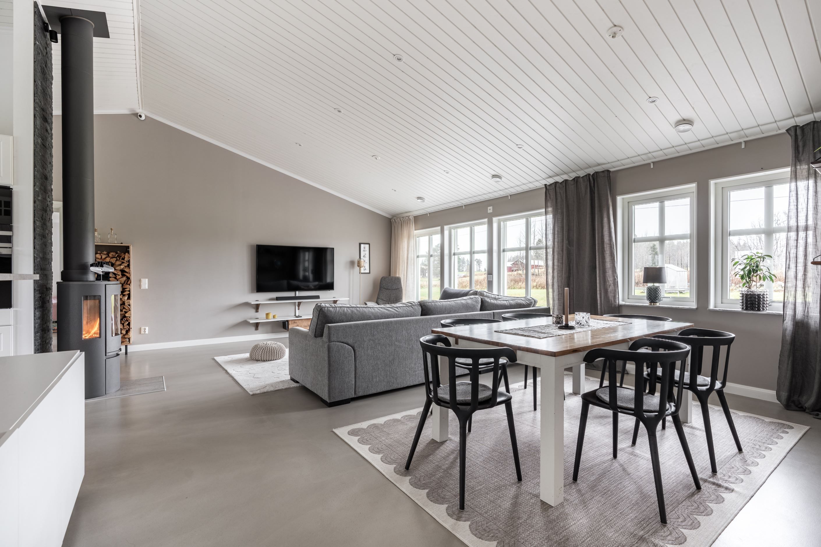 Redan i hallen sätter huset standarden med stilrena färgval och moderna detaljer – en interiör som ligger helt rätt i tiden. Vattenburen golvvärme ger skön komfort året runt, medan de stora fönsterpartierna och den generösa takhöjden fyller kök och vardagsrum med ljus och skapar en härlig rymd. Den öppna planlösningen inbjuder till både vardagsmys och festliga middagar, och under sommarhalvåret blir uteplatsen en naturlig förlängning av hemmet.
