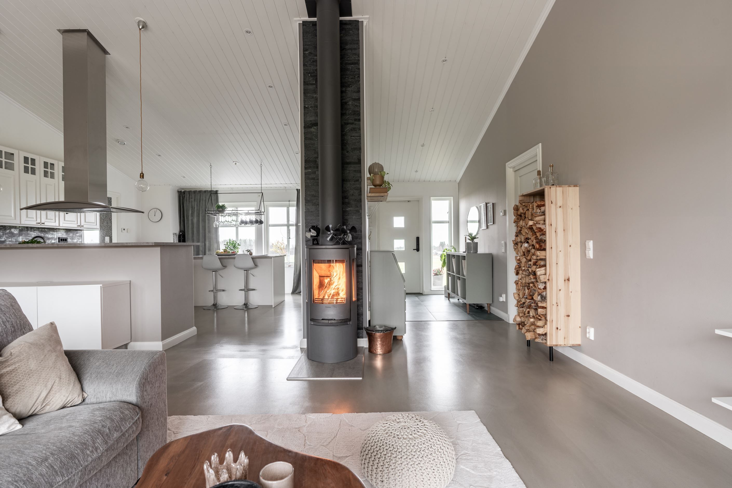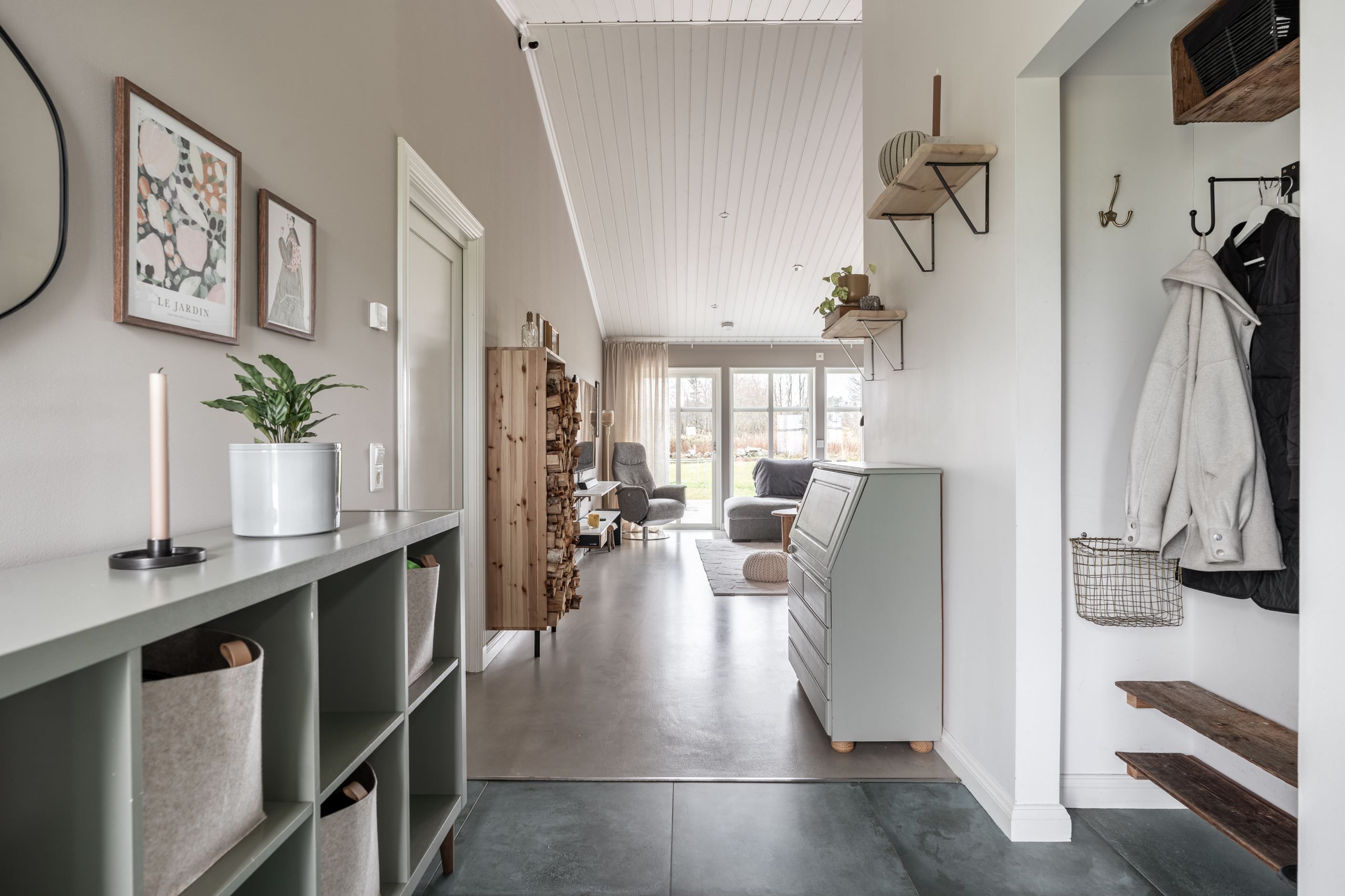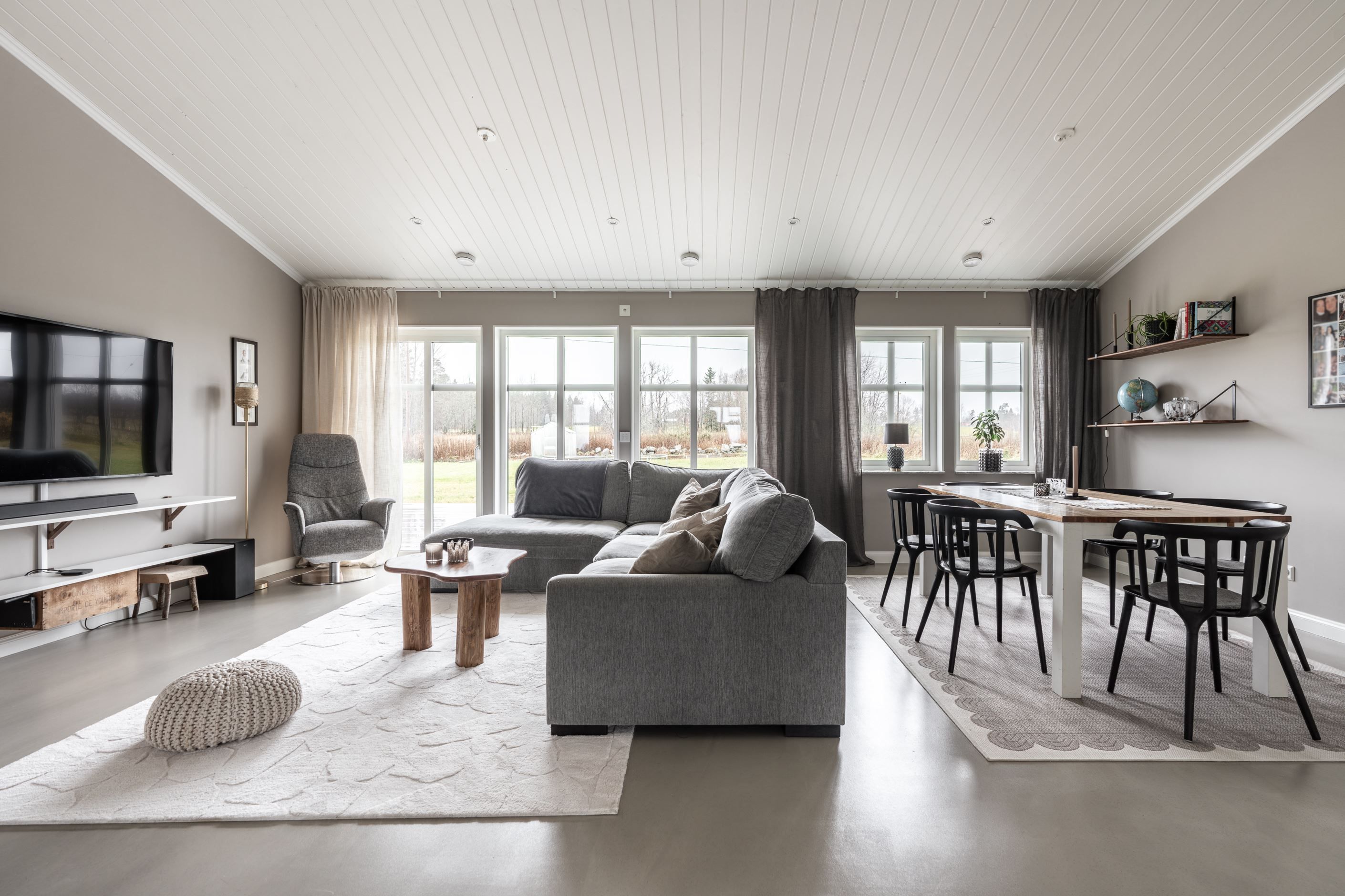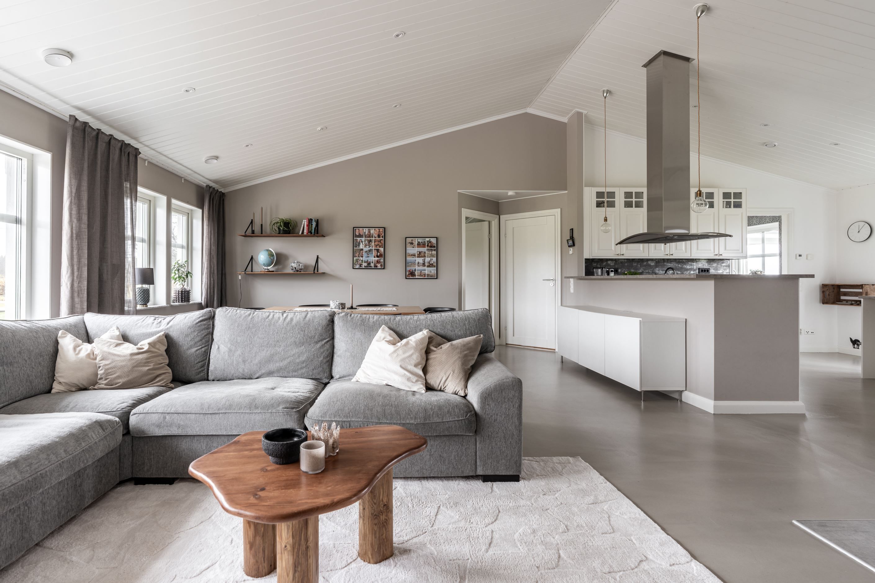 Redan i hallen sätter huset standarden med stilrena färgval och moderna detaljer – en interiör som ligger helt rätt i tiden. Vattenburen golvvärme ger skön komfort året runt, medan de stora fönsterpartierna och den generösa takhöjden fyller kök och vardagsrum med ljus och skapar en härlig rymd. Den öppna planlösningen inbjuder till både vardagsmys och festliga middagar, och under sommarhalvåret blir uteplatsen en naturlig förlängning av hemmet.
