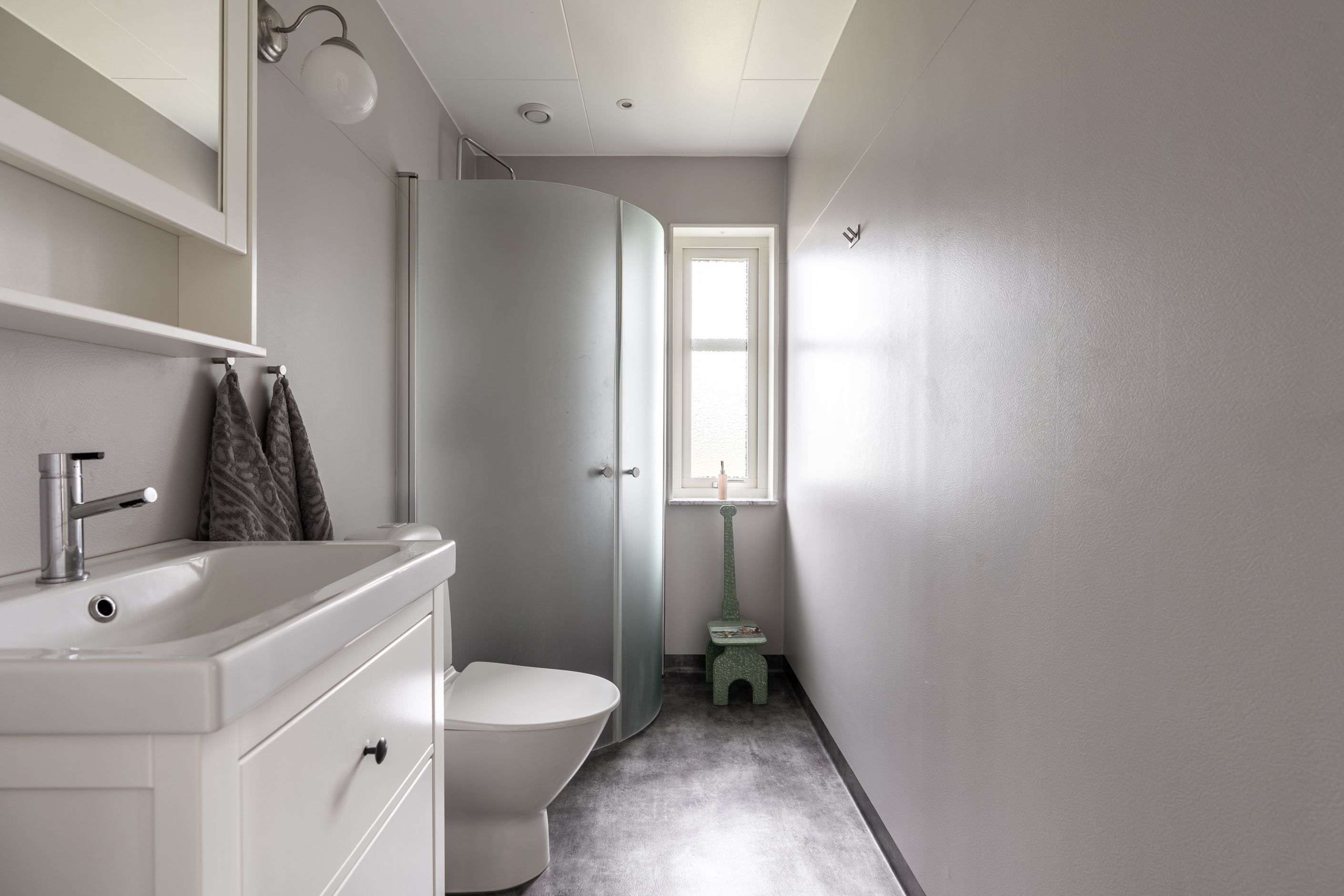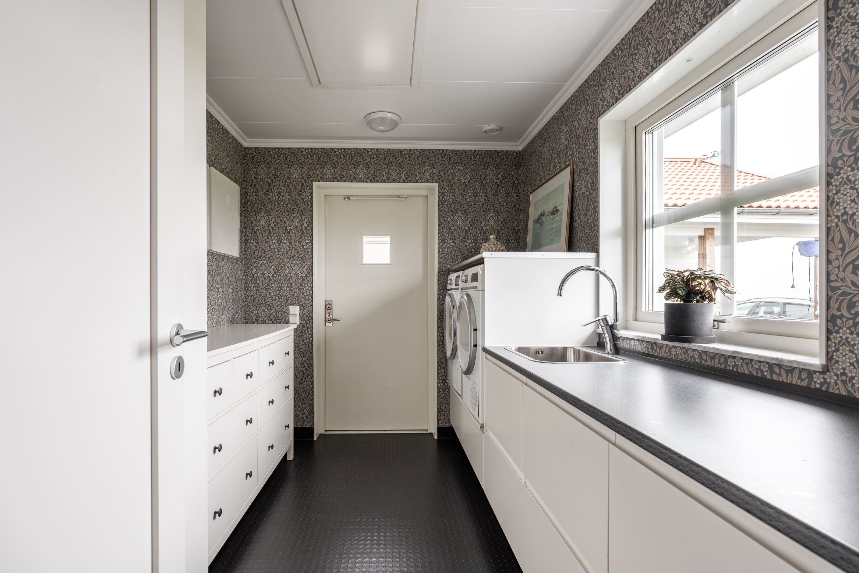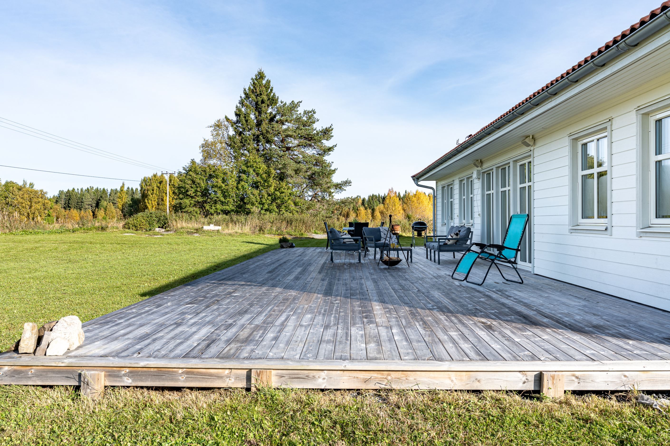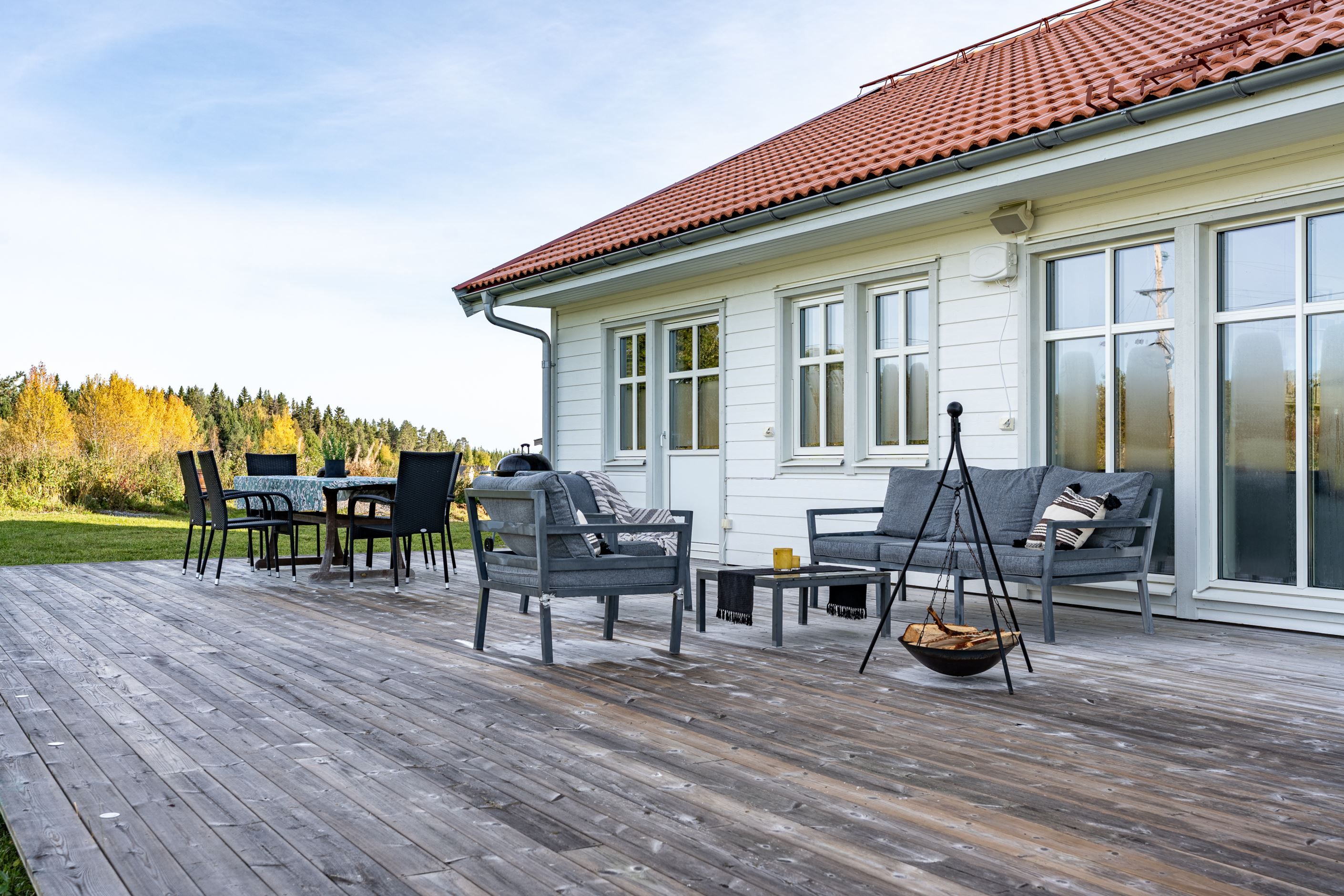 Tvättstugan är rymlig och har en praktisk groventré – perfekt när barnen (eller hunden) dragit in halva trädgården. På sommaren flyttar umgänget ut till det stora trädäcket – en solig oas för grillkvällar, långfrukostar och ljumma kvällar under bar himmel.