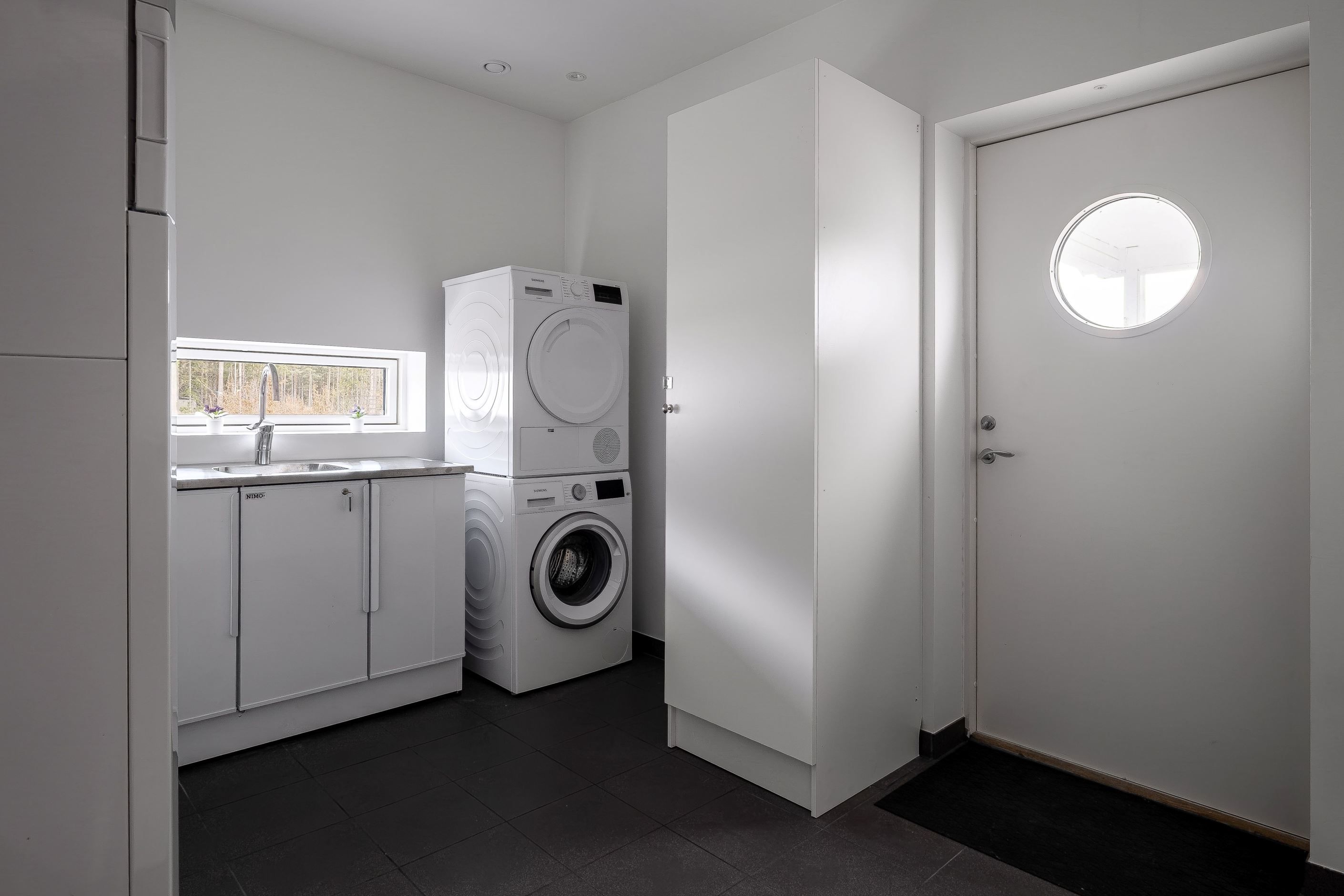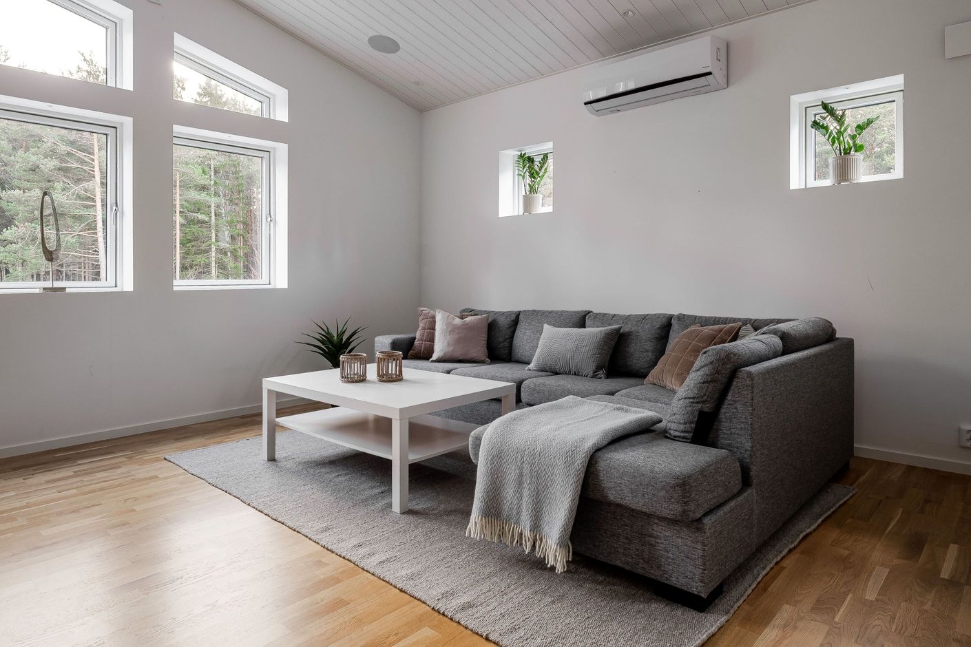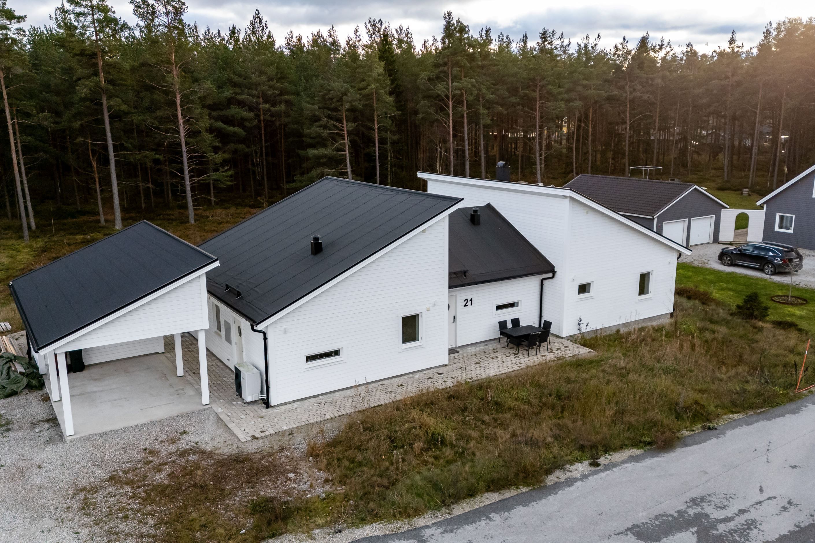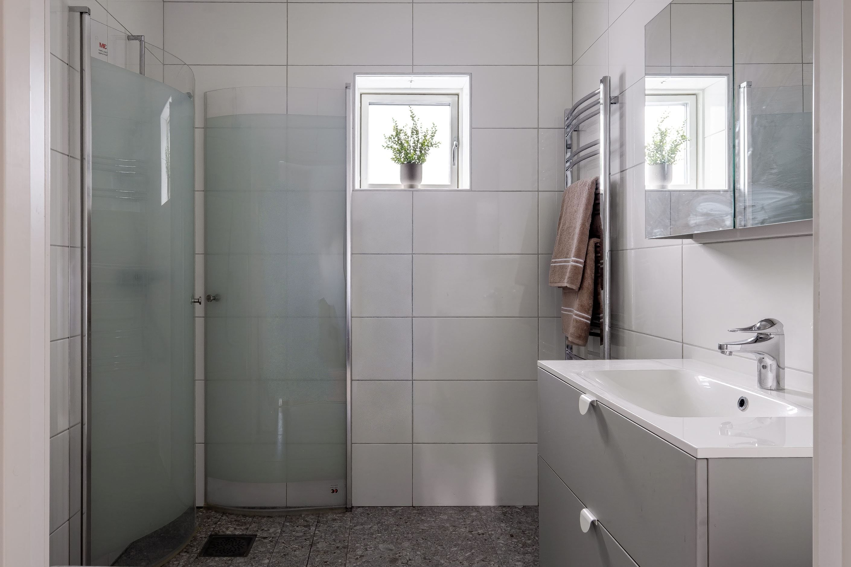 Huset erbjuder fyra bra sovrum som ger gott om plats för både familjemedlemmar och gäster. Den rymliga hallen med klinkergolv är både välkomnande och praktisk, och den stora tvättstugan underlättar vardagens sysslor. Här finns även två badrum – ett med dusch samt ett större badrum med både dusch och badkar, båda smakfullt inredda med kakel och klinker. De stora fönsterpartierna skapar ett generöst ljusinsläpp och en härlig kontakt mellan inne och ute. För avkoppling finns både en mysig tv-hörna och ett trivsamt vardagsrum med plats för hela familjen. Utomhus erbjuder fastigheten en carport med tillhörande förråd för extra förvaring.