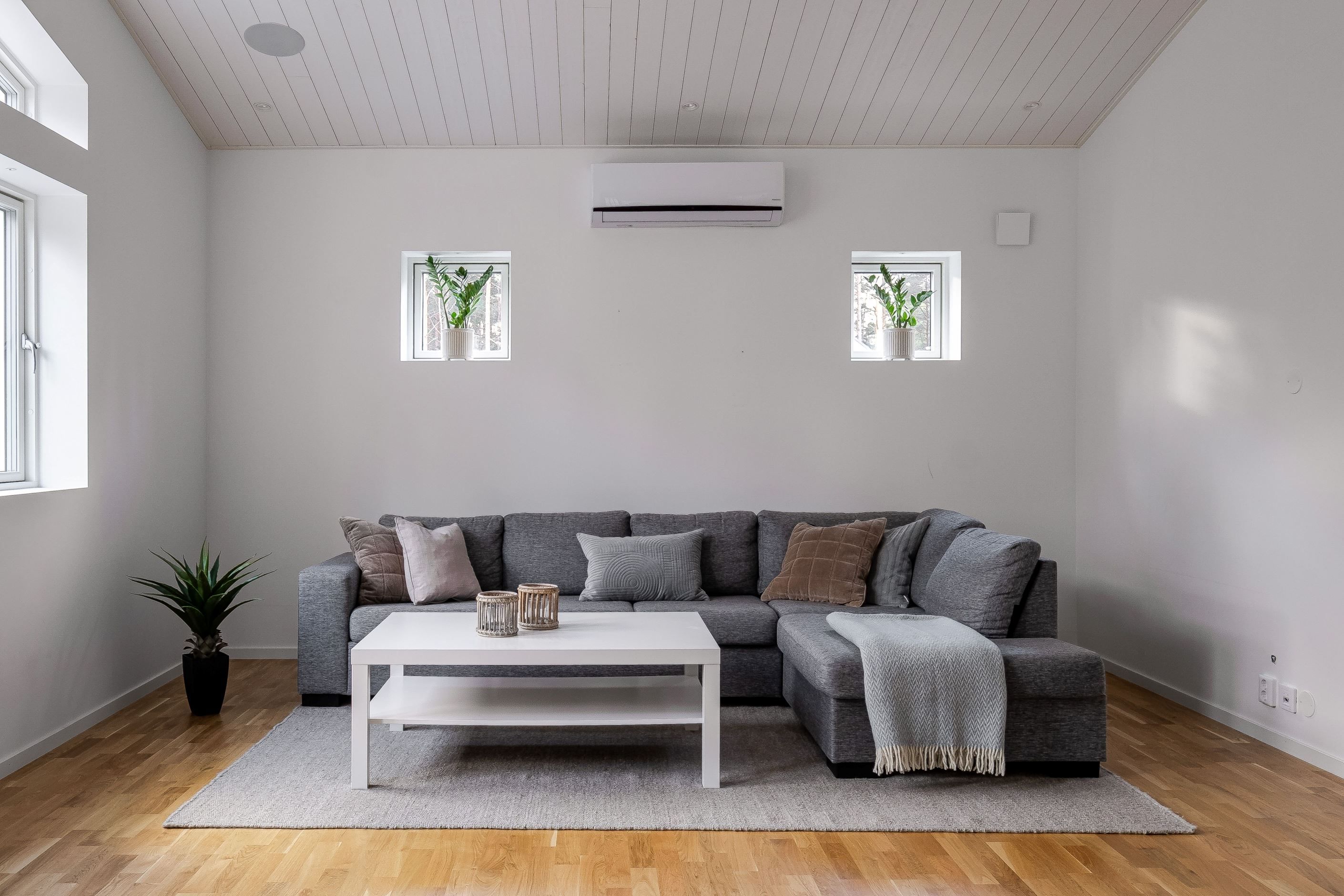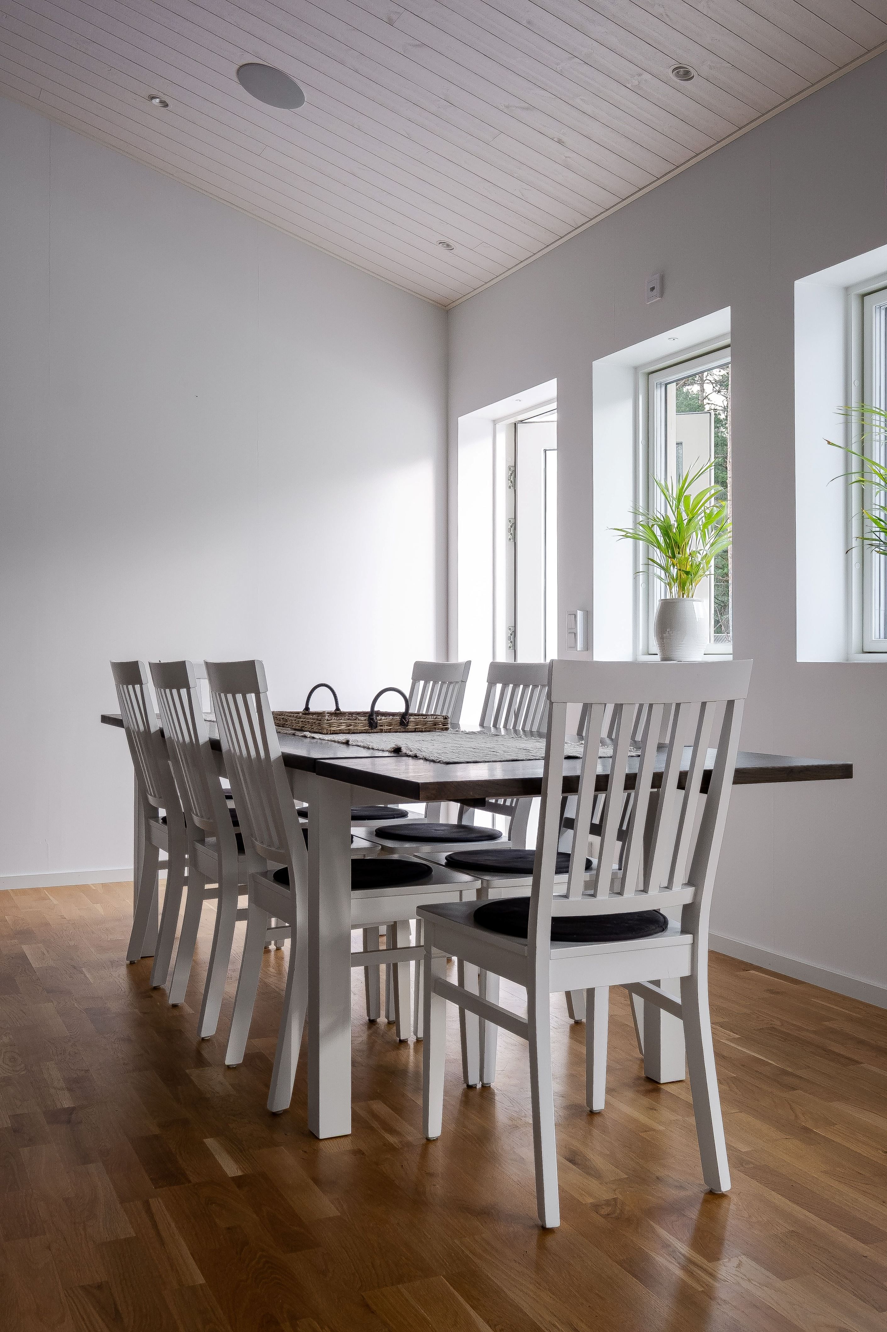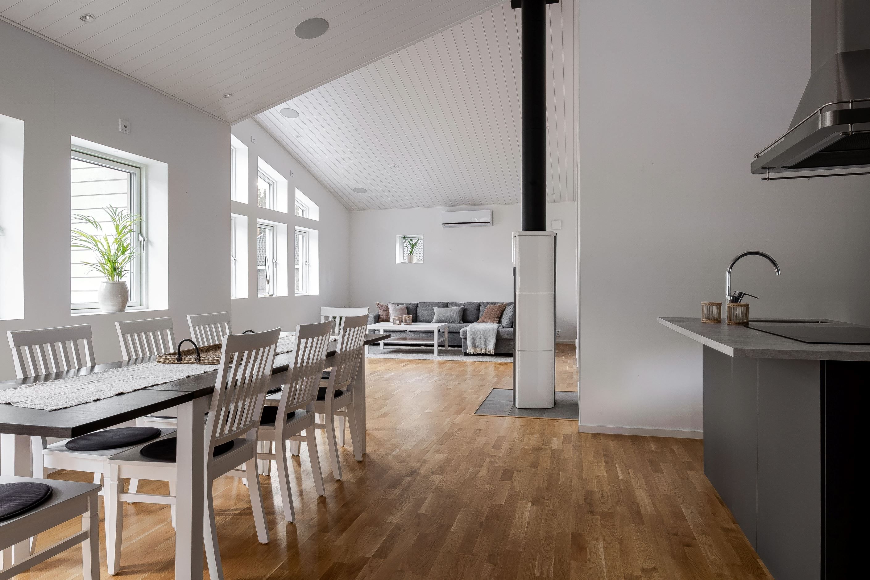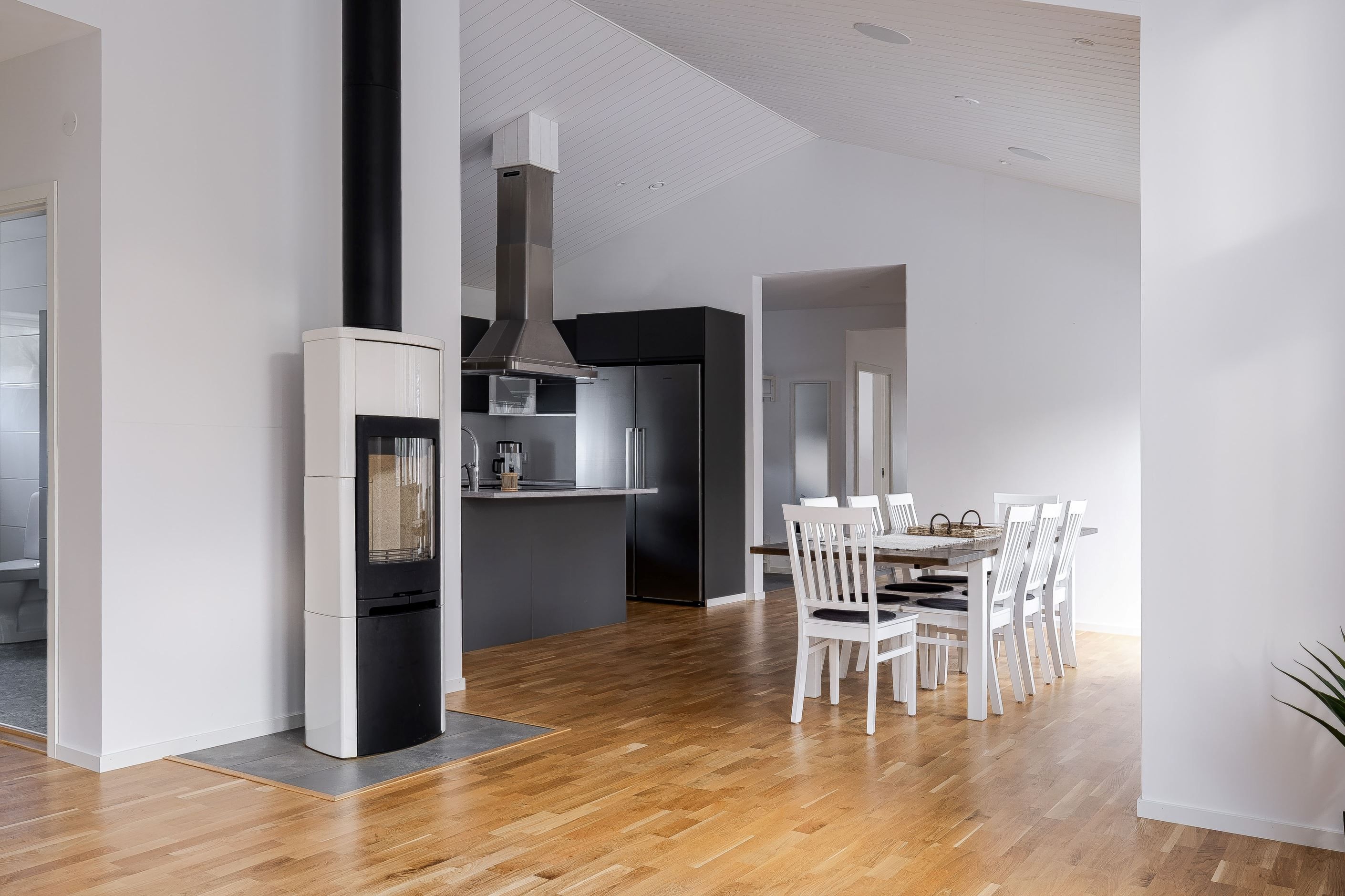 Interiören präglas av fint parkettgolv och vitmålade väggar som ger ett ljust och fräscht intryck, kompletterat av paneltak med infällda spotlights och högtalare som höjer både känsla och funktion. Det luftiga ryggåstaket förstärker rymden ytterligare. Den öppna planlösningen mellan kök och vardagsrum är inbjudande och blir hemmets naturliga samlingspunkt, här finns plats för många och långa middagsstunder. I köket finns en praktisk köksö med häll och fläkt, grå köksluckor och laminatbänk. Här finns modern utrustning med kyl och frys från Samsung samt diskmaskin, mikro, ugn, häll och fläkt från IKEA.