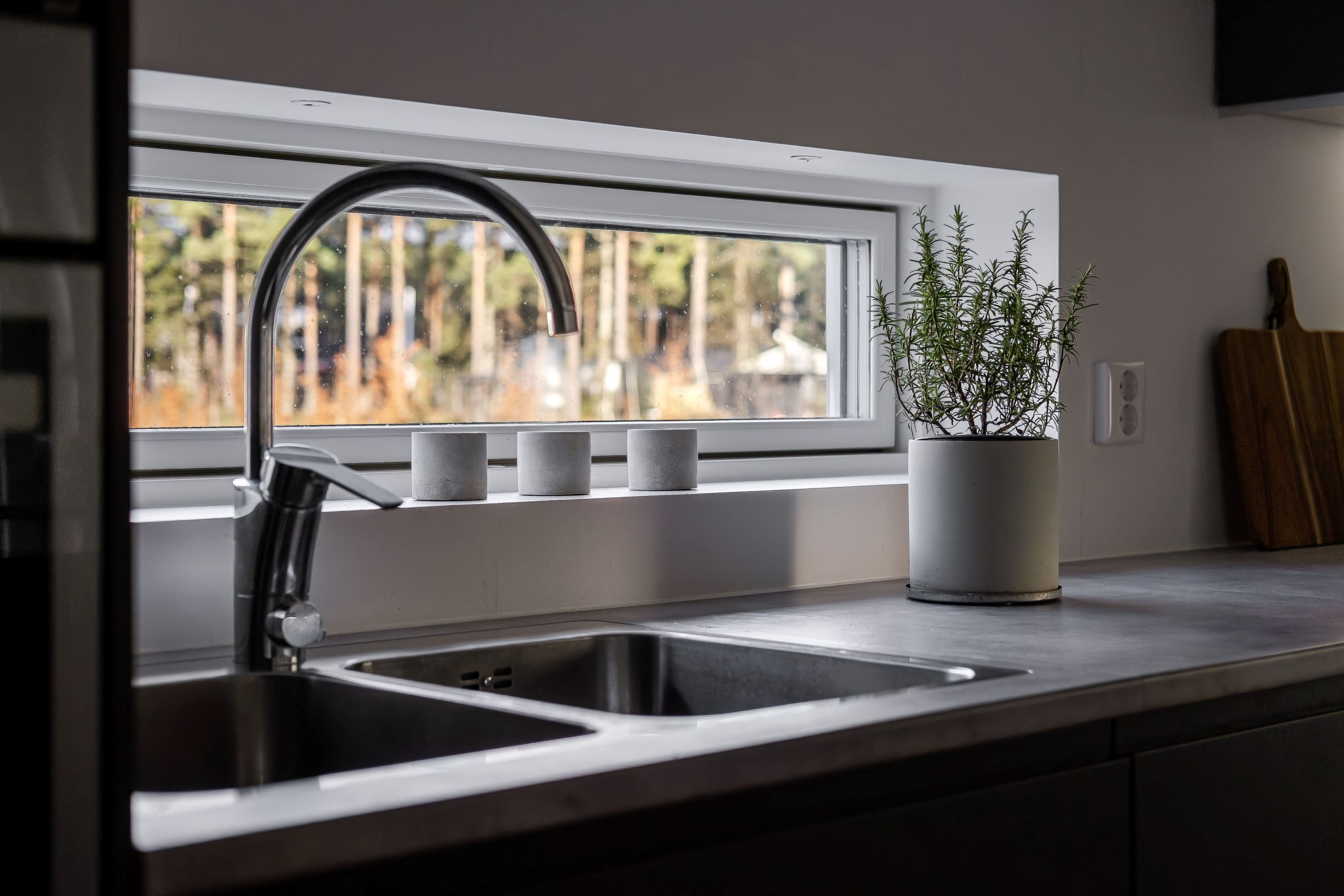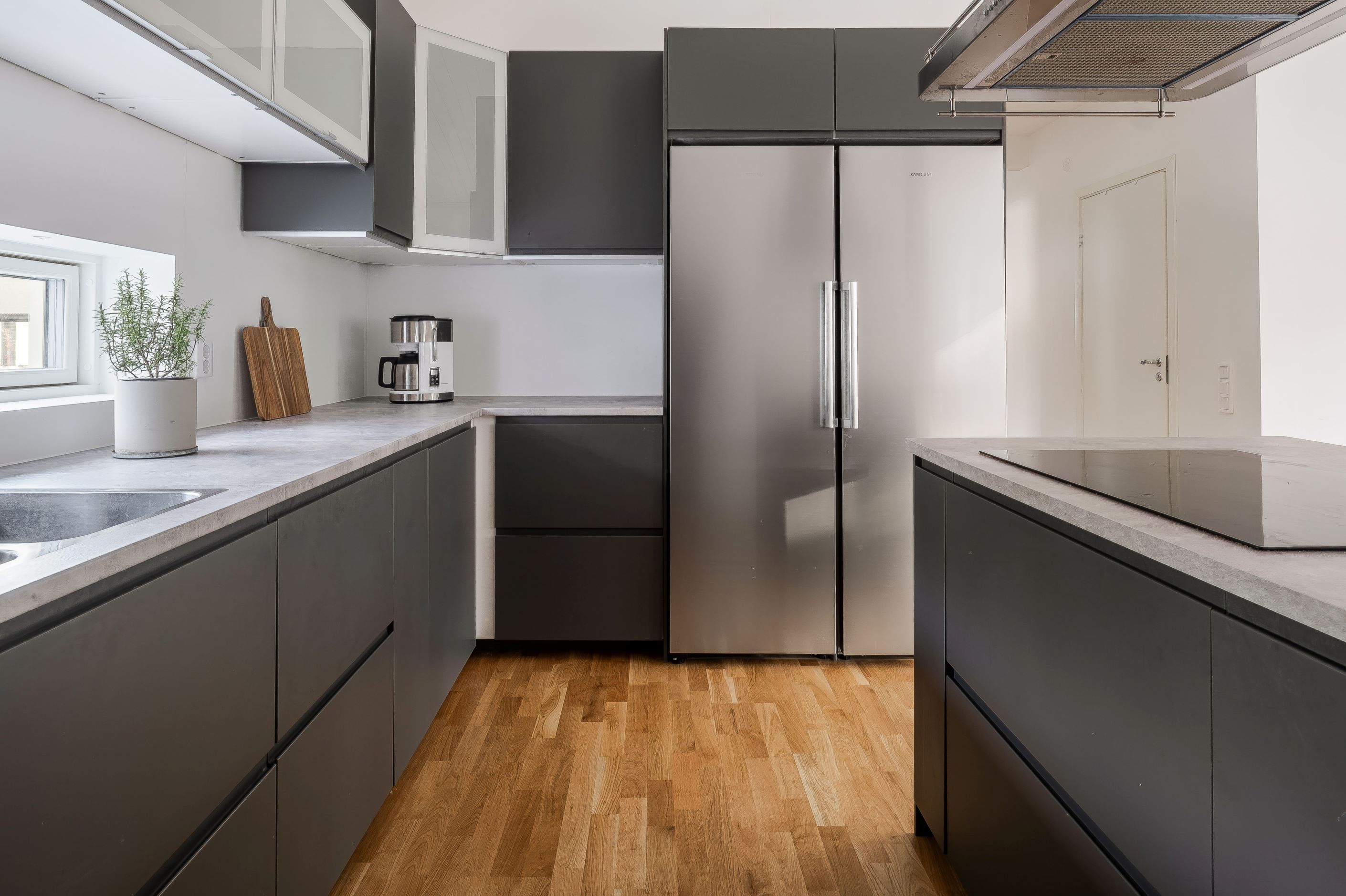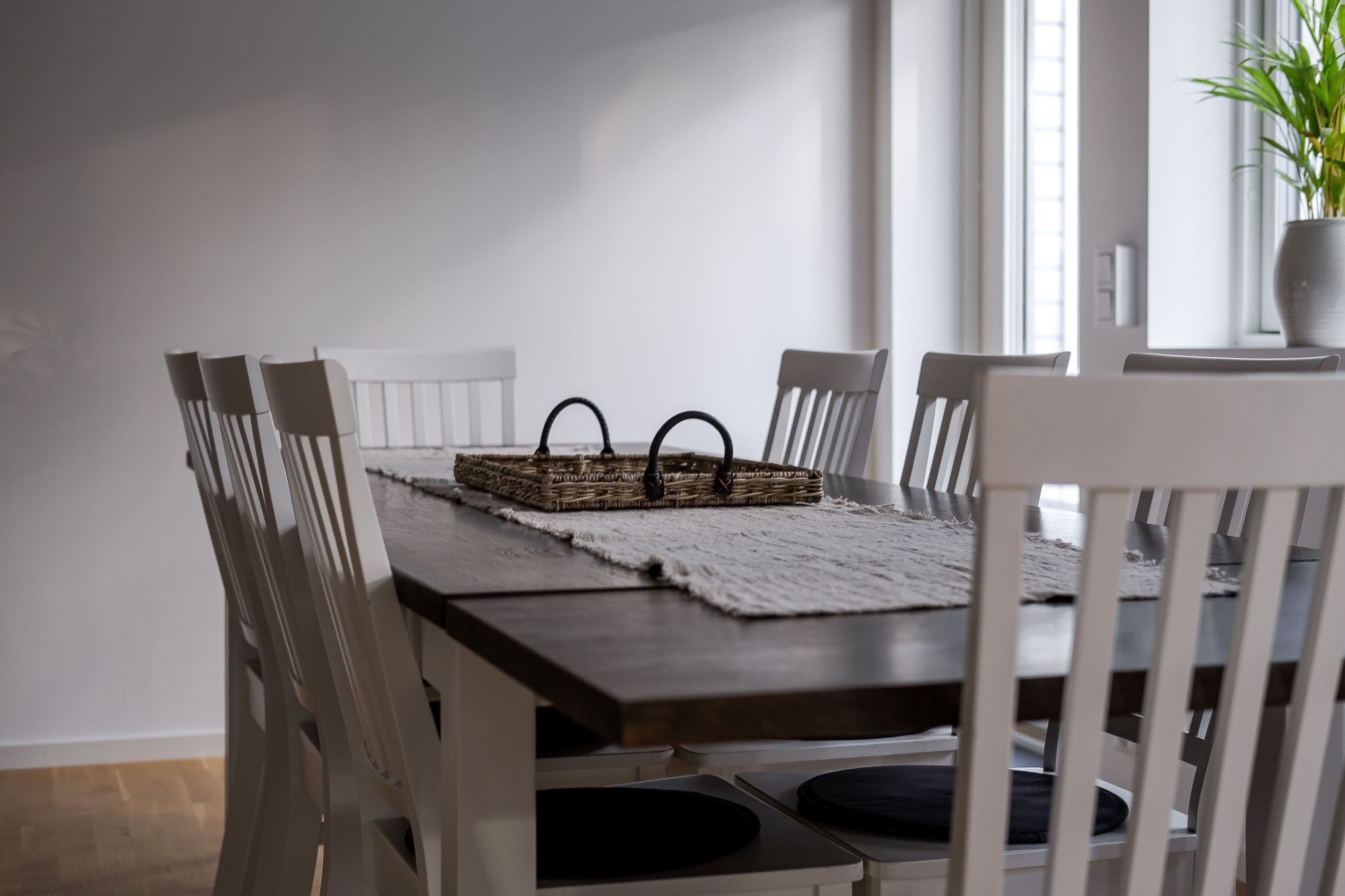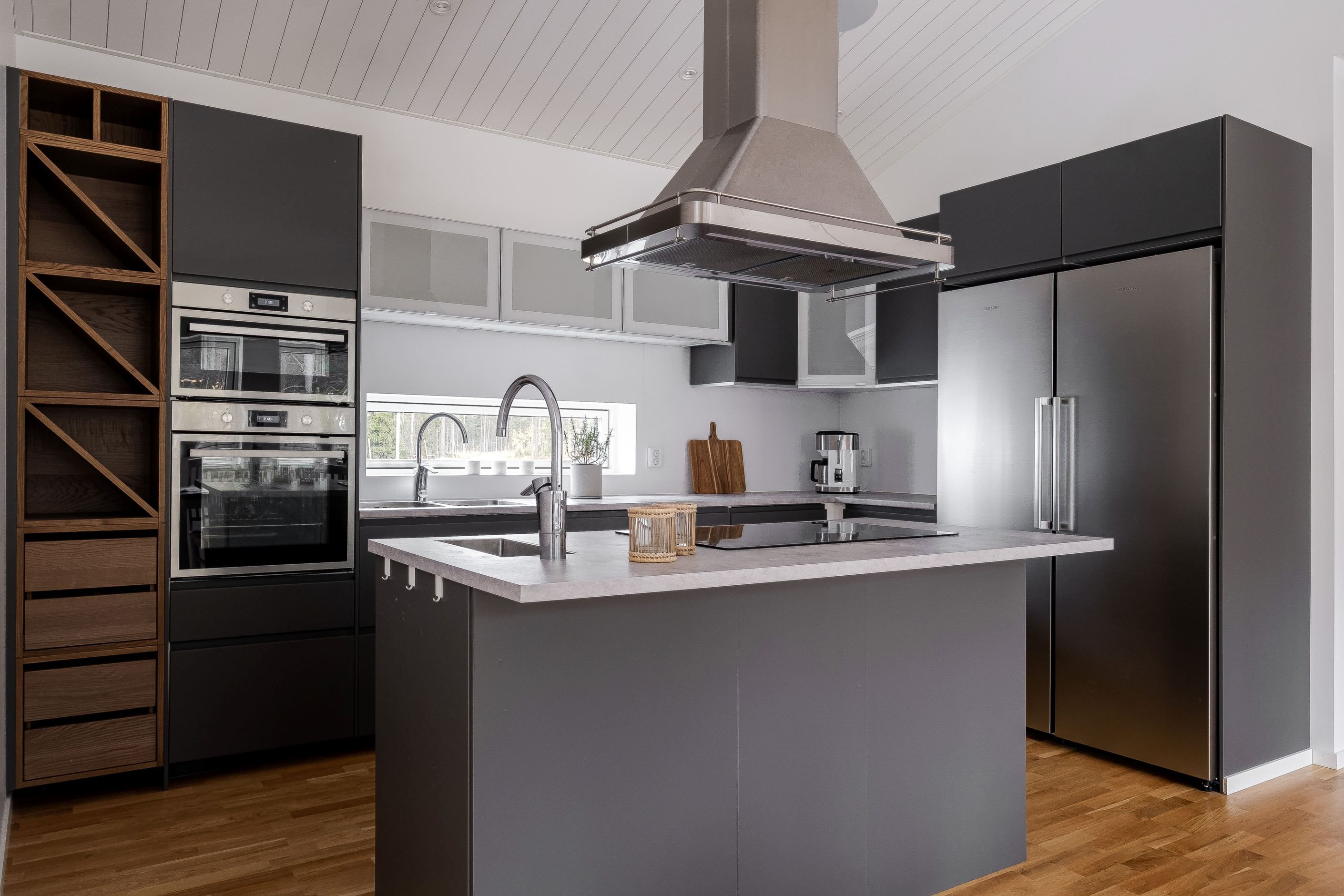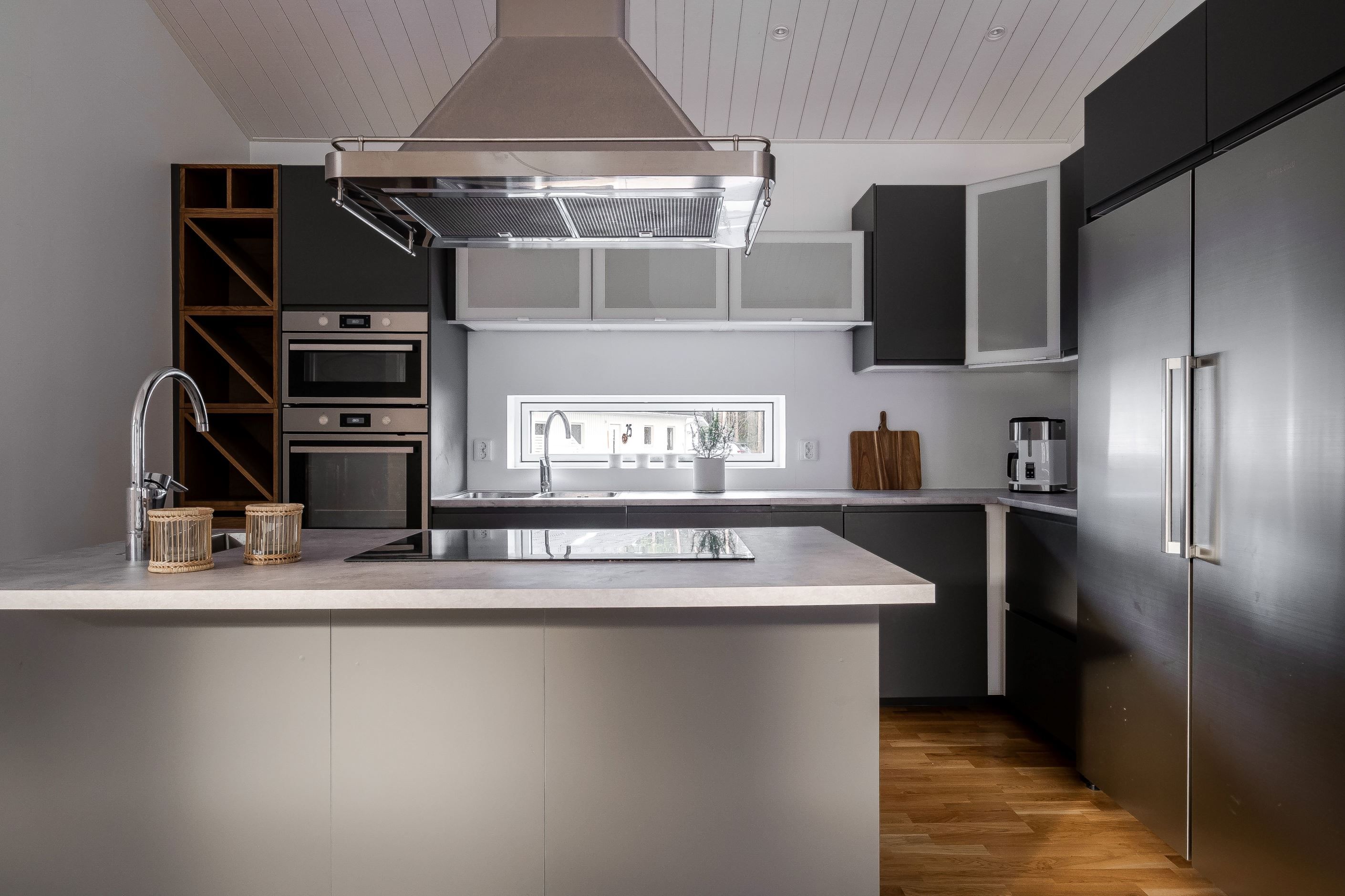 Interiören präglas av fint parkettgolv och vitmålade väggar som ger ett ljust och fräscht intryck, kompletterat av paneltak med infällda spotlights och högtalare som höjer både känsla och funktion. Det luftiga ryggåstaket förstärker rymden ytterligare. Den öppna planlösningen mellan kök och vardagsrum är inbjudande och blir hemmets naturliga samlingspunkt, här finns plats för många och långa middagsstunder. I köket finns en praktisk köksö med häll och fläkt, grå köksluckor och laminatbänk. Här finns modern utrustning med kyl och frys från Samsung samt diskmaskin, mikro, ugn, häll och fläkt från IKEA.