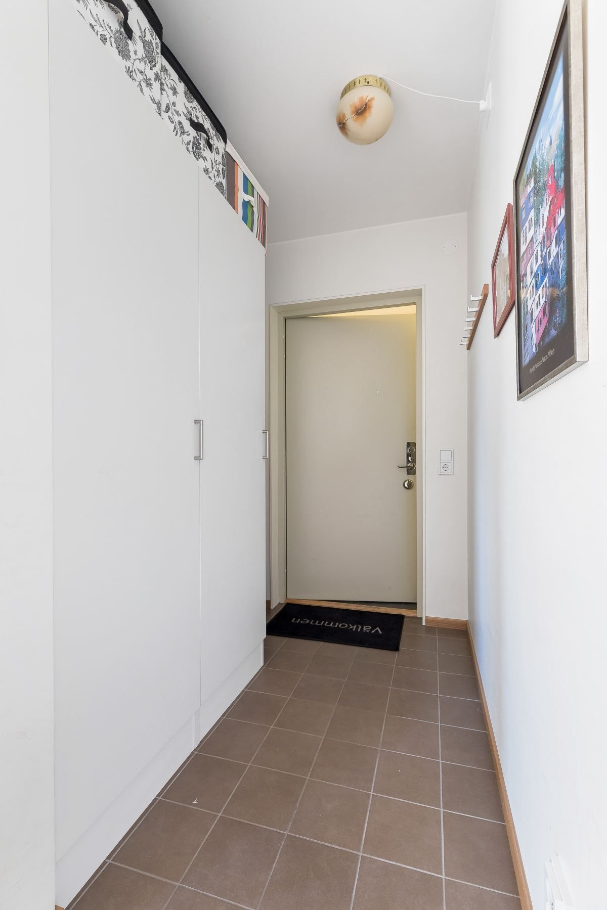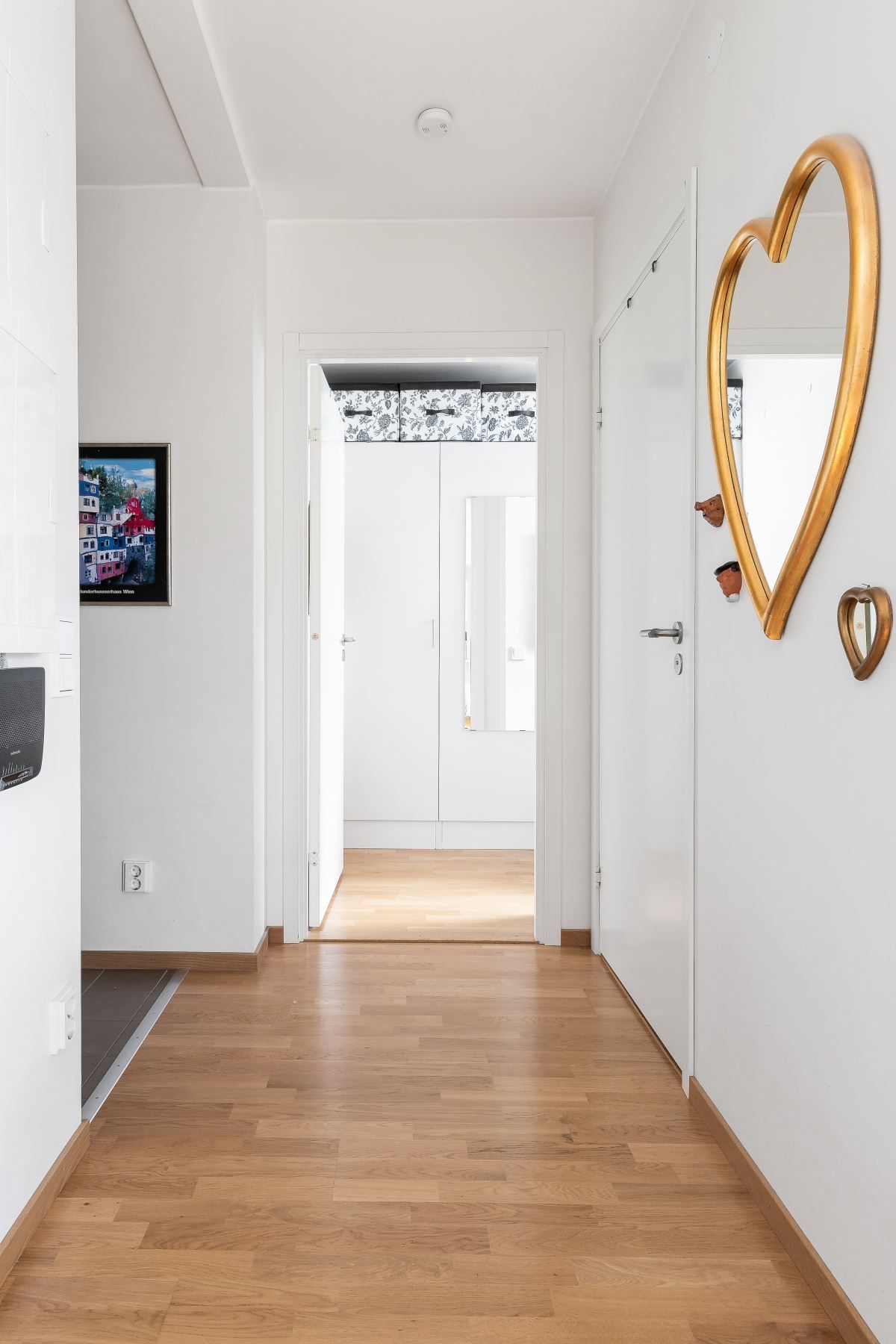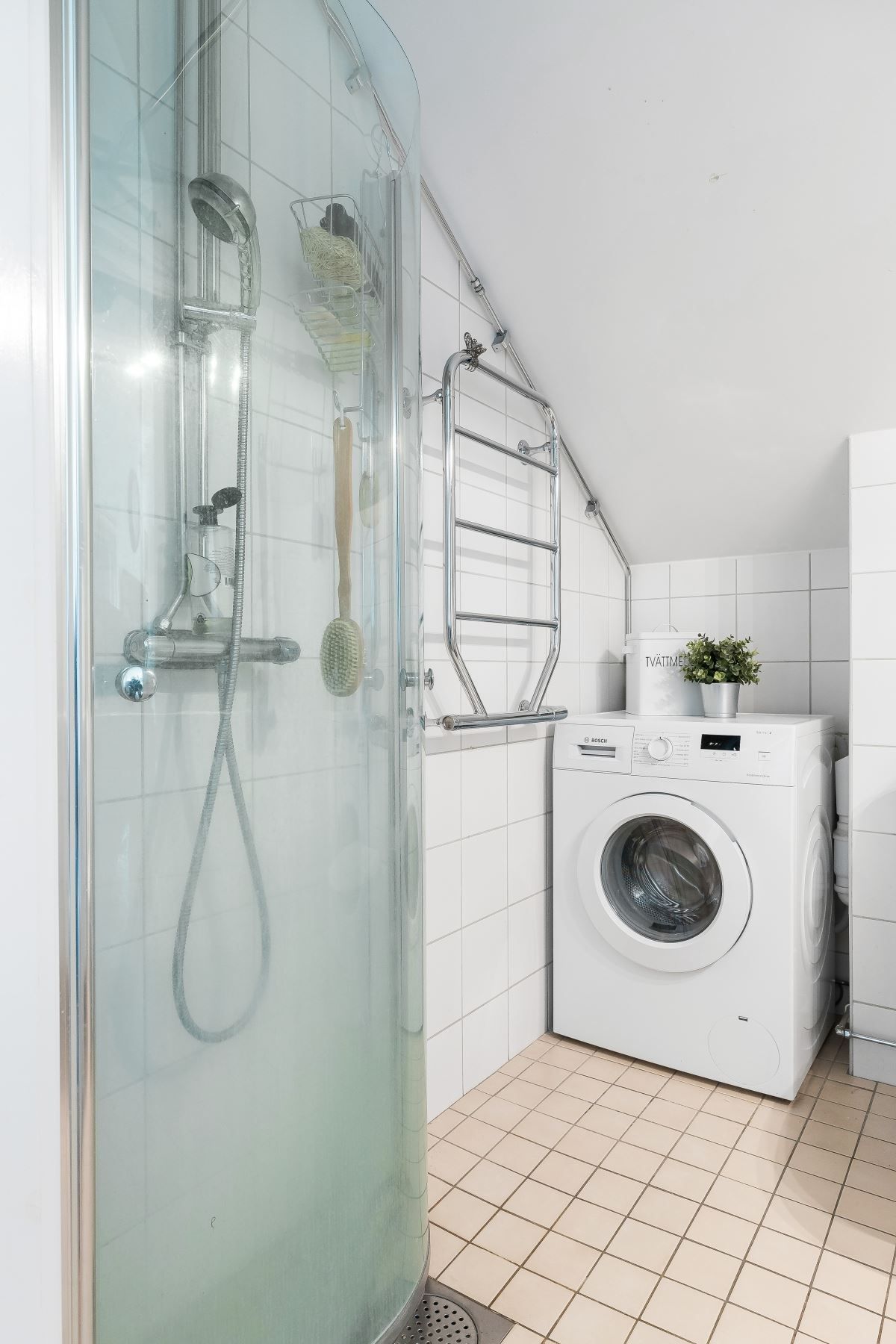 Hall med gott om plats för skor och ytterkläder. Stort helkaklat badrum med beige klinker och vitt kakel. Här finns alla bekvämligheter såsom handdukstork, golvvärme, tvättmaskin , dusch, wc och handfat med kommod och spegelskåp!