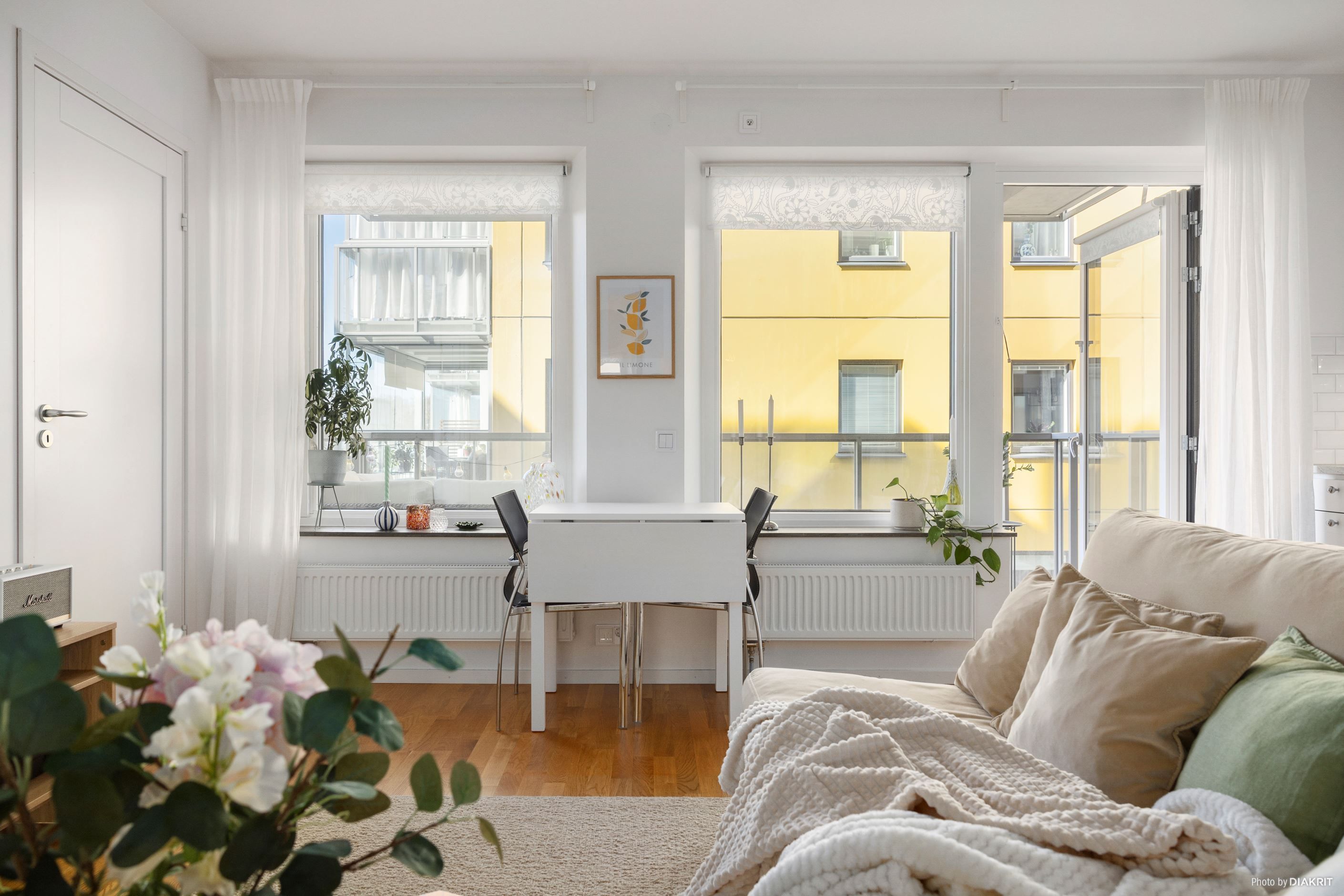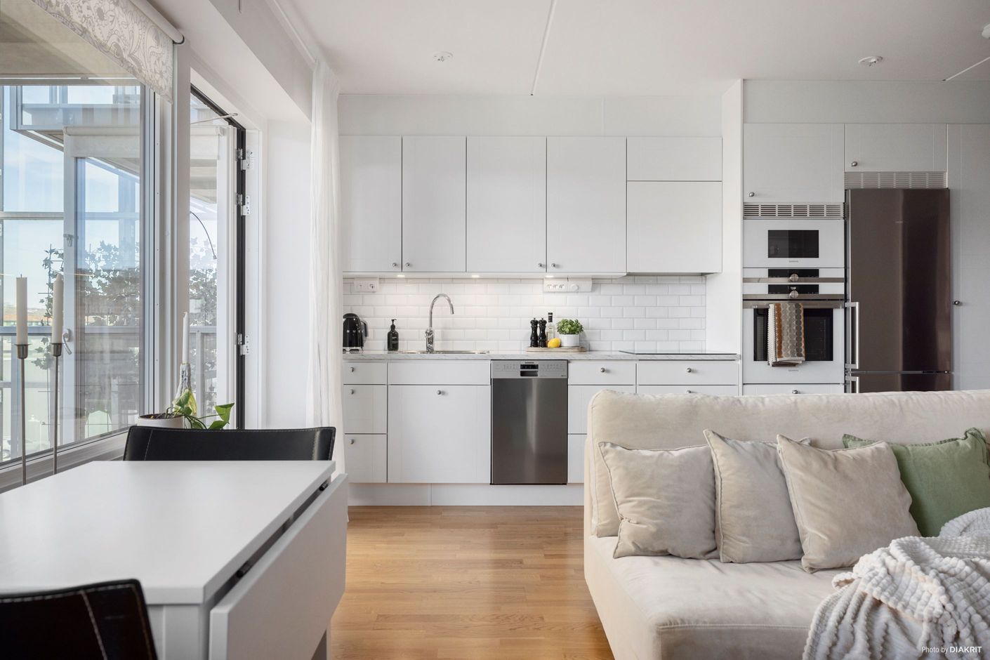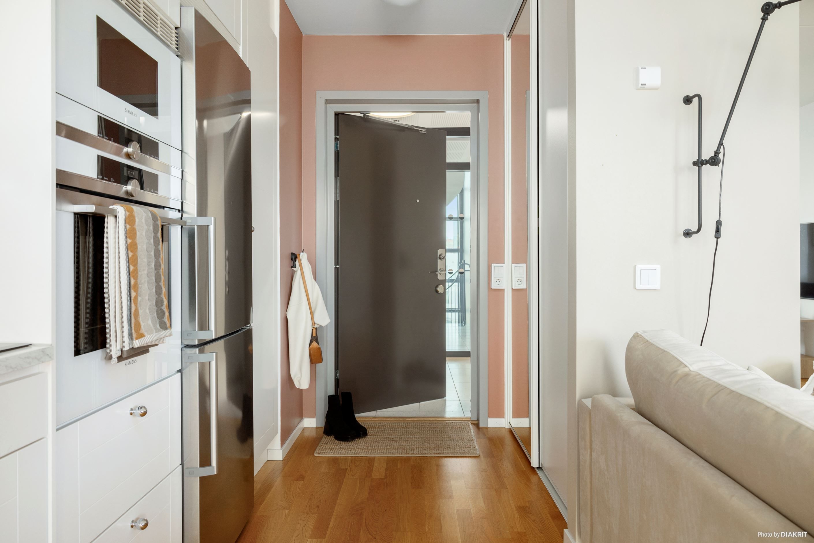 Den öppen planlösningen och de ljusa materialvalen gör atmosfären inbjudande och luftig trots sina 33,5 kvm. Lägenheten har genomgående trestavsparkettgolv som i kombination med de vita väggarna skapar en modern och hemtrevlig känsla. Det stilrena köket är fullt utrustat med diskmaskin, kombinerad kyl och frys, ugn och mikrovågsugn. En vit kakelvägg pryder väggen ovanför den ljusa bänkskivan som tillsammans med belysningen under överskåpen skapar en lyxig känsla. Här har man haft förvaring i åtanke. Redan i hallen finns en garderob men du får ytterligare en skjutdörragarderob utanför badrummet längre in i lägenheten.