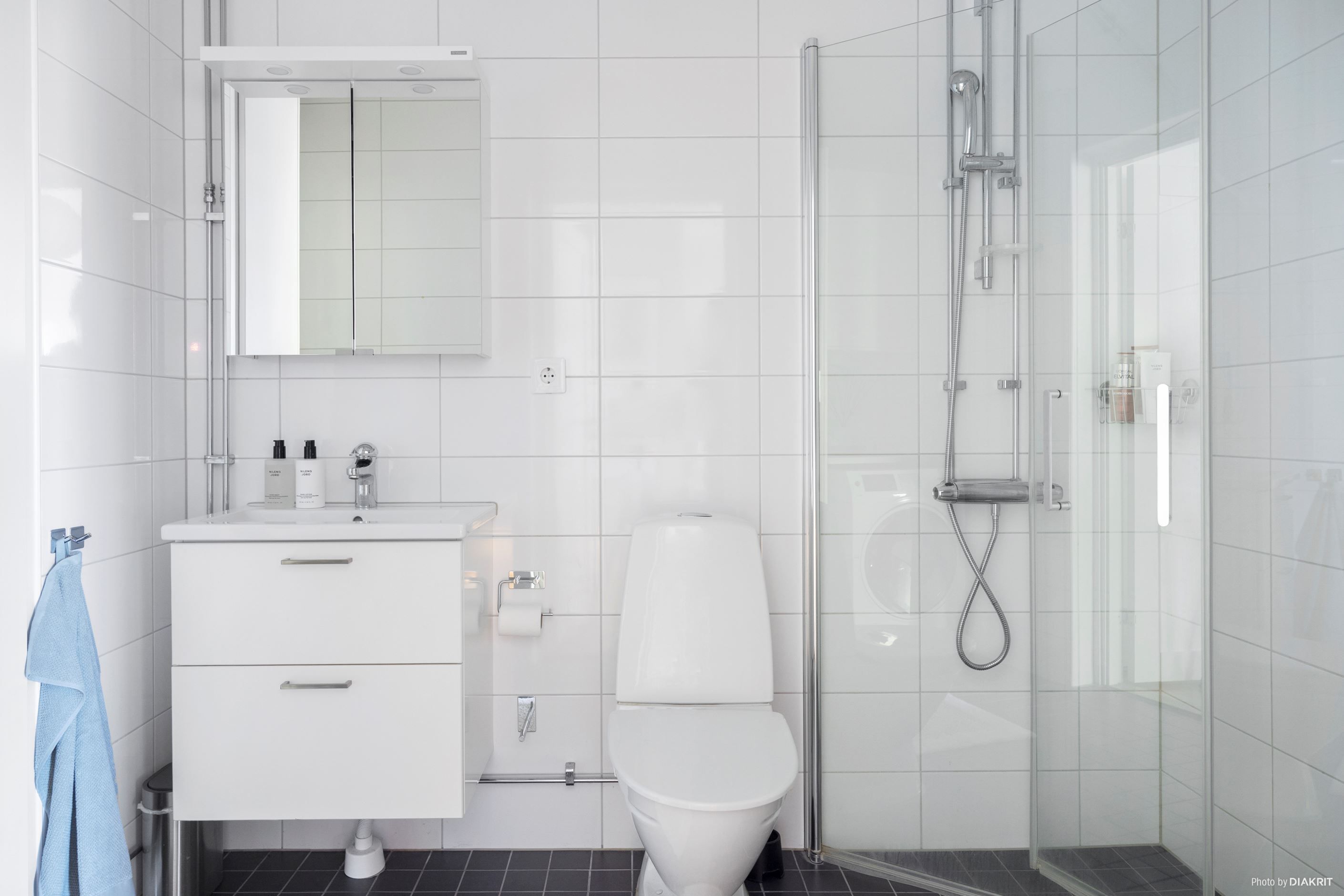 Det helkaklade badrummet har en genomgående modern känsla och är utrustat med WC, kommod med spegelskåp, dusch samt kombinerad tvättmaskin och torktumlare.