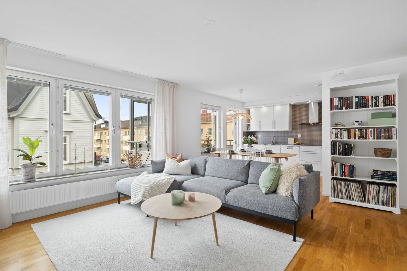 Lägenheten har en modern och stilren design med stora fönster som släpper in rikligt med naturligt ljus och förstärker känslan av rymd.
