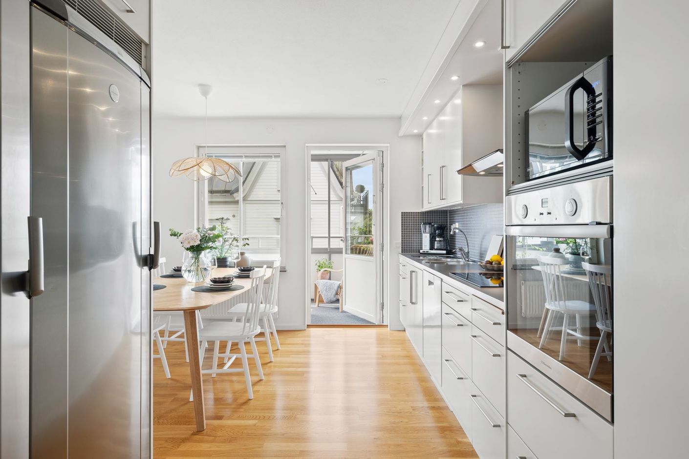 Köket är fullt utrustat med moderna vitvaror och ligger i öppen anslutning till vardagsrummet – vilket skapar en trivsam och social miljö.