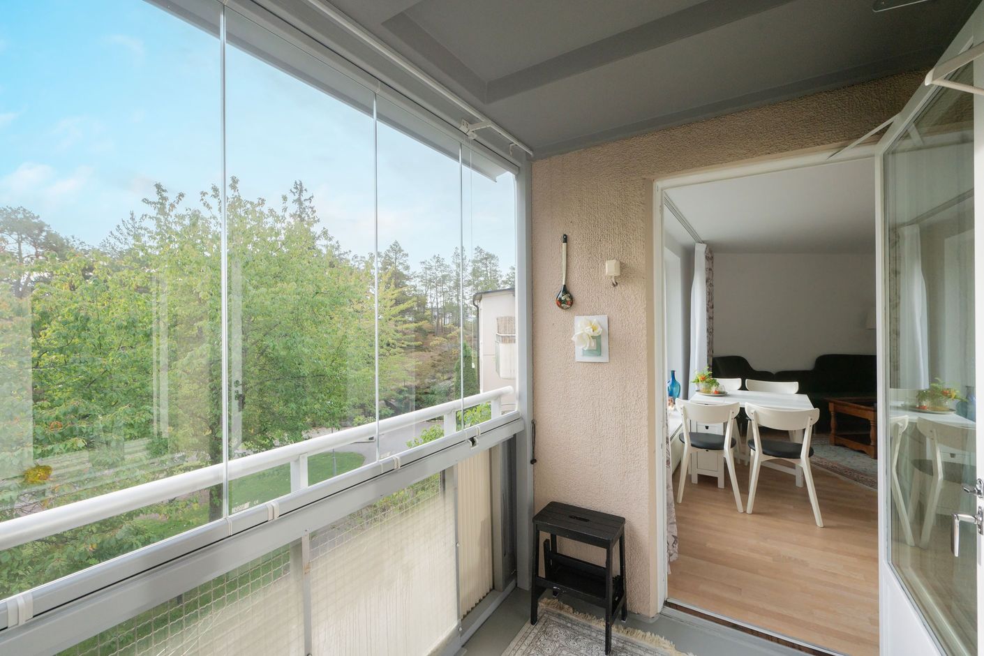Det moderna köket är öppet mot vardagsrummet och skapar en social och inbjudande yta med plats för både soffgrupp och matbord. Från vardagsrummet nås även den härliga balkongen i perfekt läge mot föreningens lugna innergård, en underbar plats att njuta av morgonkaffet eller sommarkvällen.