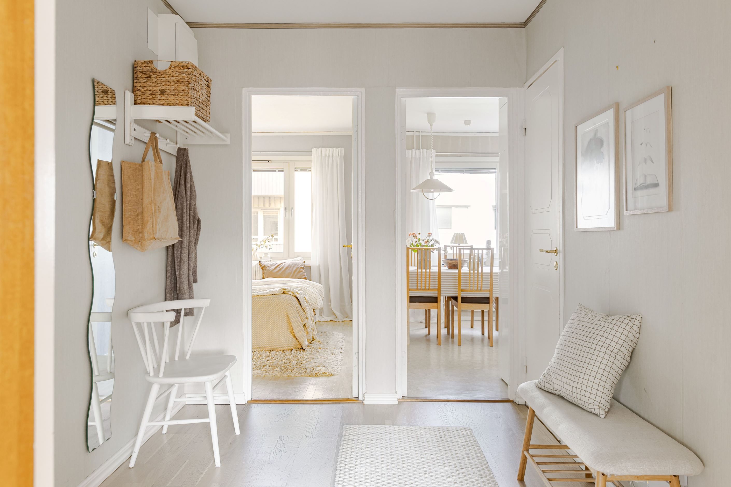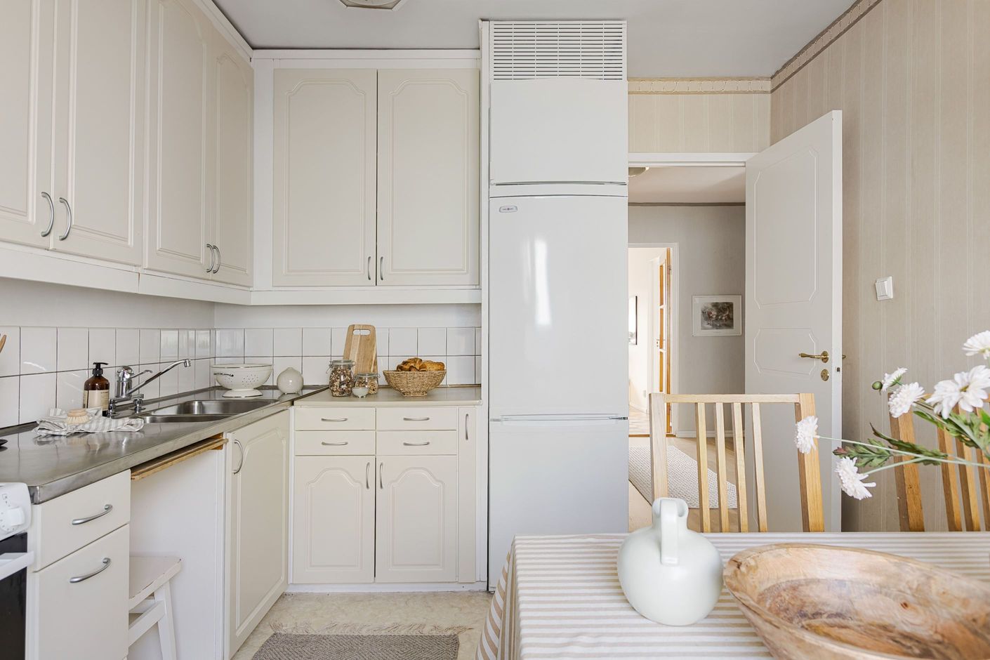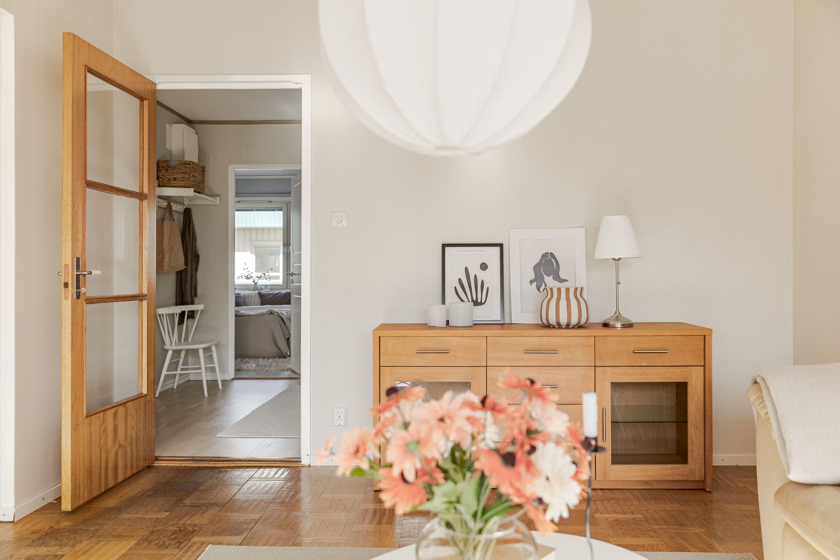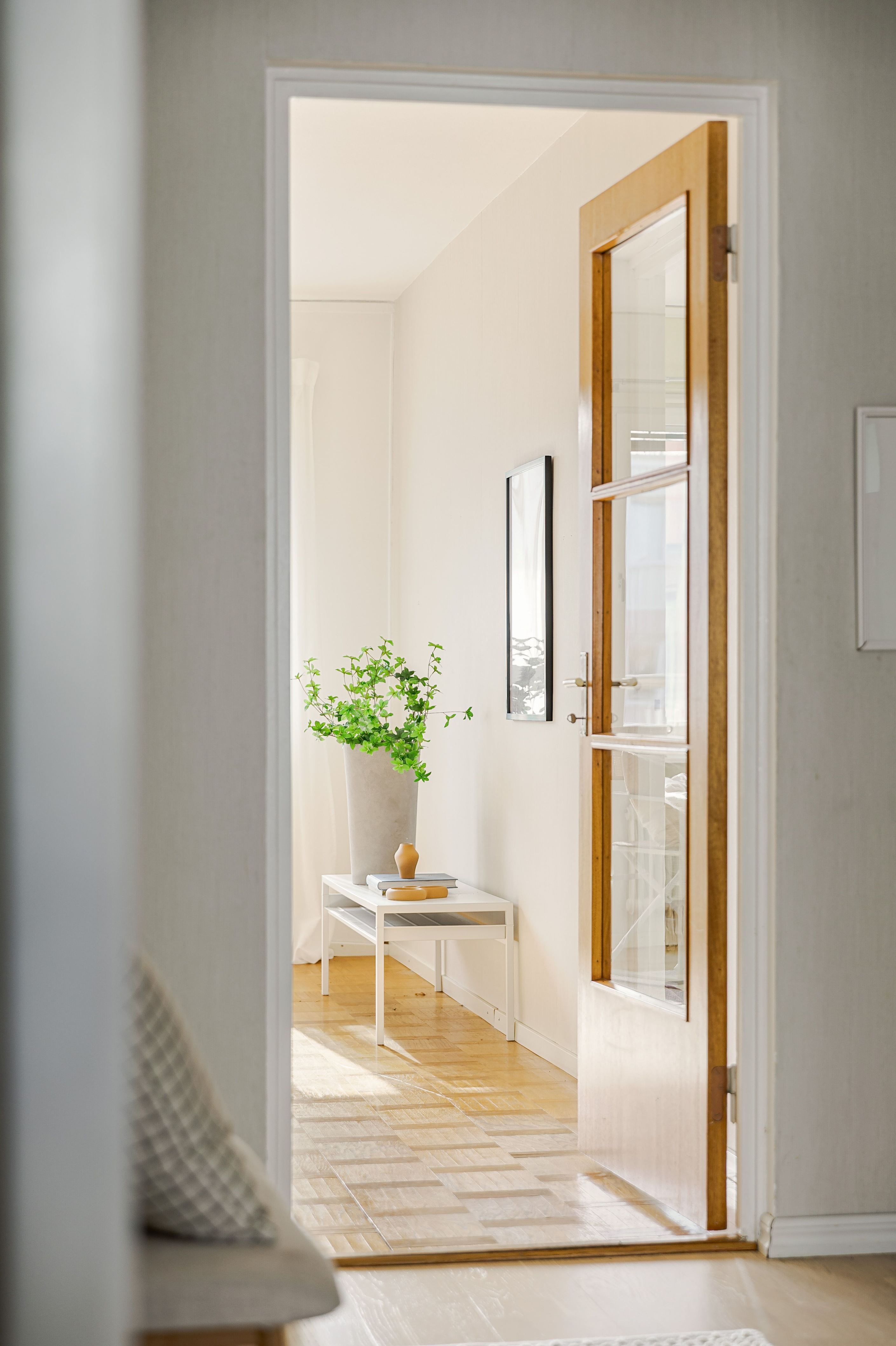 Redan i den välkomnande hallen möts du av en praktisk yta med gott om plats för avhängning. Bostaden präglas av fina bevarade detaljer som vackra teakdörrar med glas, platsbyggda stommar i köket samt en elegant stavparkett som pryder vardagsrummet och bidrar till hemmets varma och inbjudande känsla.