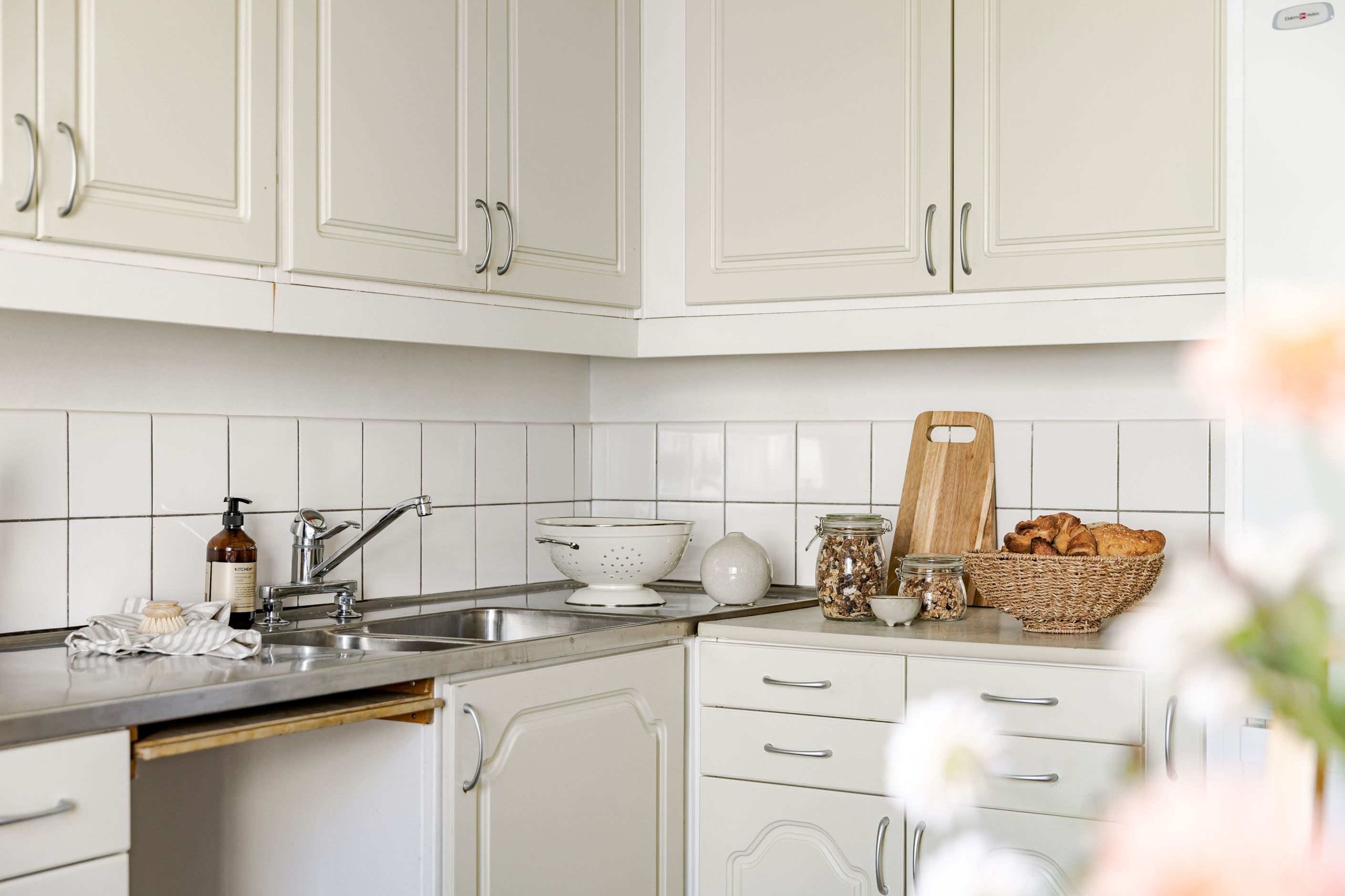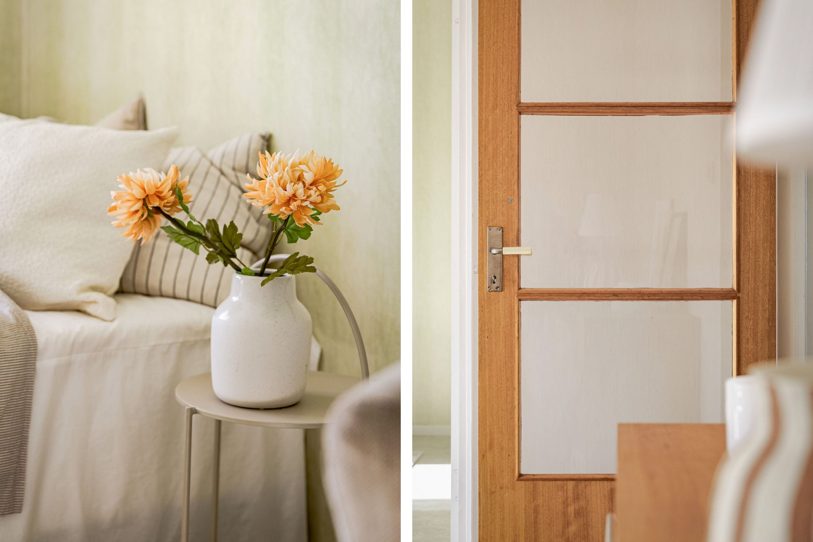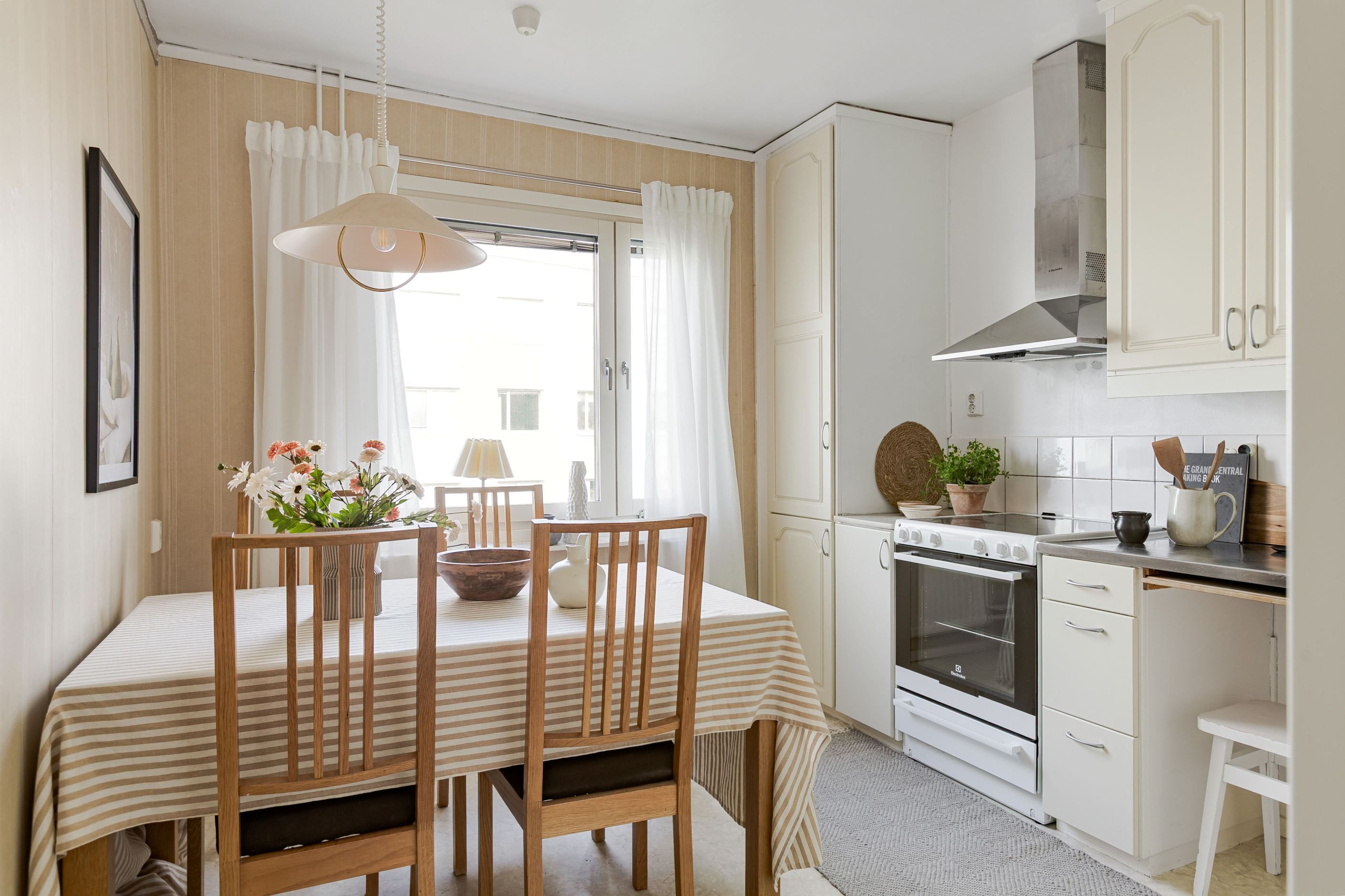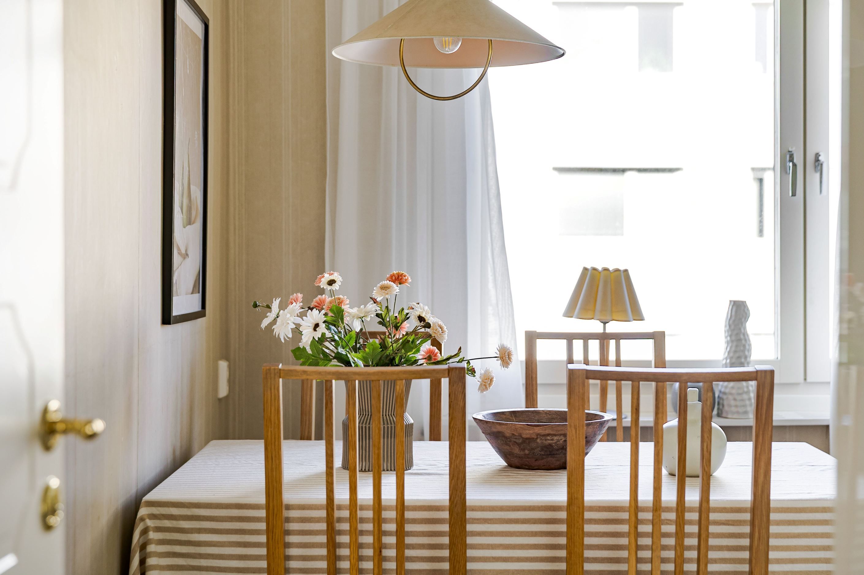 Redan i den välkomnande hallen möts du av en praktisk yta med gott om plats för avhängning. Bostaden präglas av fina bevarade detaljer som vackra teakdörrar med glas, platsbyggda stommar i köket samt en elegant stavparkett som pryder vardagsrummet och bidrar till hemmets varma och inbjudande känsla.