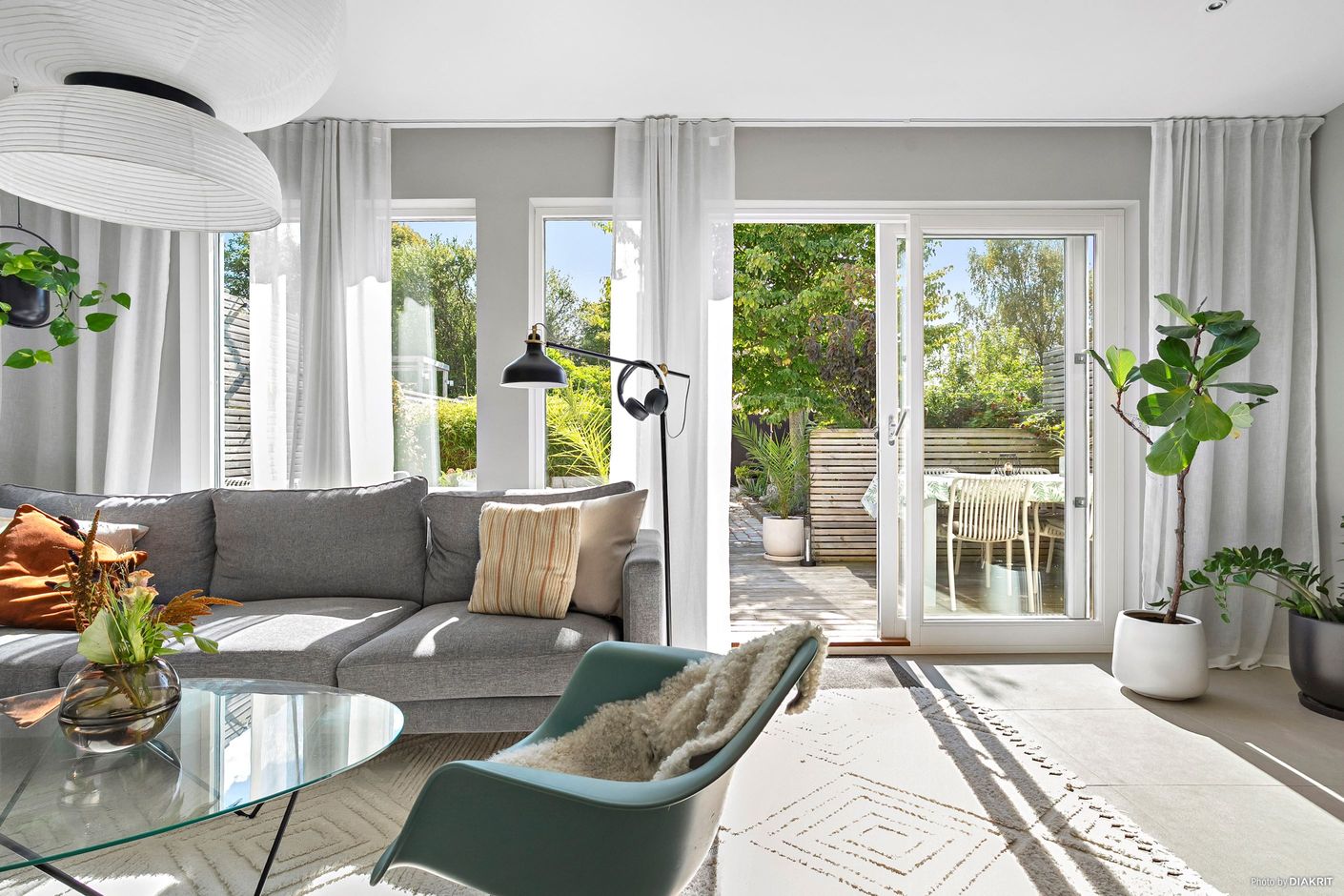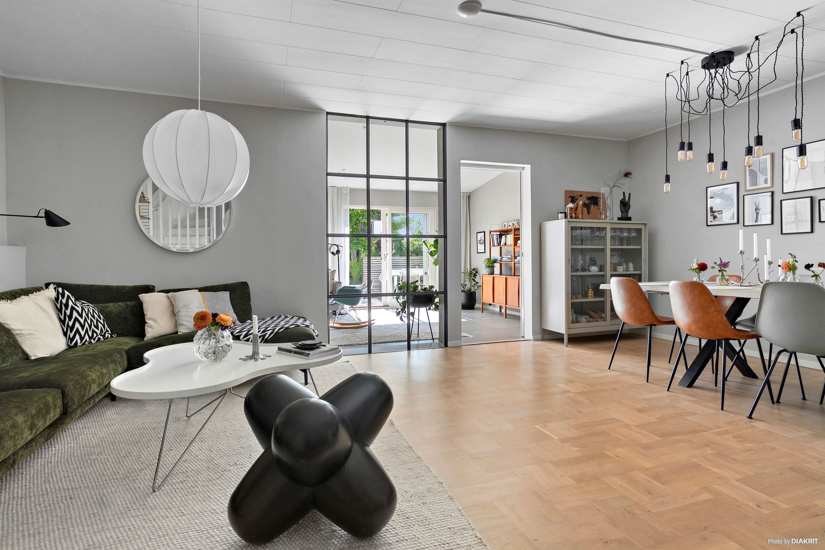 Från vardagsrummet leder vackra industriglaspartier vidare till den tillbyggda sällskapsytan från 2016 – ett perfekt extra allrum för familj och vänner. Härifrån når ni också uteplatsen i soligt söderläge och den lättskötta trädgården.