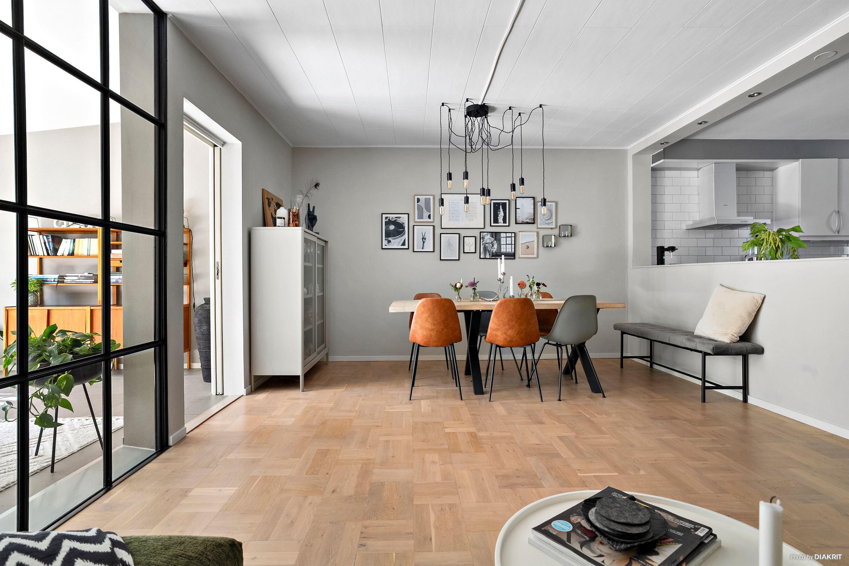 Redan vid entrén möts du av rymd och ljus. Här har man 2018 byggt om den tidigare entrén och kallförrådet till en större, välkomnande hall samt ytterligare ett sovrum – perfekt för gäster, tonåring eller hemmakontor. På entréplanet finns också en gästtoalett och ett stilrent kök som knyts samman med vardagsrummet i en öppen planlösning. De stora sociala ytorna förlängs av ett tillbyggt allrum från 2016, där vackra industriglaspartier skapar en naturlig och elegant avskärmning mellan rummen. Resultatet är två härliga sällskapsytor som både kan flyta ihop vid fest och fungera separat i vardagen.