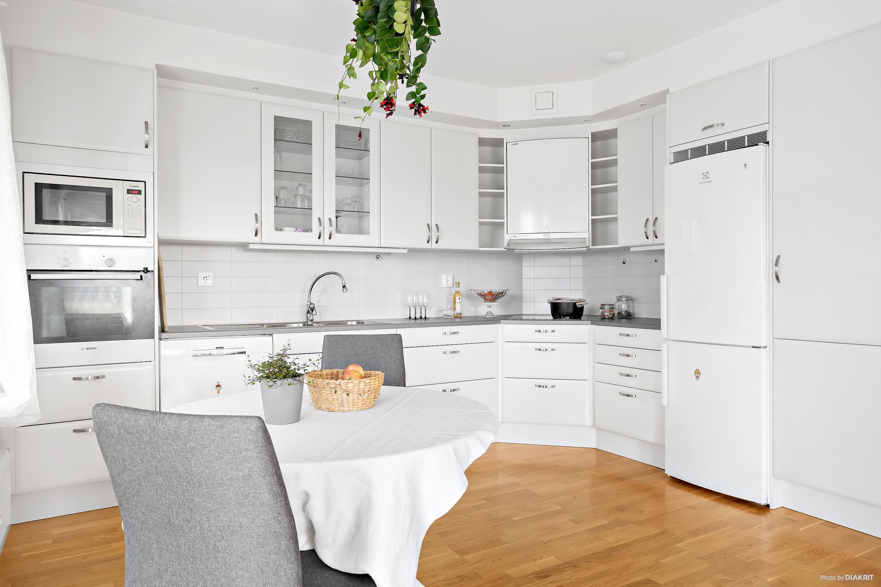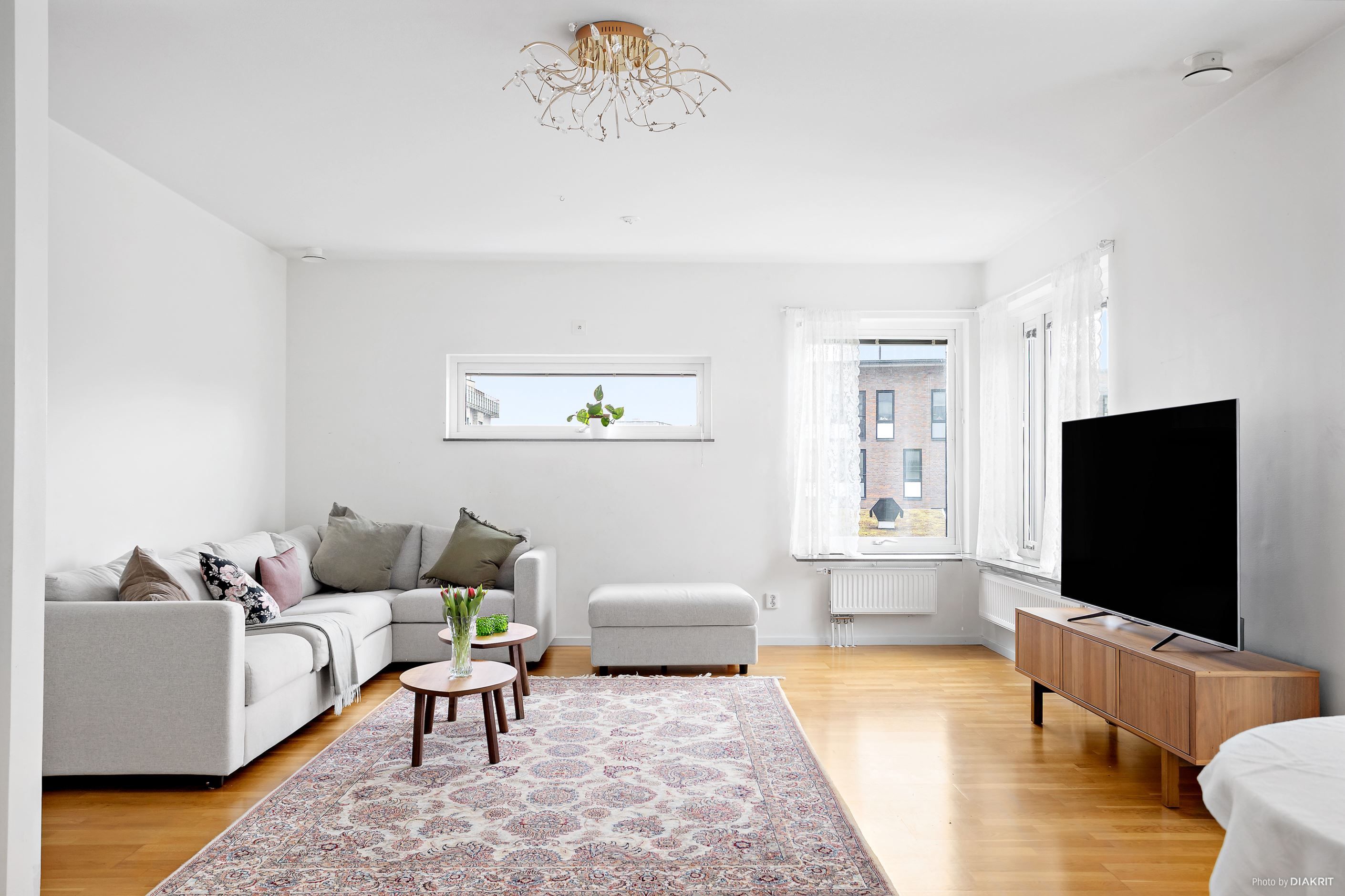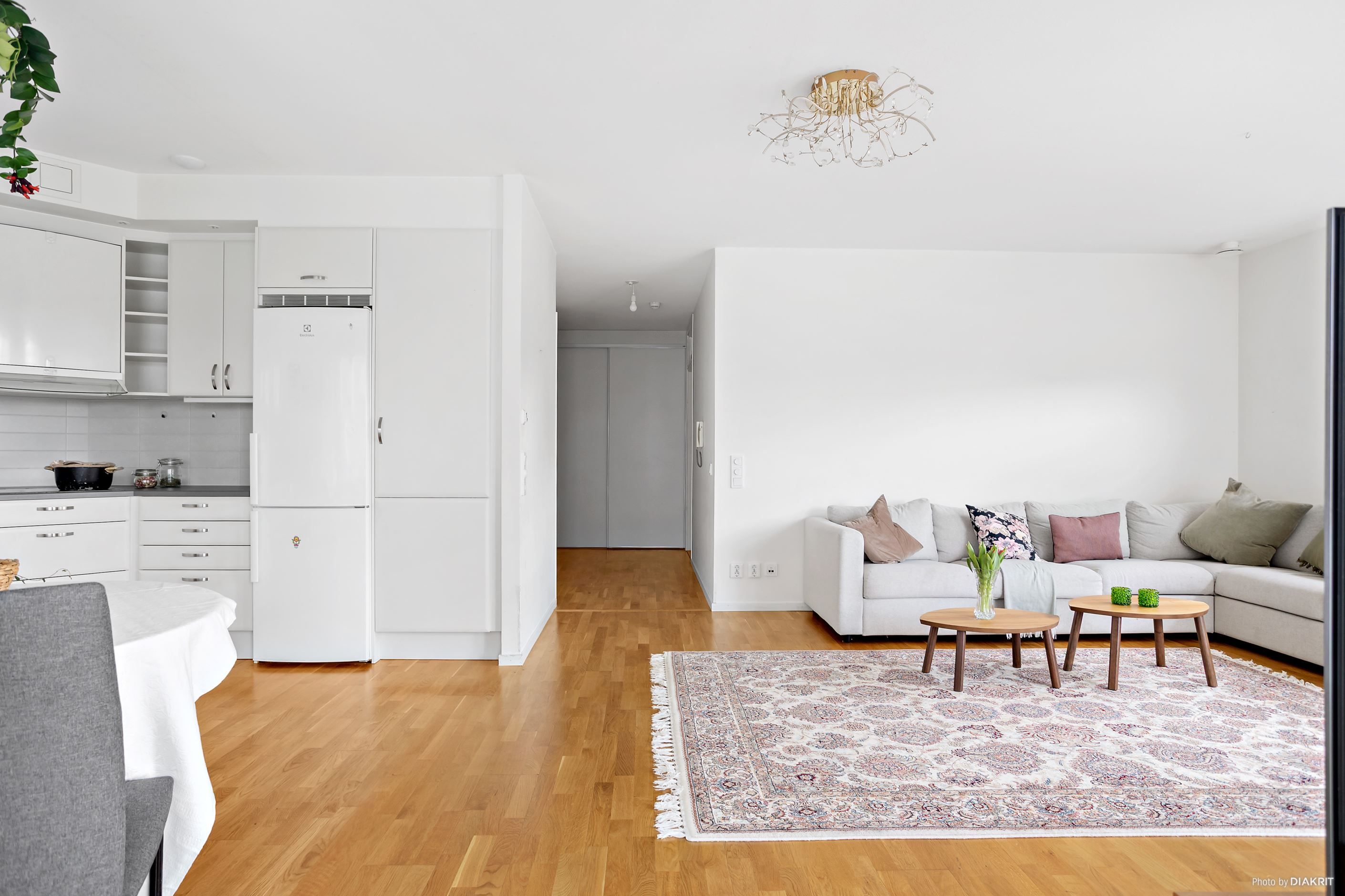 Här bor du med öppen planlösning mellan kök och vardagsrum som skapar en inbjudande och social miljö, perfekt för både vardag och umgänge. Vardagsrummet är beläget i hörnet av byggnaden vilket resulterar i fönster i olika väderstreck och ett extra fint ljusflöde.