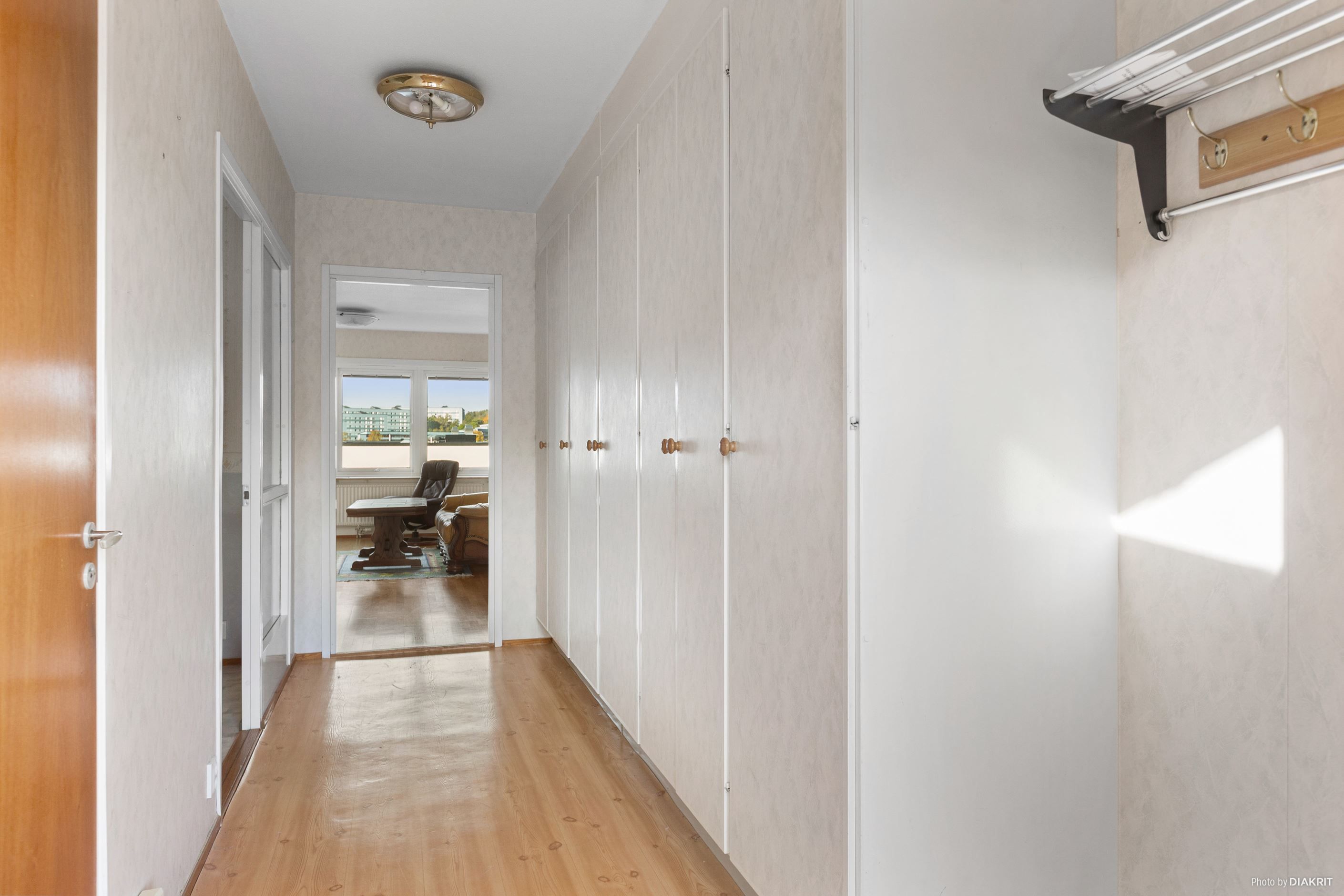 Bostaden har dessutom en välkomnande hall med flera inbyggda garderober som bidrar till ett organiserat boende.