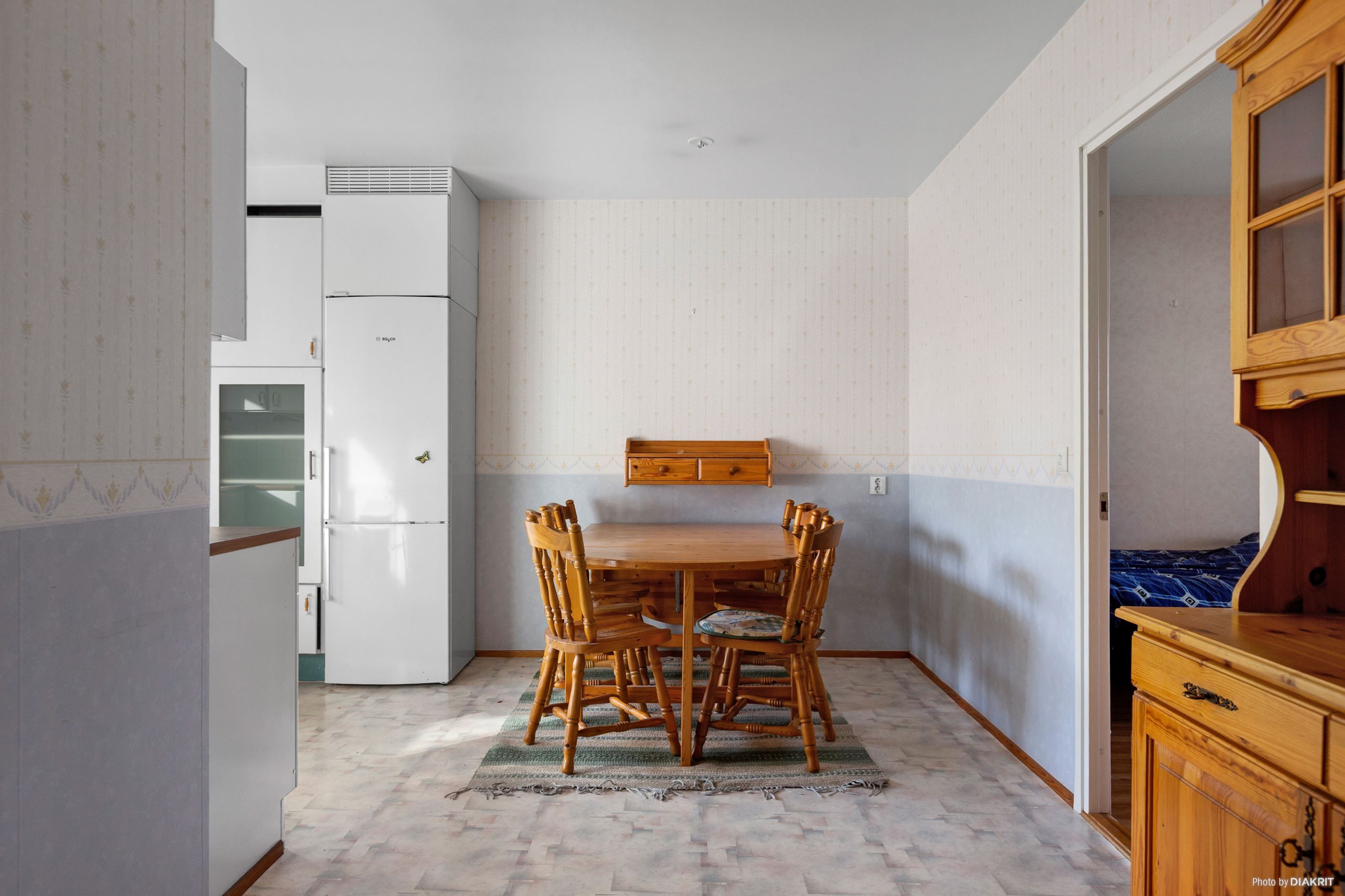 Köket erbjuder gott om både arbetsyta och förvaringsmöjligheter. Här finns plats för ett större matbord, vilket gör köket till en naturlig plats för både vardagsmåltider och socialt umgänge. Här finns fina möjligheter för den som vill modernisera efter egen stil och skapa sitt drömkök.