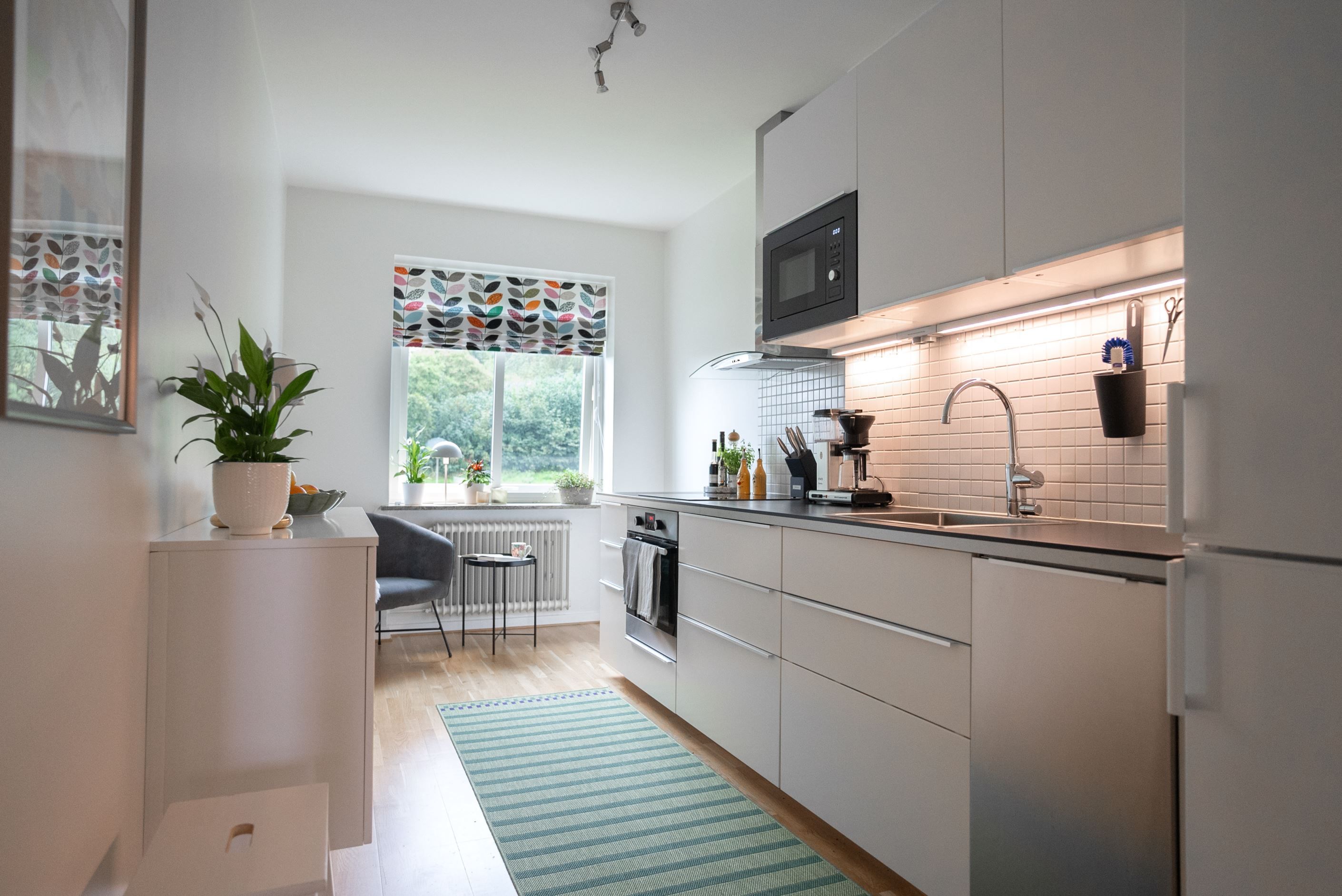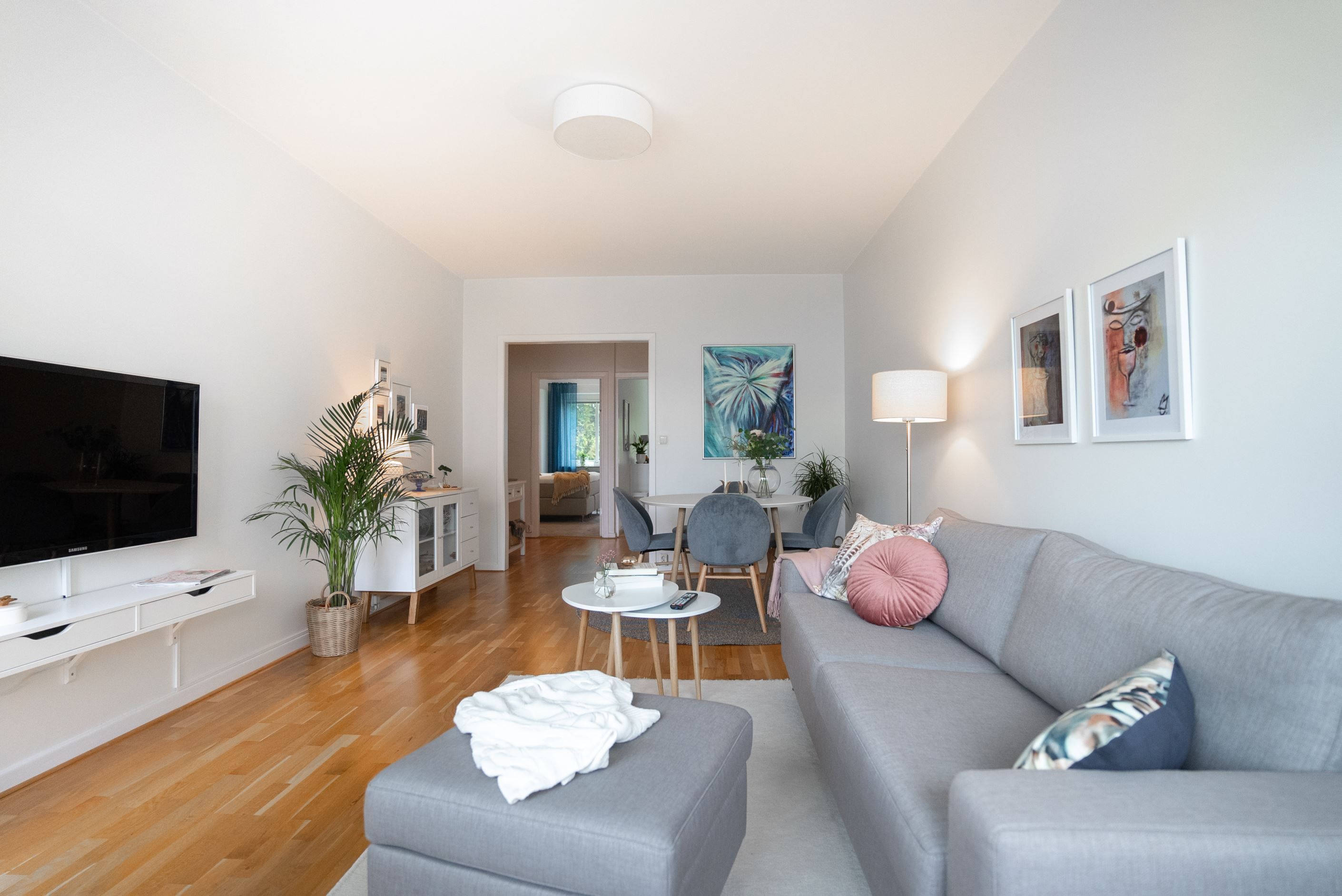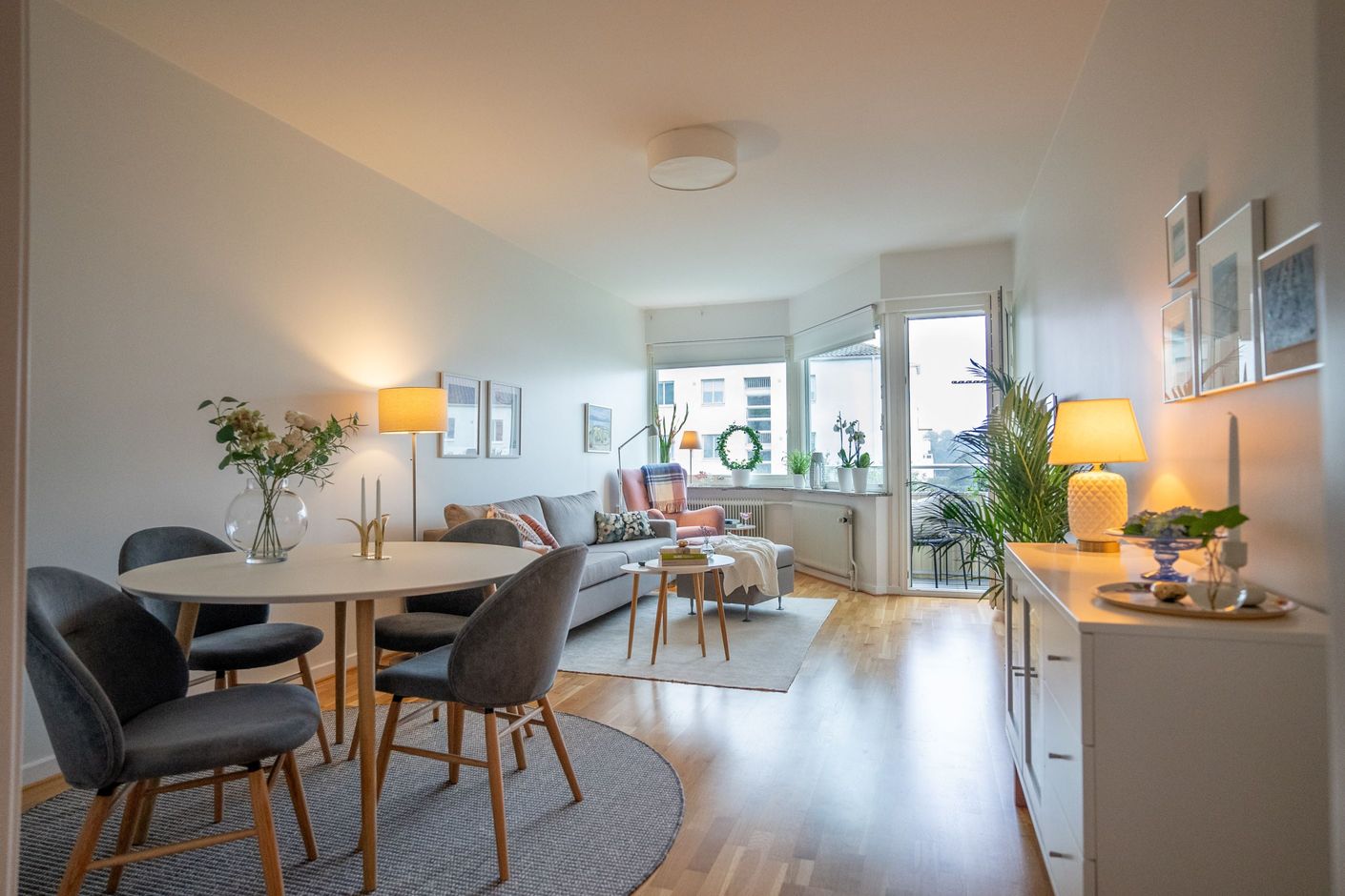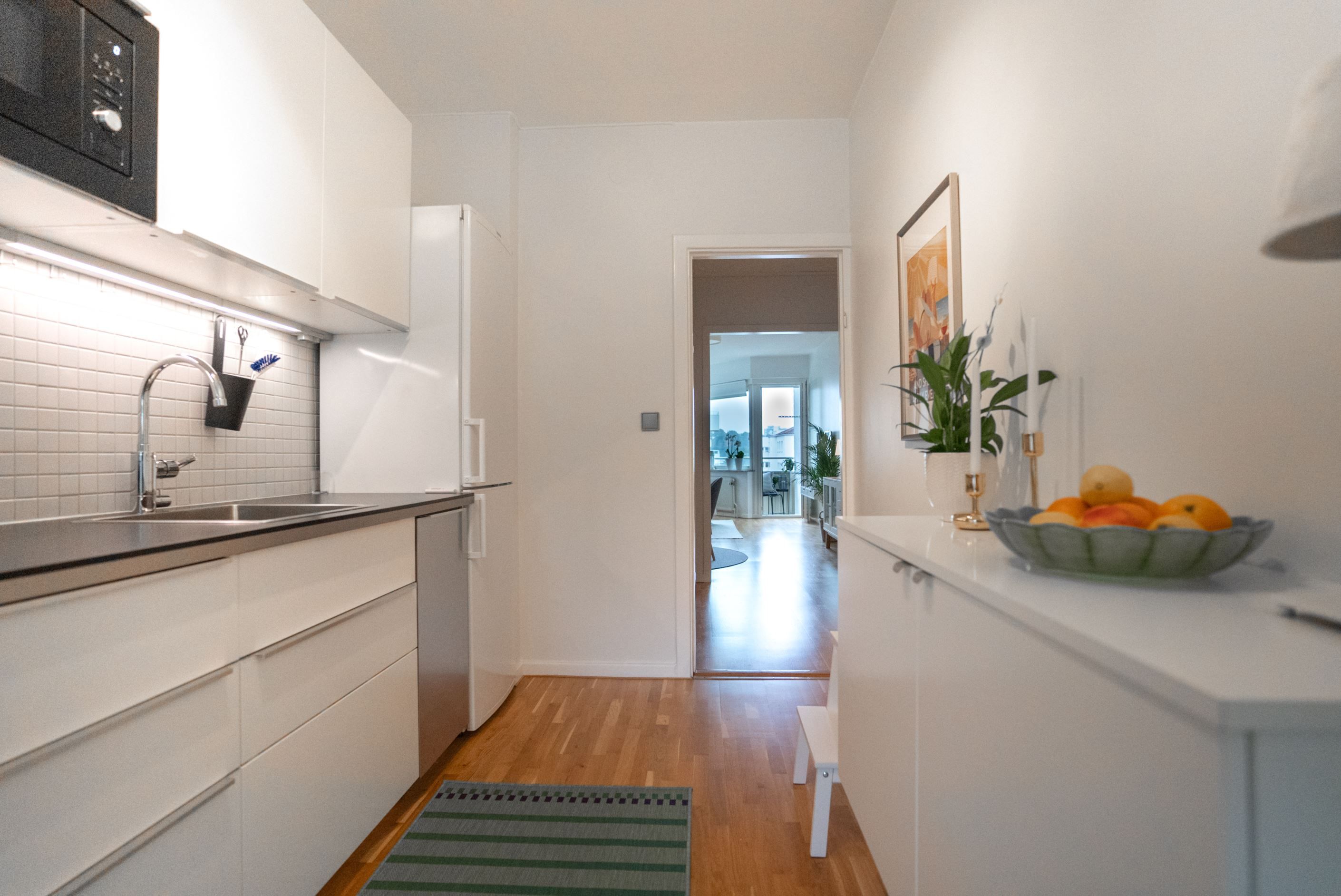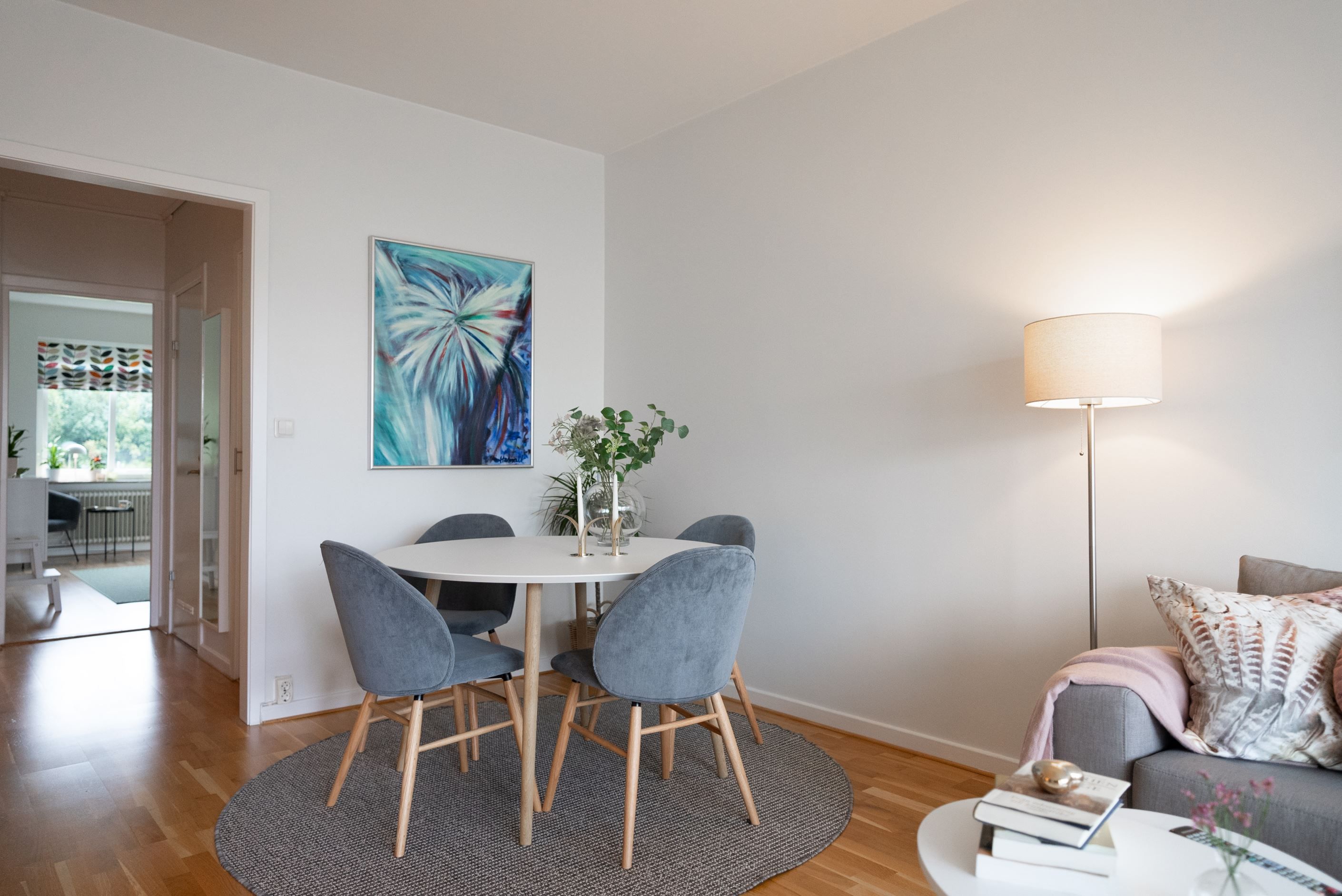 Bostaden erbjuder ett rymligt vardagsrum som enkelt rymmer både soffgrupp och matplats, perfekt för både avkoppling och sociala tillfällen. Köket är renoverat i modern stil med gott om arbetsytor, bra förvaring och plats för mindre matbord. Sovrummet ligger i rofyllt läge och ger plats för både dubbelsäng och garderober. Badrummet är helkaklat och fräscht, med stilrena materialval i klassisk design.
