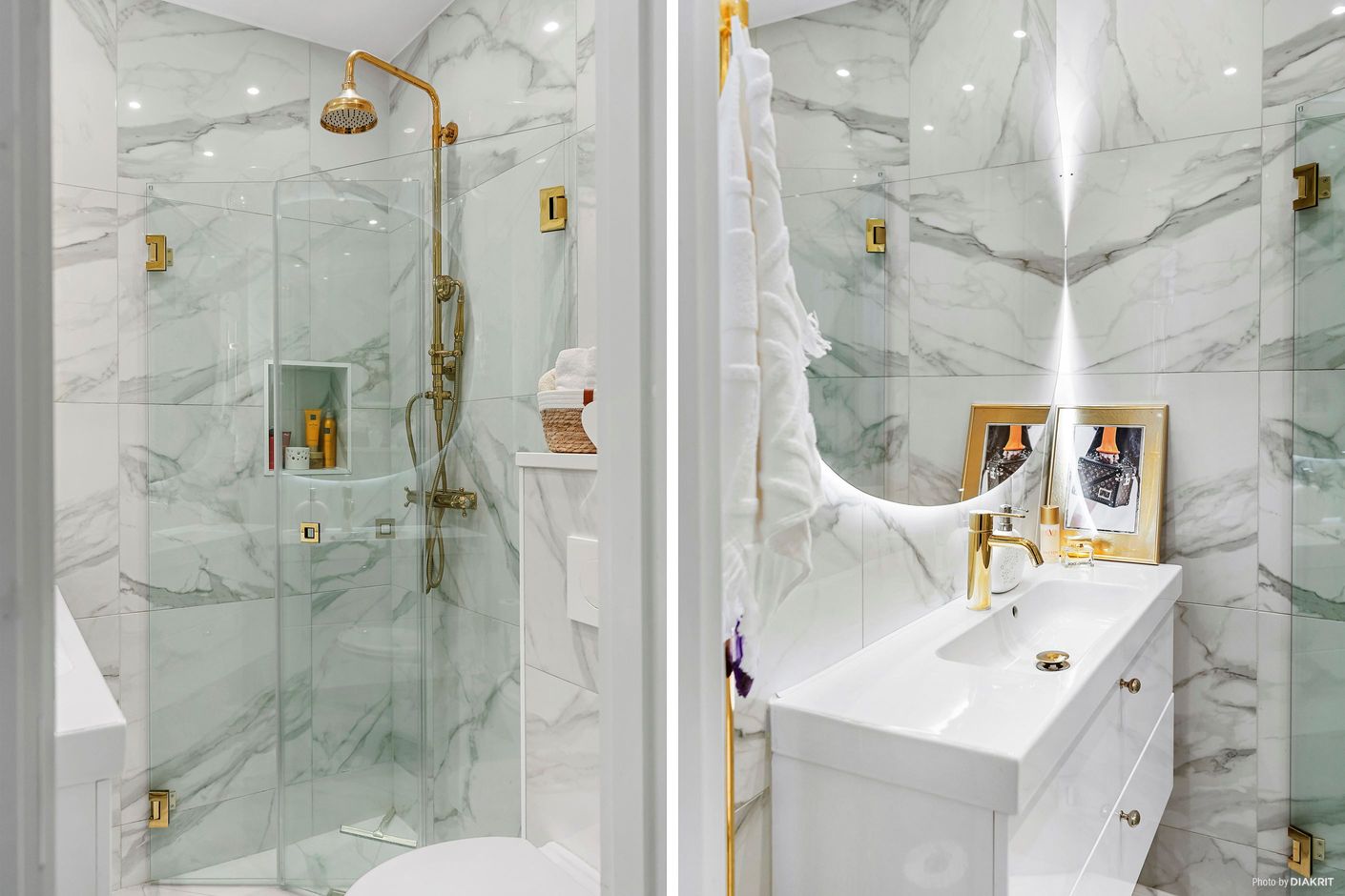 Köket är ljust och funktionellt med gott om förvaring, arbetsyta och platsbyggd yta för matplats. Badrummet är stilrent renoverat med helkaklade väggar, dusch och wc. Helhetsintrycket är modernt, välskött och inbjudande – en bostad som känns större än siffrorna antyder.