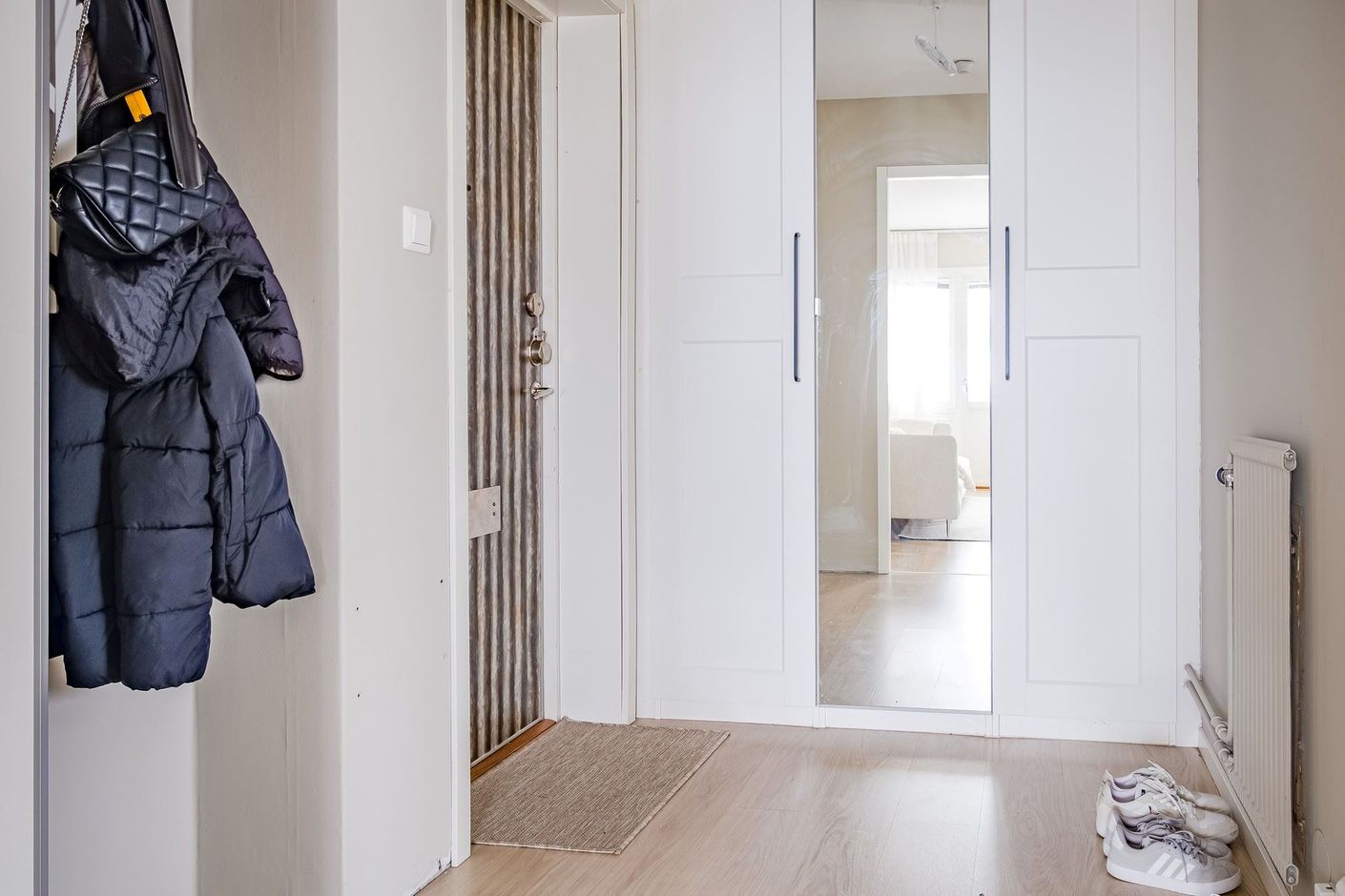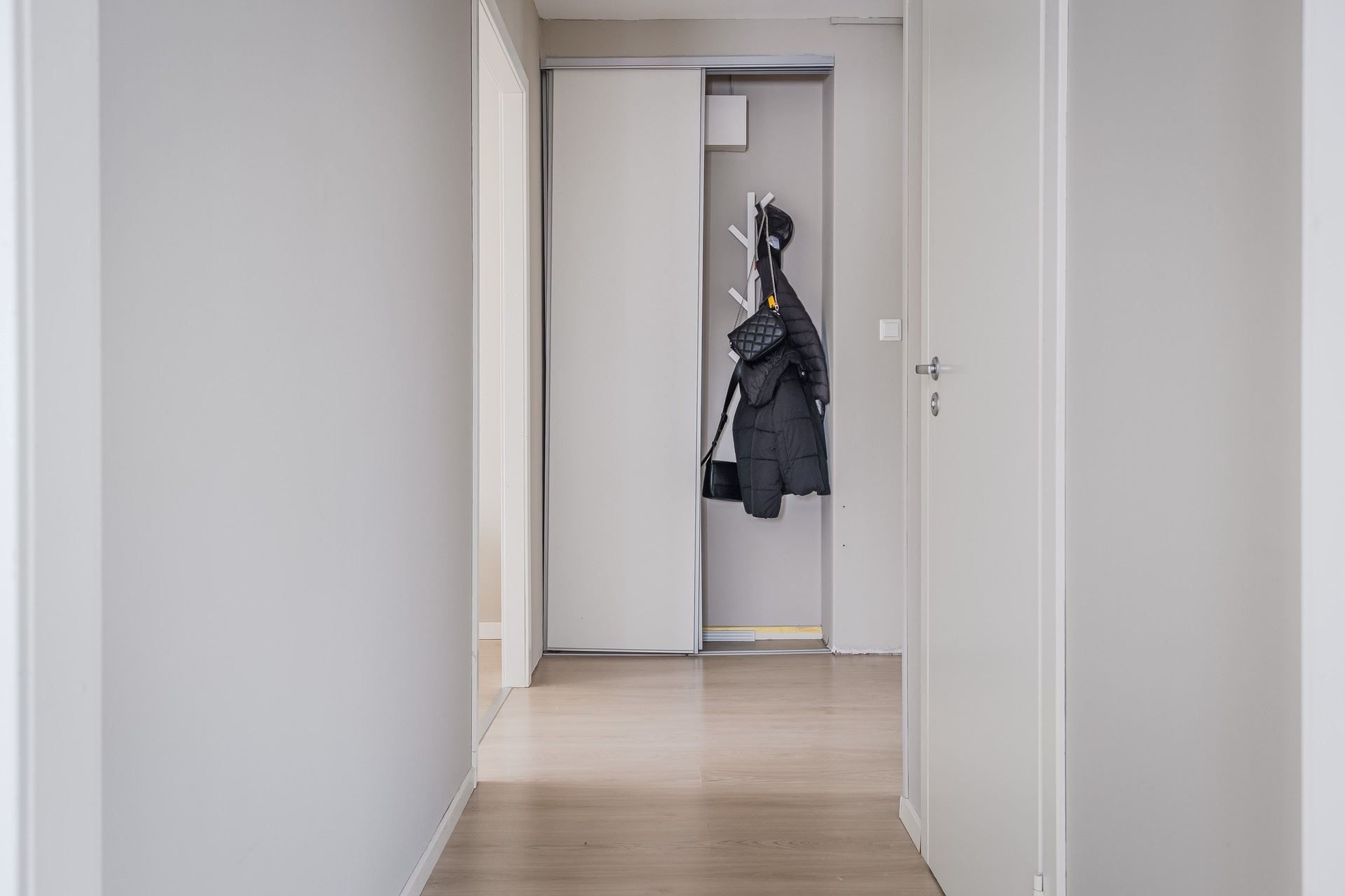 Här erbjuds en ljus och modern bostadsrätt om 57 kvm. I hallen möts du av generösa förvaringsmöjligheter i form av garderober.