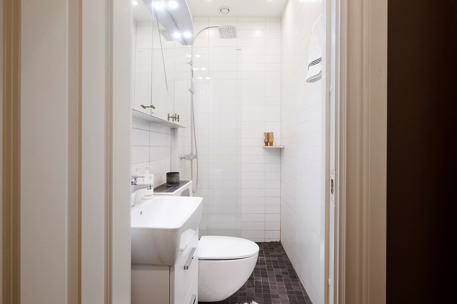 I hallen kan ni hänga av er ytterkläder direkt till höger och vidare in där lägenhetens alla finaste rum utspelar sig. Badrummet är helkaklat och i fint skick med wc, handfat med kommod, spegelskåp samt dusch. Golvvärme är installerat för extra komfort.