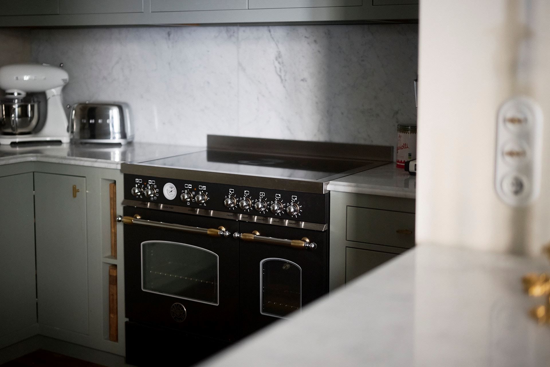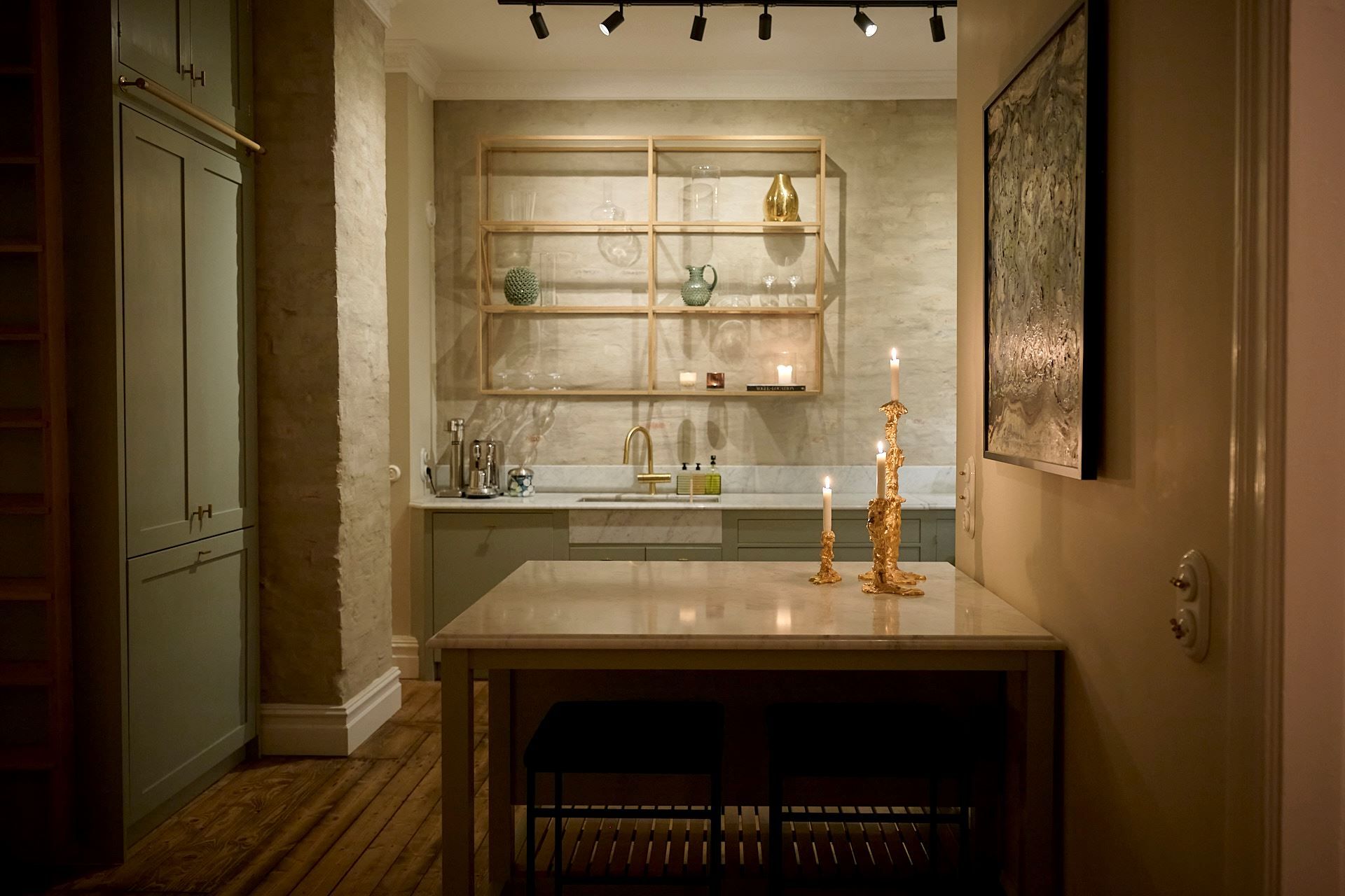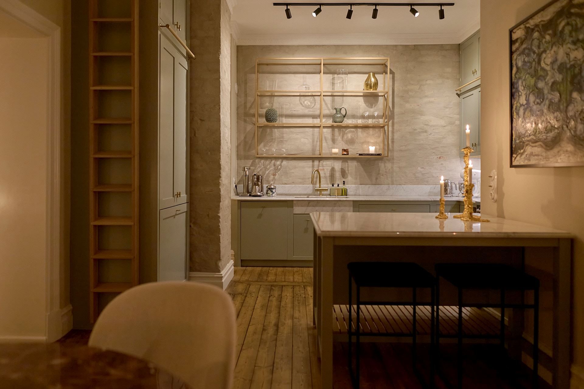 Köket överraskar och signeras Tre Sekel! Platsbyggt, väl genomtänkt och påkostat. Hela rummet känns genomarbetat i varje detalj, en unik känsla av rymd tillsammans med en mysig och ombonad känsla. Helt klart, hemmets hjärta och självklara samlingplats. Ytterst medvetna materialval med generös kokö och bra förvaringsmöjligheter – de bästa förutsättningarna för goda middagar. Den påkostade utrustningen kommer från Bertazzoni (!), Fisher and Paykel och Fjäråskupan. Bänkskivan är i Carrara marmor och bryter snyggt av mot de handslipade luckornas nyans i grön ton. Bakom tavelvägen finner ni vinförvaring. Intill det stora fönsterpartiet kan ni möblera med stor matgrupp.
