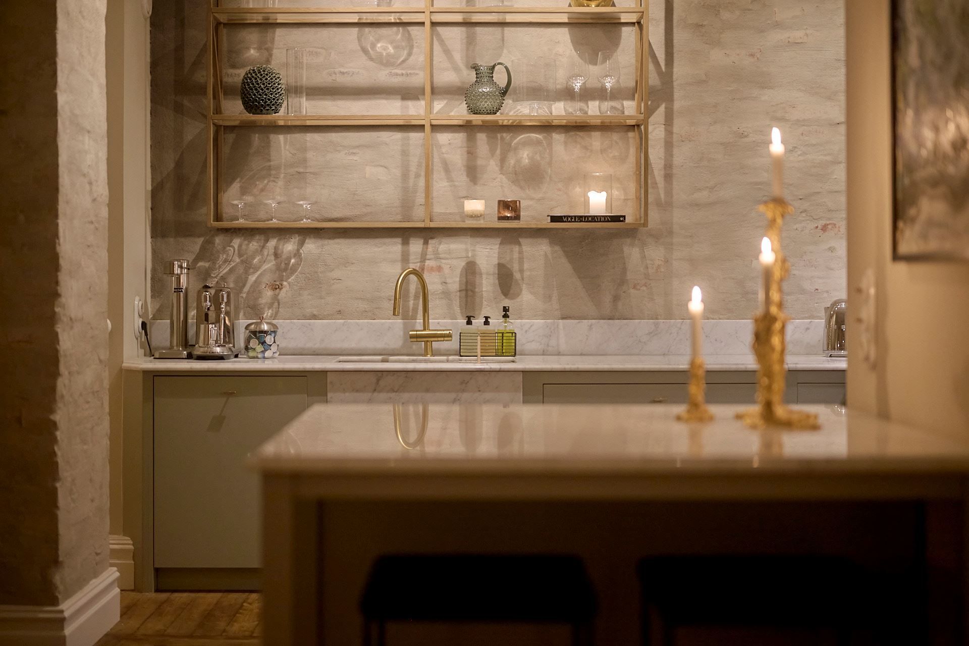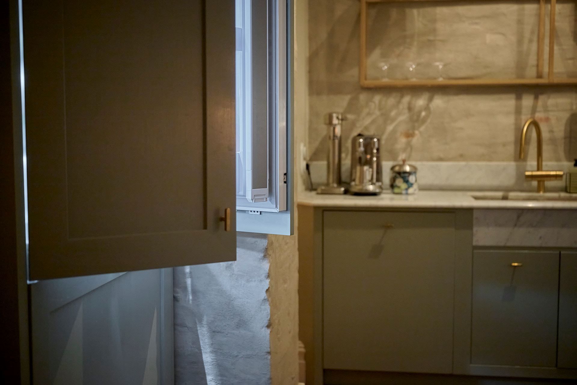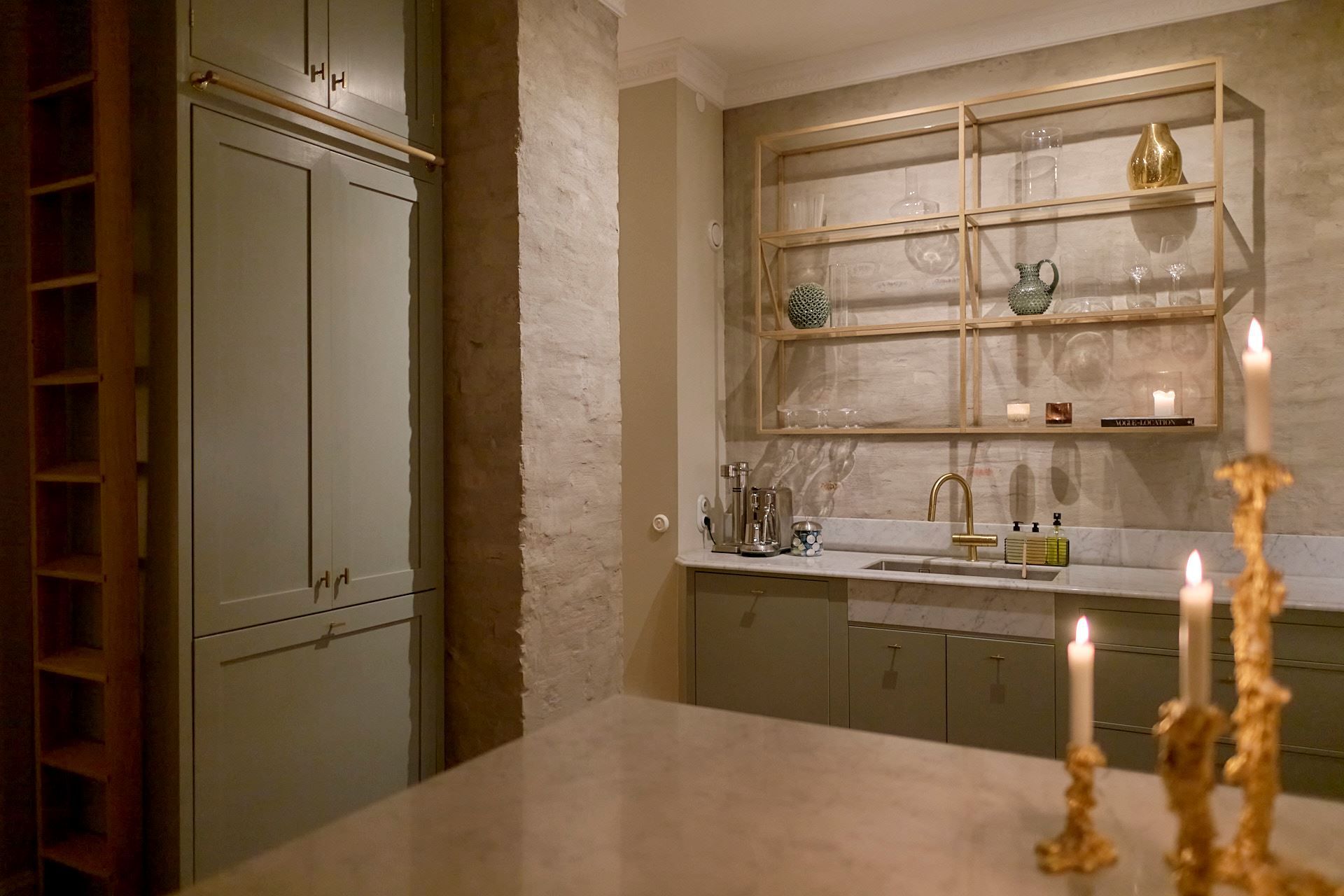 Köket överraskar och signeras Tre Sekel! Platsbyggt, väl genomtänkt och påkostat. Hela rummet känns genomarbetat i varje detalj, en unik känsla av rymd tillsammans med en mysig och ombonad känsla. Helt klart, hemmets hjärta och självklara samlingplats. Ytterst medvetna materialval med generös kokö och bra förvaringsmöjligheter – de bästa förutsättningarna för goda middagar. Den påkostade utrustningen kommer från Bertazzoni (!), Fisher and Paykel och Fjäråskupan. Bänkskivan är i Carrara marmor och bryter snyggt av mot de handslipade luckornas nyans i grön ton. Bakom tavelvägen finner ni vinförvaring. Intill det stora fönsterpartiet kan ni möblera med stor matgrupp.