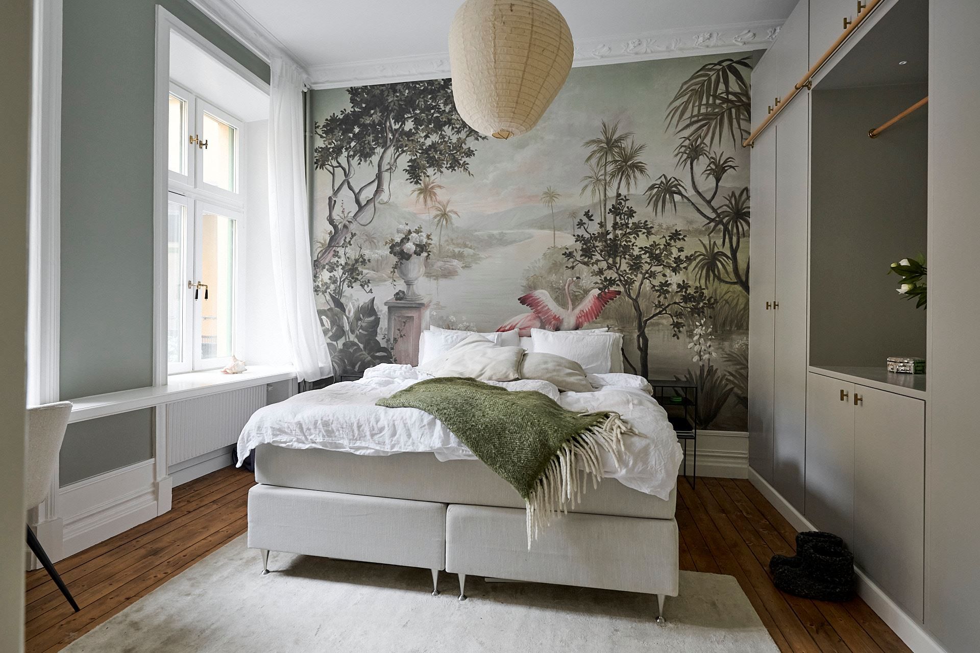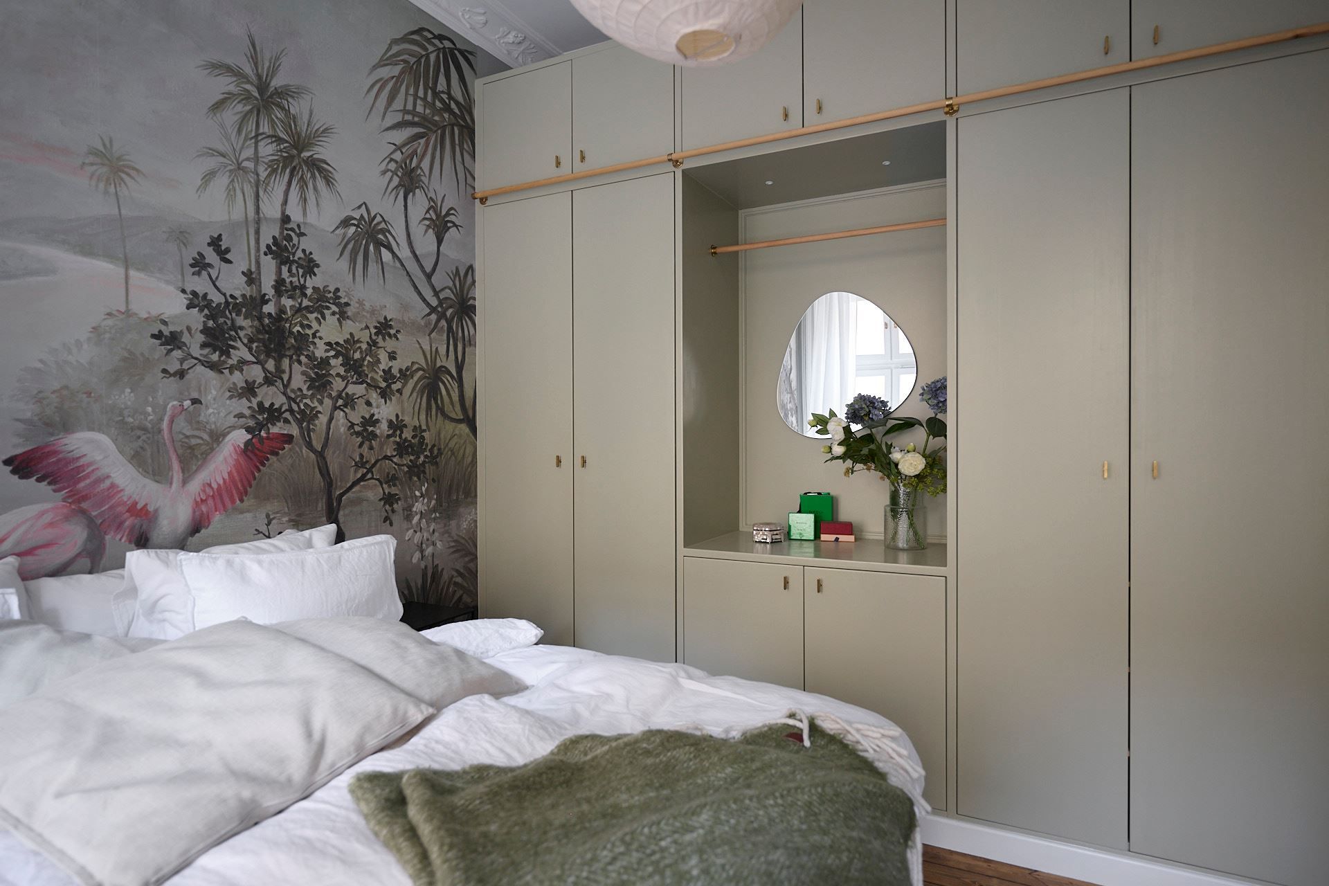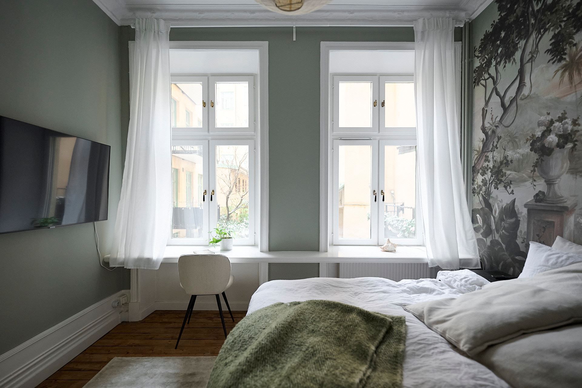Genom vardagsrummet når ni det generösa sovrummet. Med sina fönster vända mot den grönskande innergården sover ni här gott om natten. Läget bidrar till rummets lugna och harmoniska atmosfär. Plats för hemmakontor, dubbelsäng med tillhörande sängbord. Den platsbyggda garderoben ger er all önskvärd förvaring.