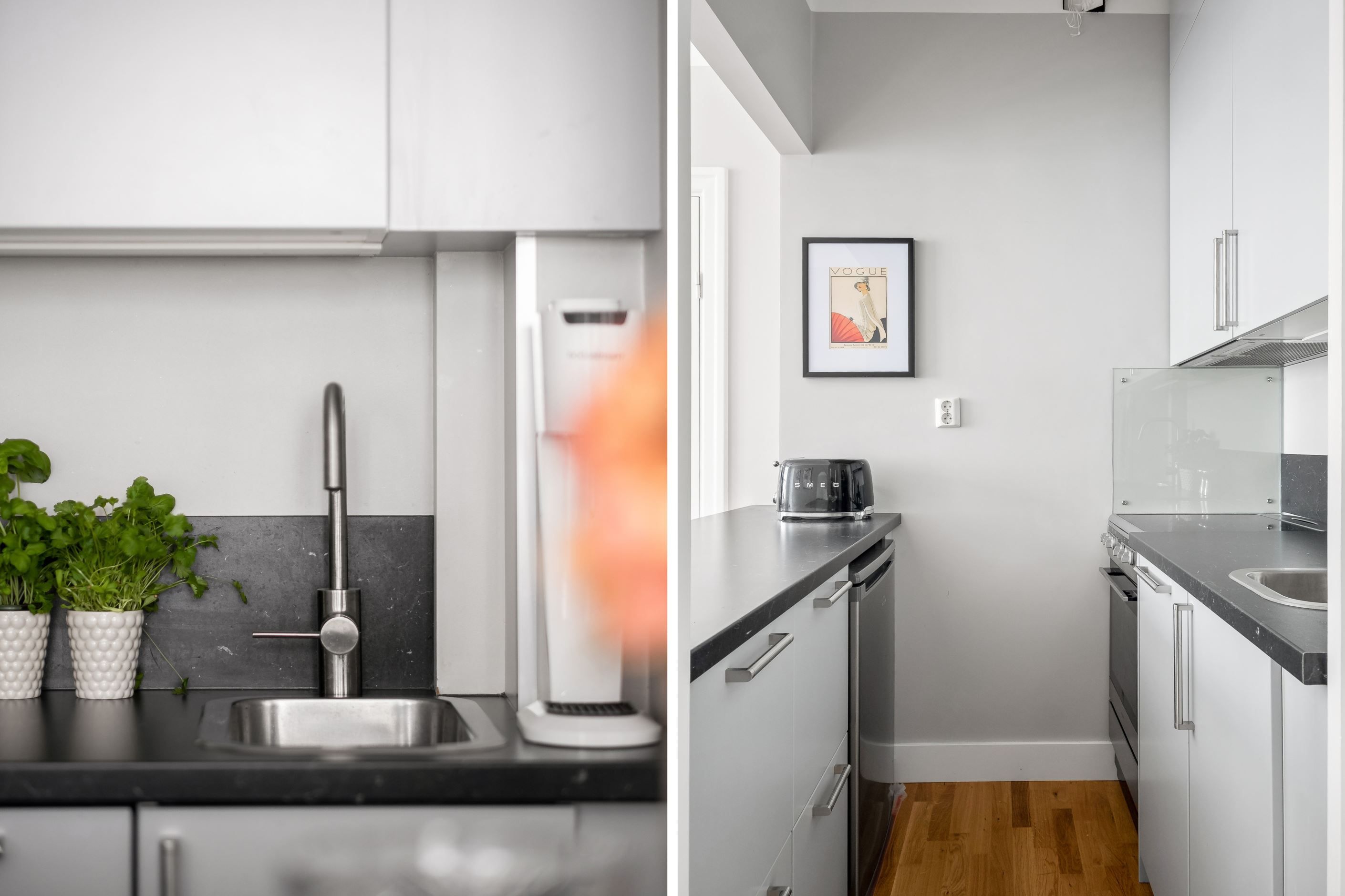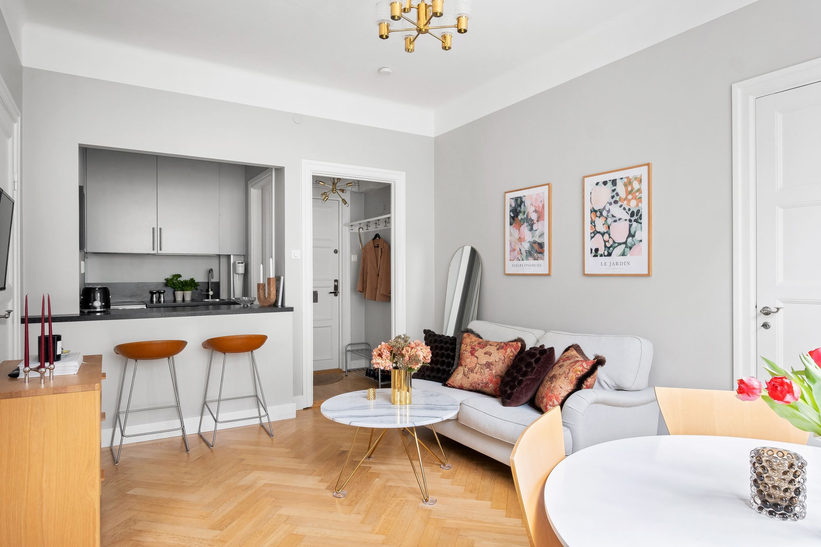 Planlösningen är optimalt disponerad med en halvöppen och social yta mellan kök och vardagsrum. Det renoverade köket är smakfullt utformat med goda arbetsytor och förvaring, perfekt för såväl vardagsmiddagar som sociala tillställningar. Vardagsrummet rymmer både soffgrupp och matbord utan att kompromissa med rymd eller funktion.