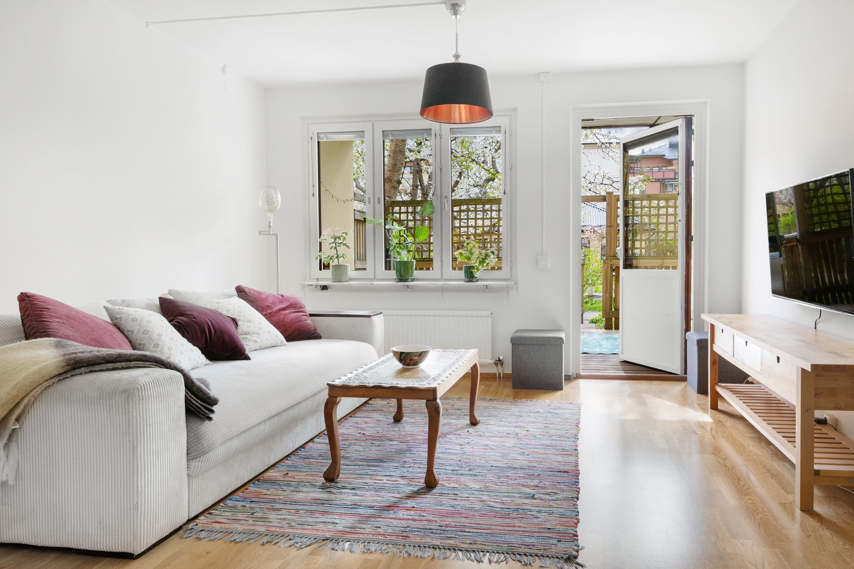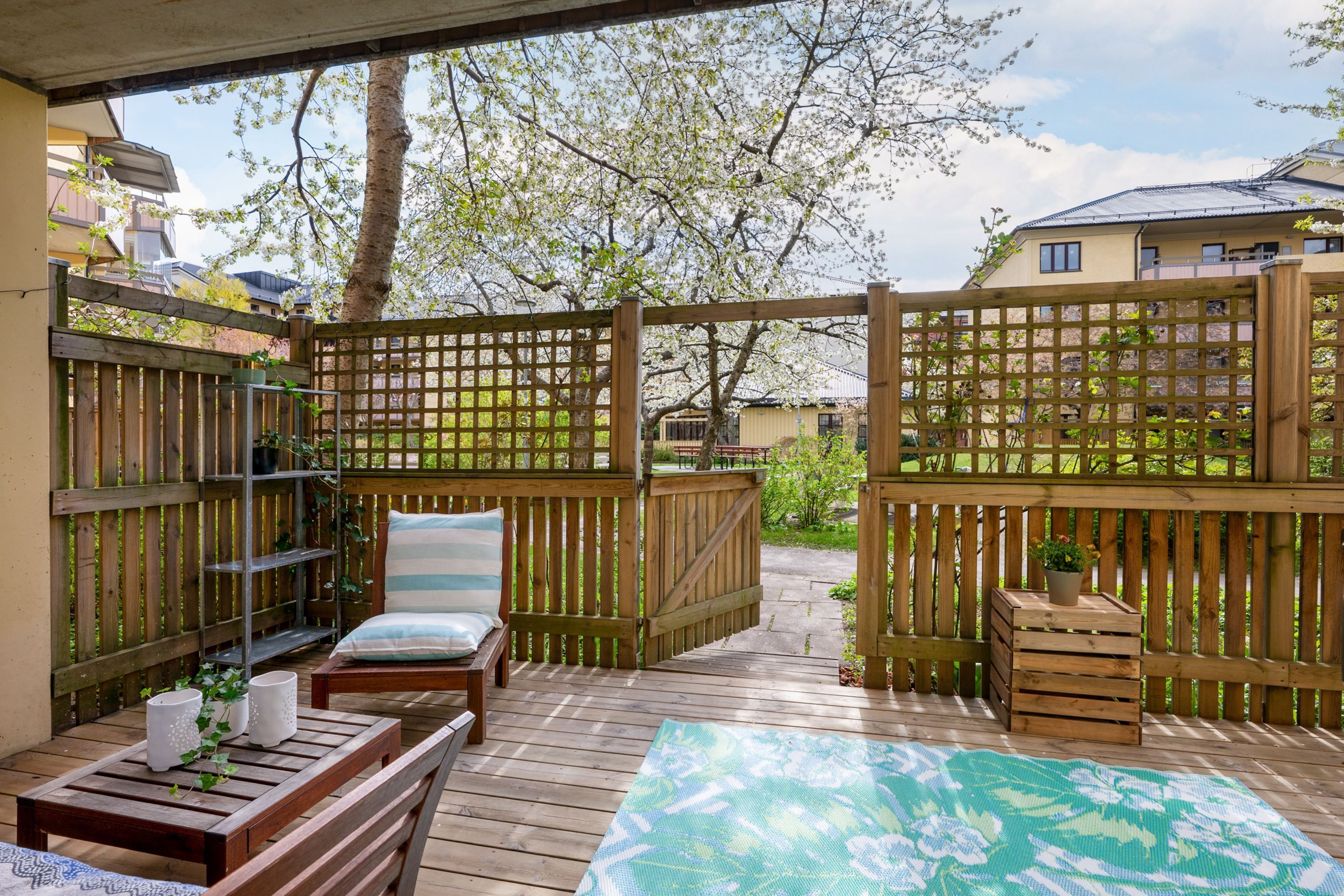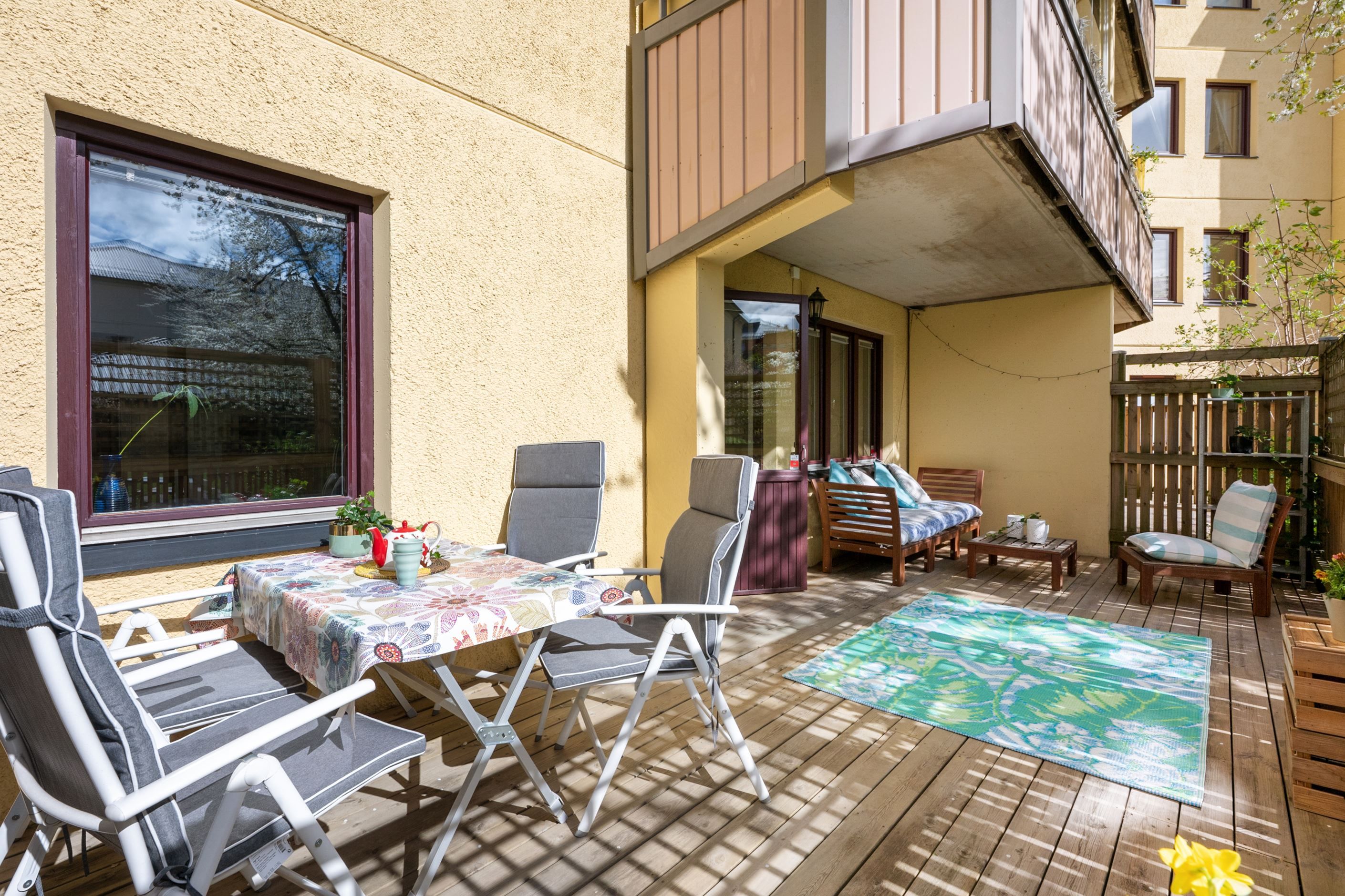 Det lättmöblerade vardagsrummet har utgång till den väl tilltagna och trallbelagda uteplatsen som vetter mot innergården med ett attraktivt solläge i sydväst för härliga solstunder från lunch till tidig kväll.