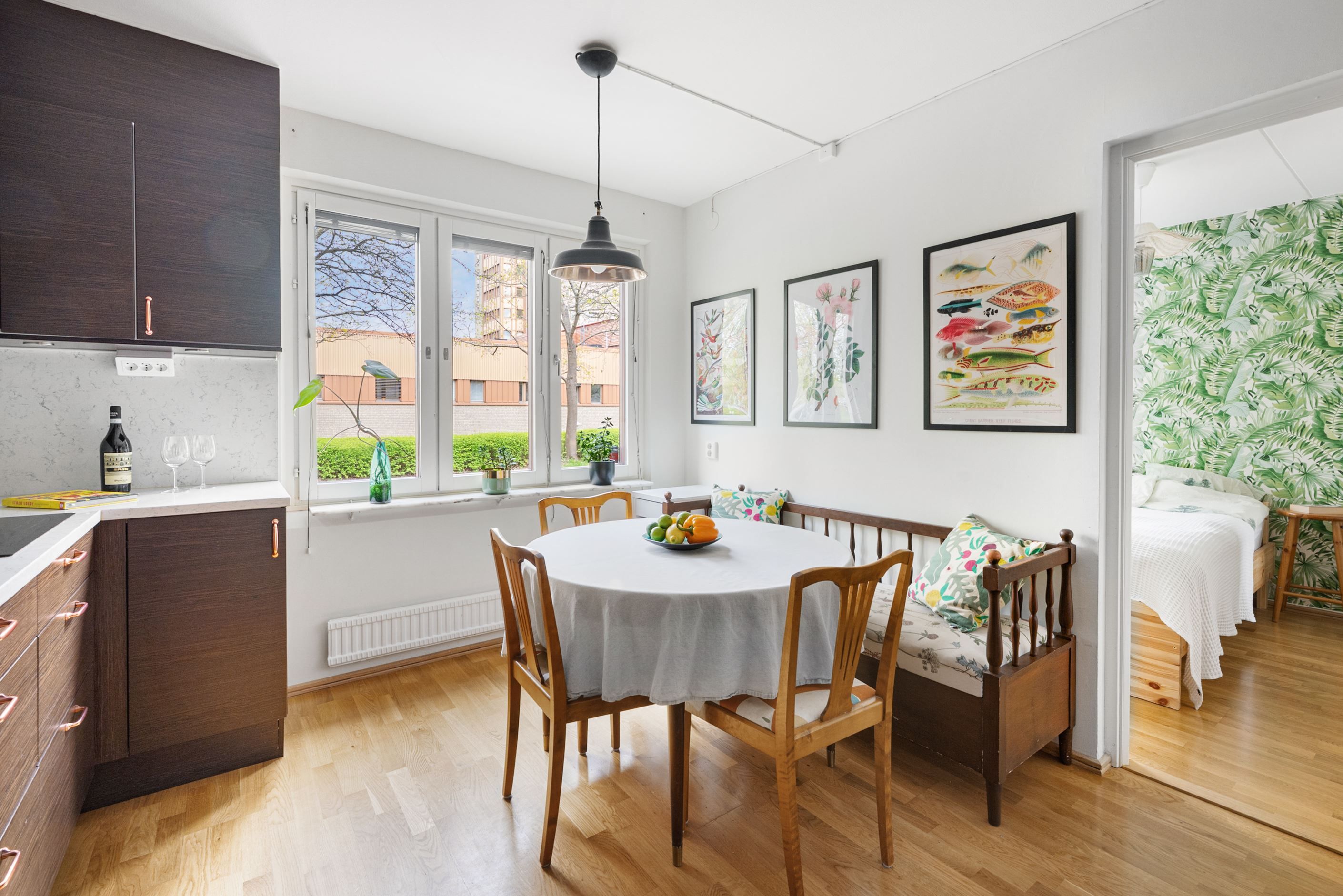 Köket är även det stilrent renoverat och komplett utrustat samt erbjuder matplats för 4–6 personer.