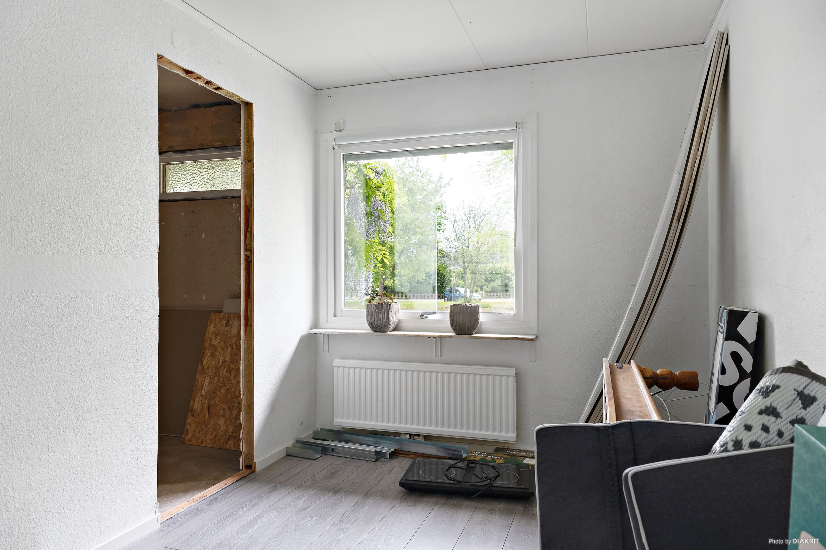 På entréplanet finns tre sovrum, varav ett har direkt tillgång till ett planerat badrum. Här är installationerna redan klara och inredningen inköpt – det som återstår är kakel, klinker och montering. Vid hallen finns även en praktisk gäst-wc.