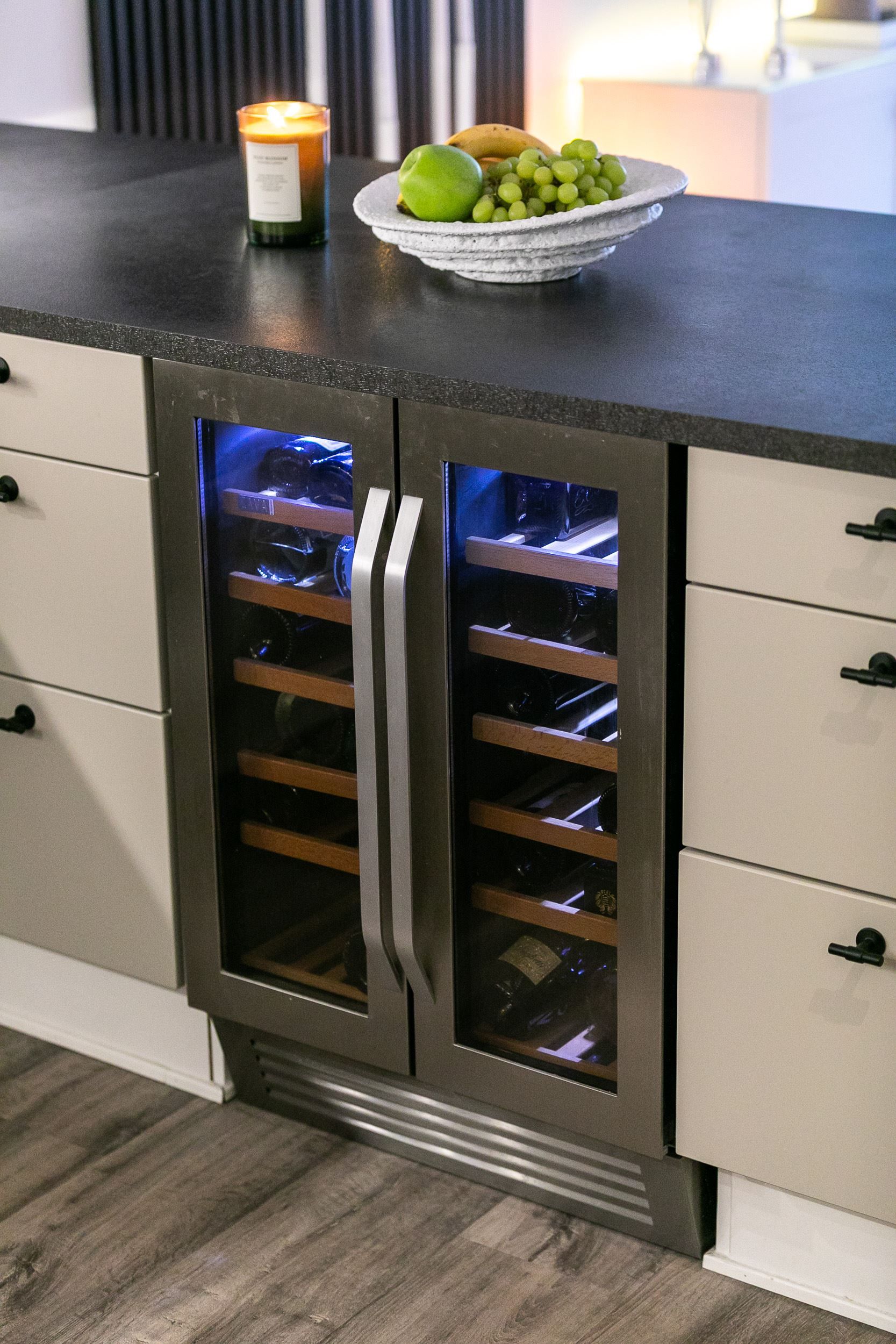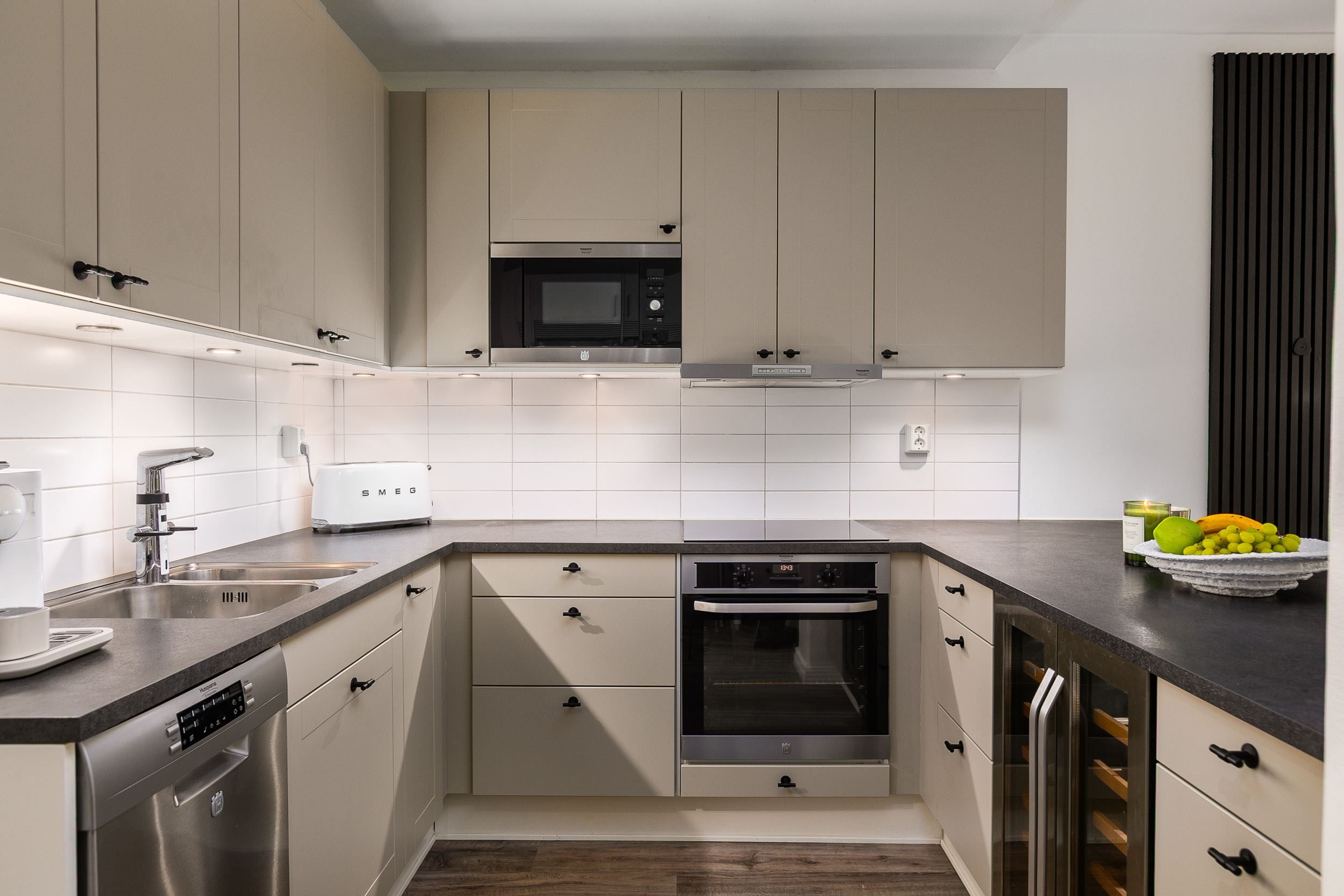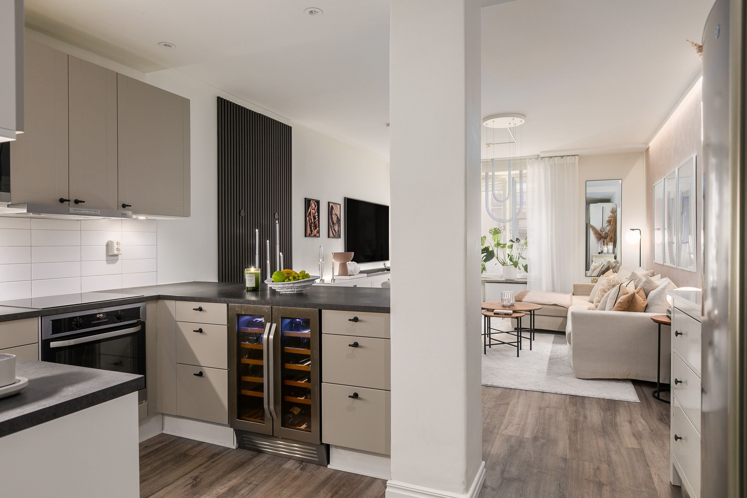 Lägenheten erbjuder en öppen och social planlösning mellan kök och vardagsrum. Det moderna köket är fullt utrustat med integrerade vitvaror och generösa arbetsytor, perfekt för både vardagsmatlagning och middagar med vänner.