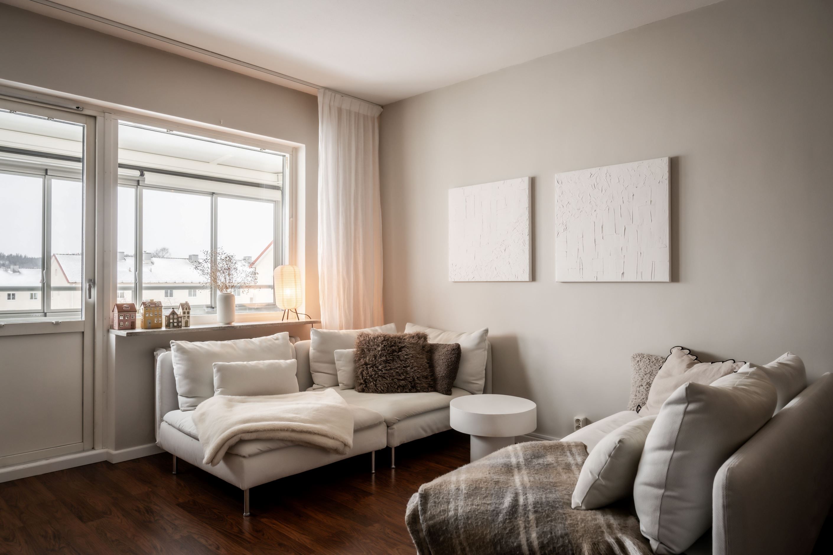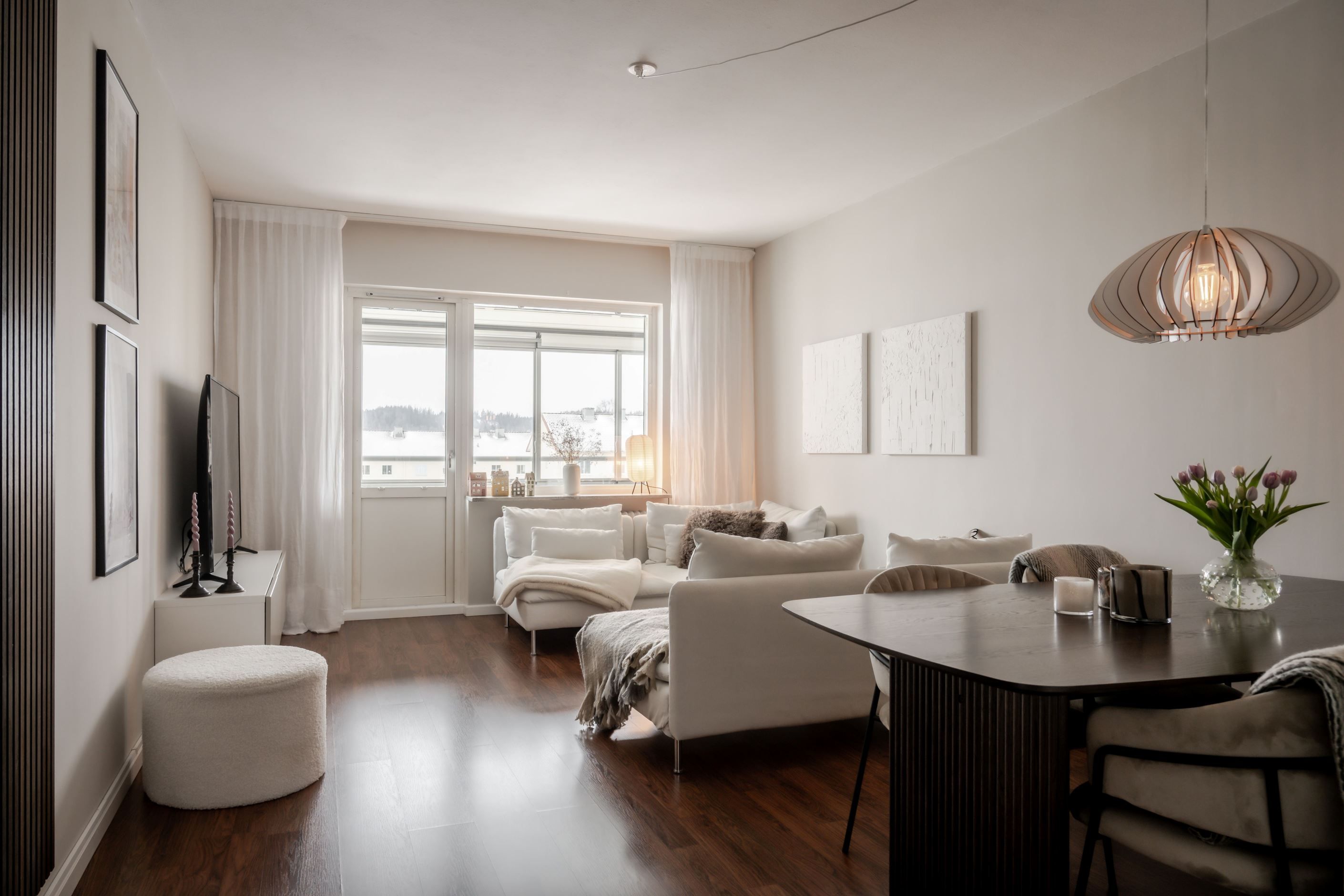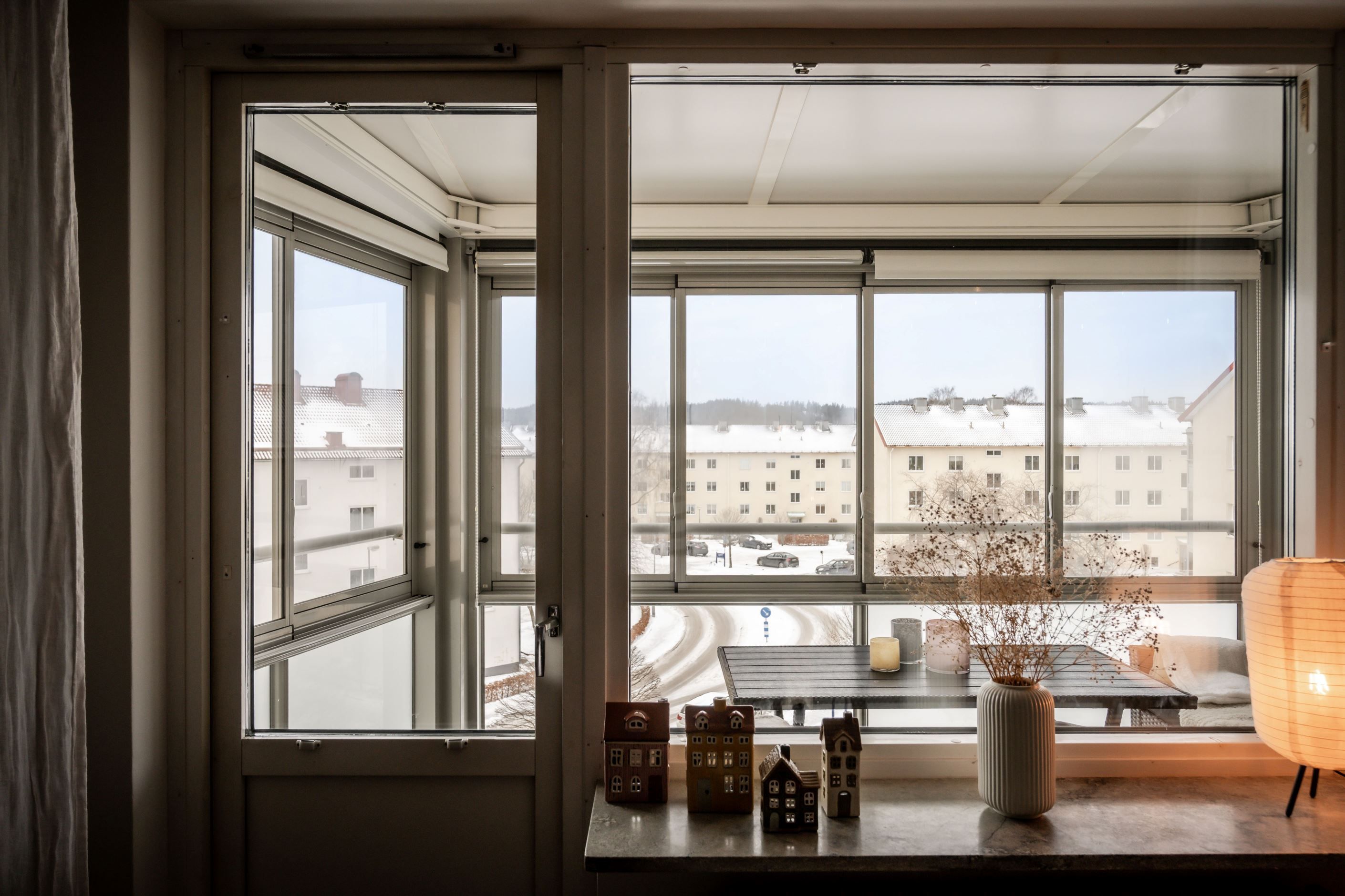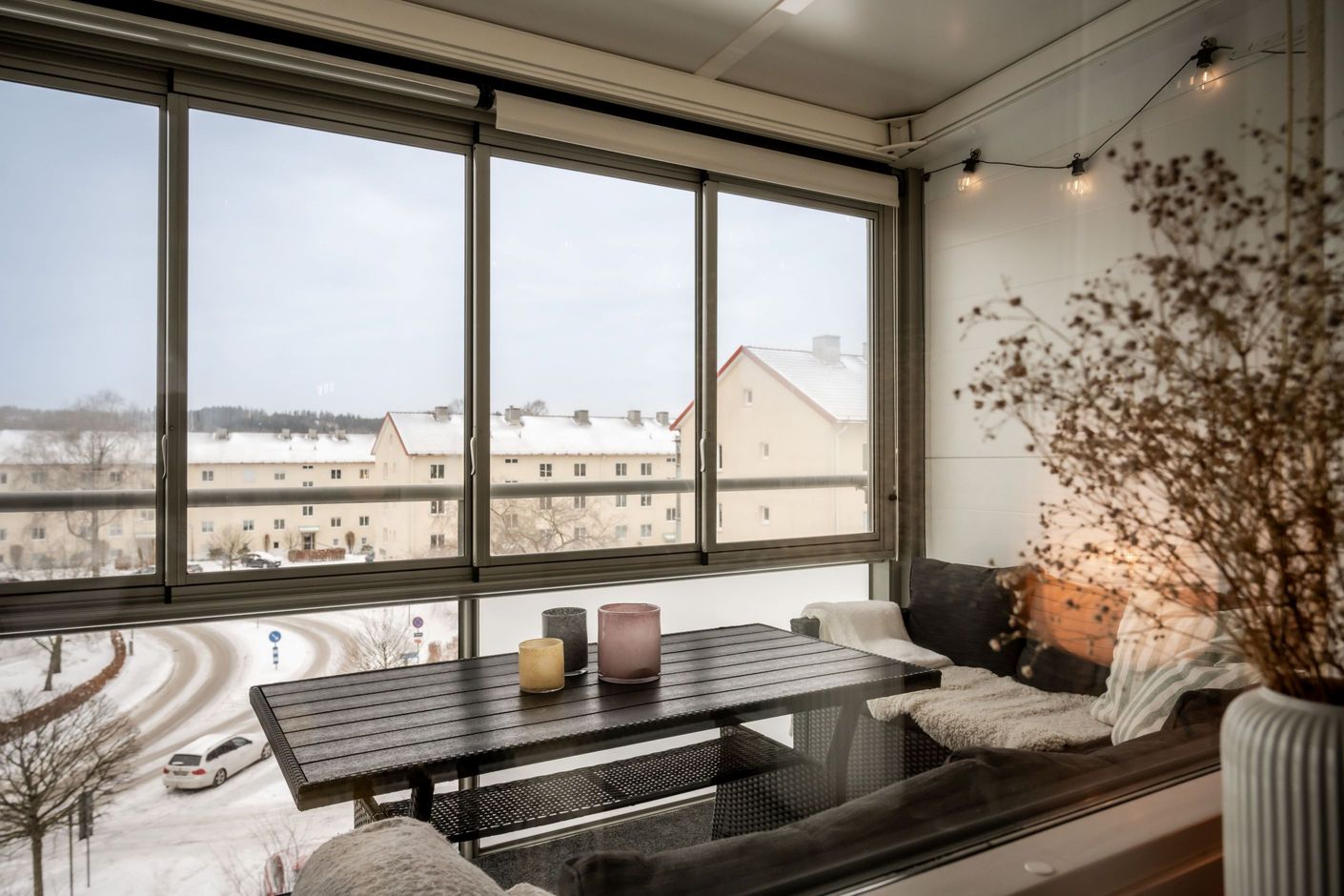 Den inglasade balkongen blir snabbt en favoritplats. Med sitt soliga sydvästläge får du sol från lunch till kväll, och tack vare inglasningen kan ytan användas stora delar av året – perfekt för både avkoppling och sociala stunder utan insyn.