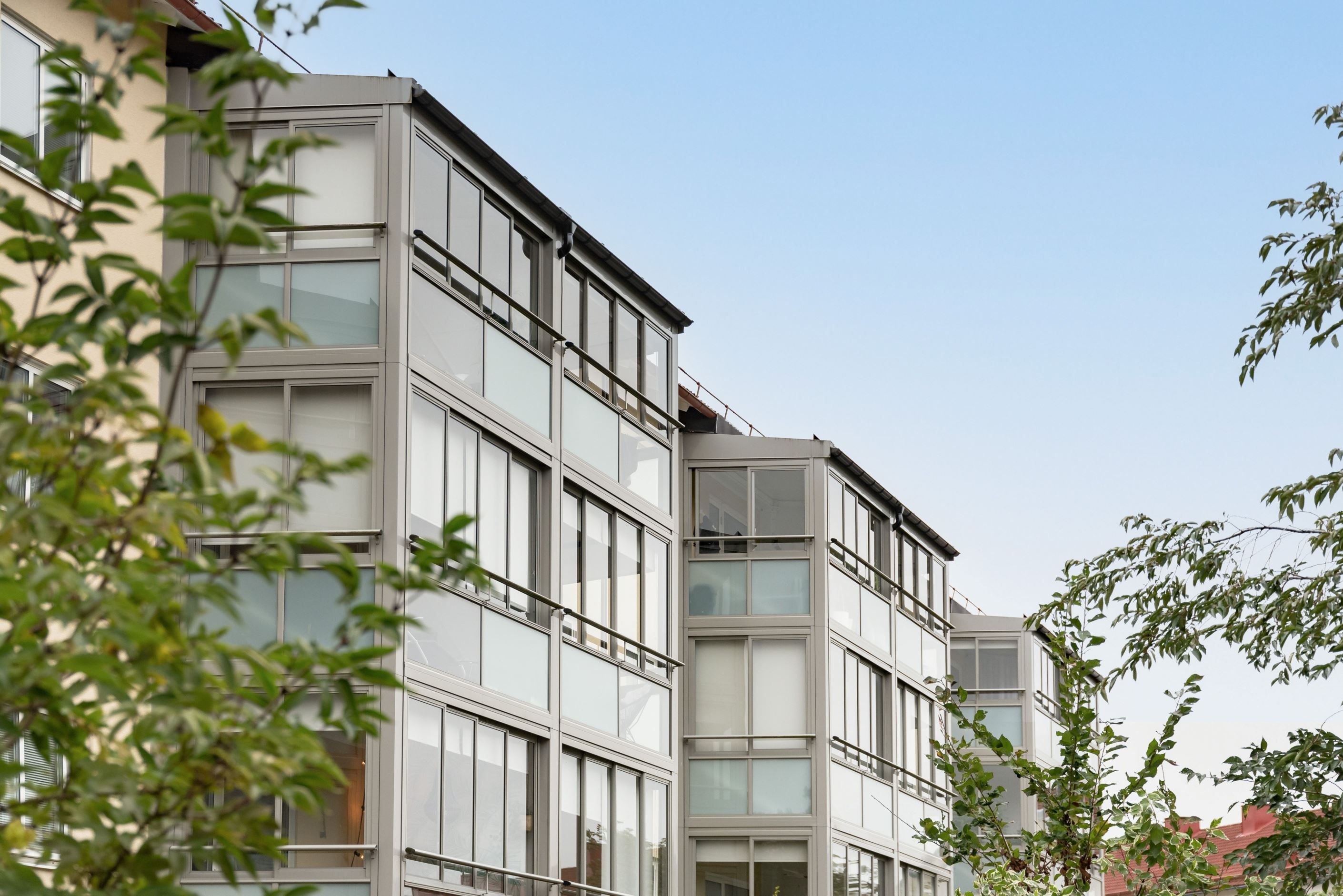 * är den totala månadsavgiften inklusive obligatoriska tillägg. Grundavgiften är 2 555 kr där V/A ingår samt att det tillkommer obligatoriska tillägg på 864 kr för värme, 400 kr för balkonginglasning och 201 kr för TV och bredband.