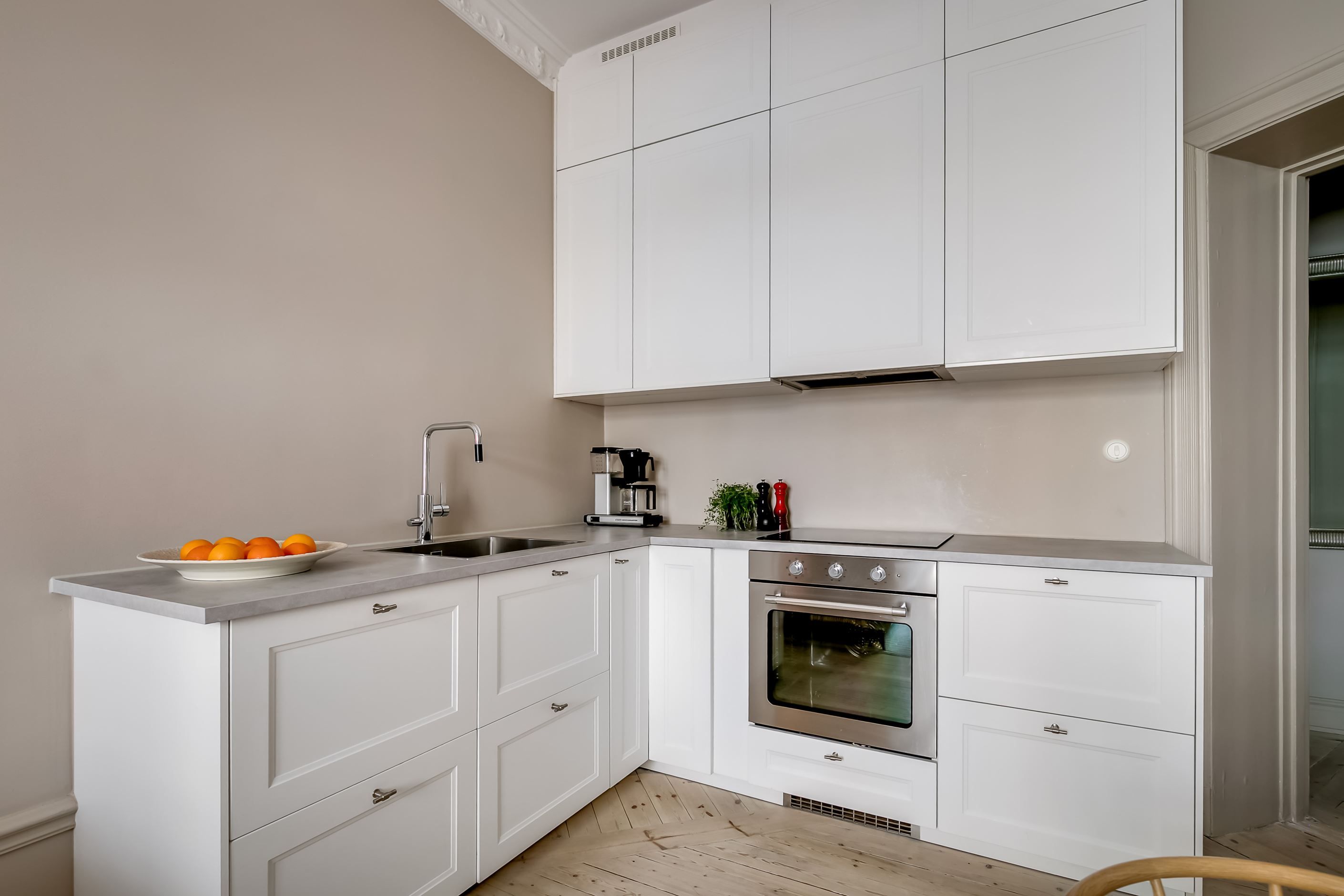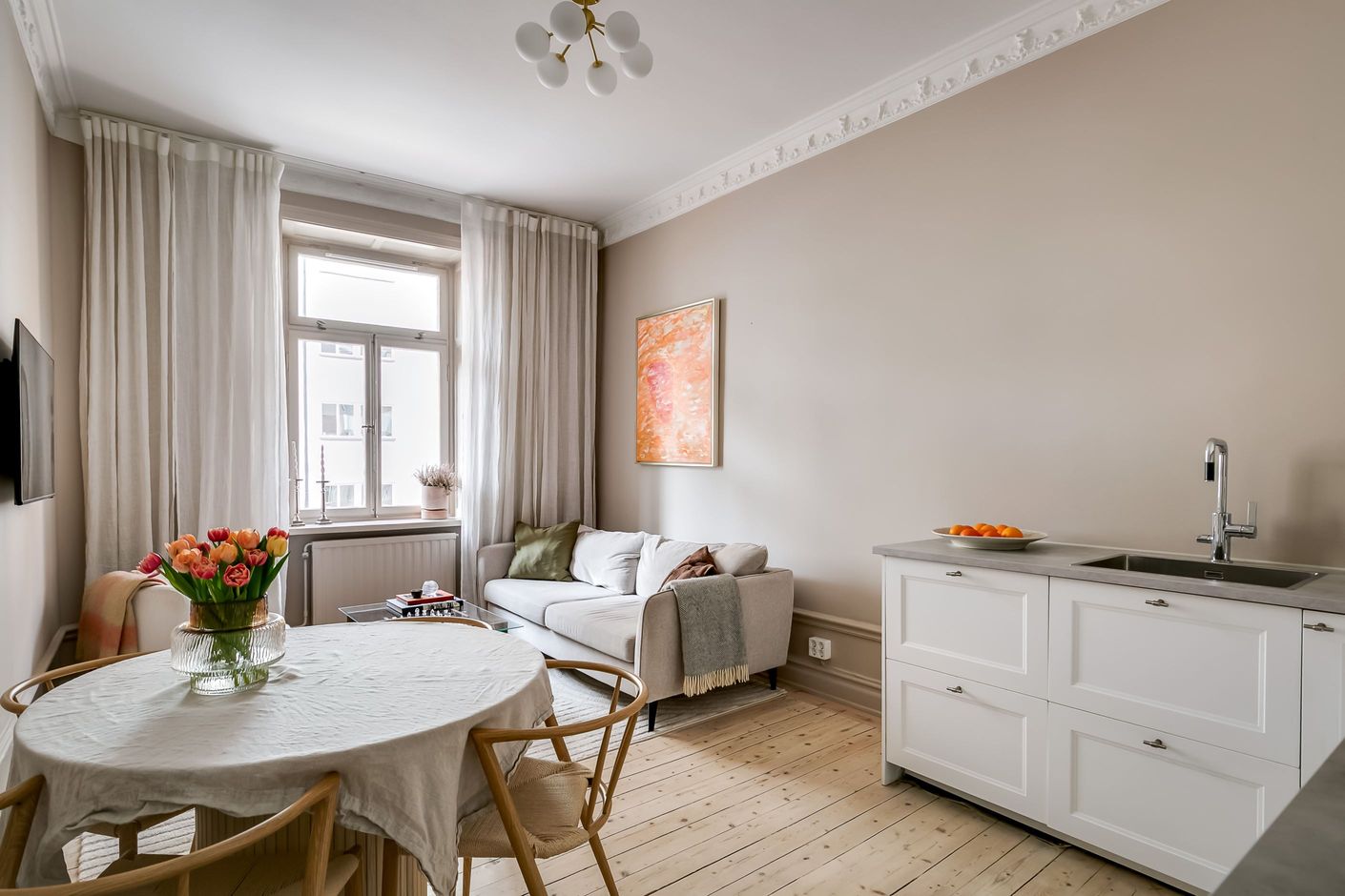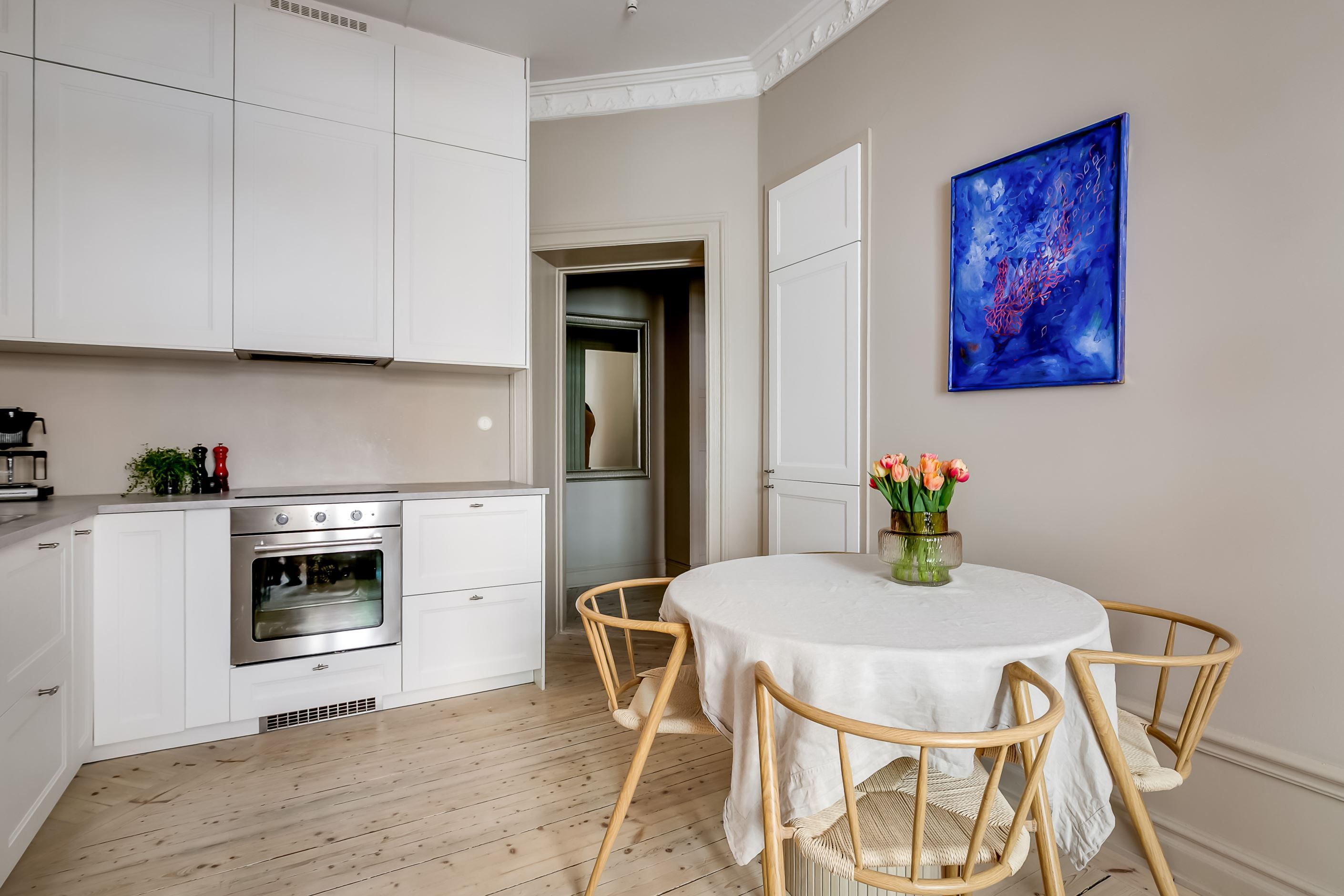 Redan när du kliver in möts du av den där svårslagna sekelskifteskaraktären: generös takhöjd, pampig stuckatur, vacker takrosett, höga golvsocklar och stora, höga tidsenliga fönster som låter ljuset flöda in. De vackra trägolven löper genom bostaden och skapar en varm och enhetlig känsla.