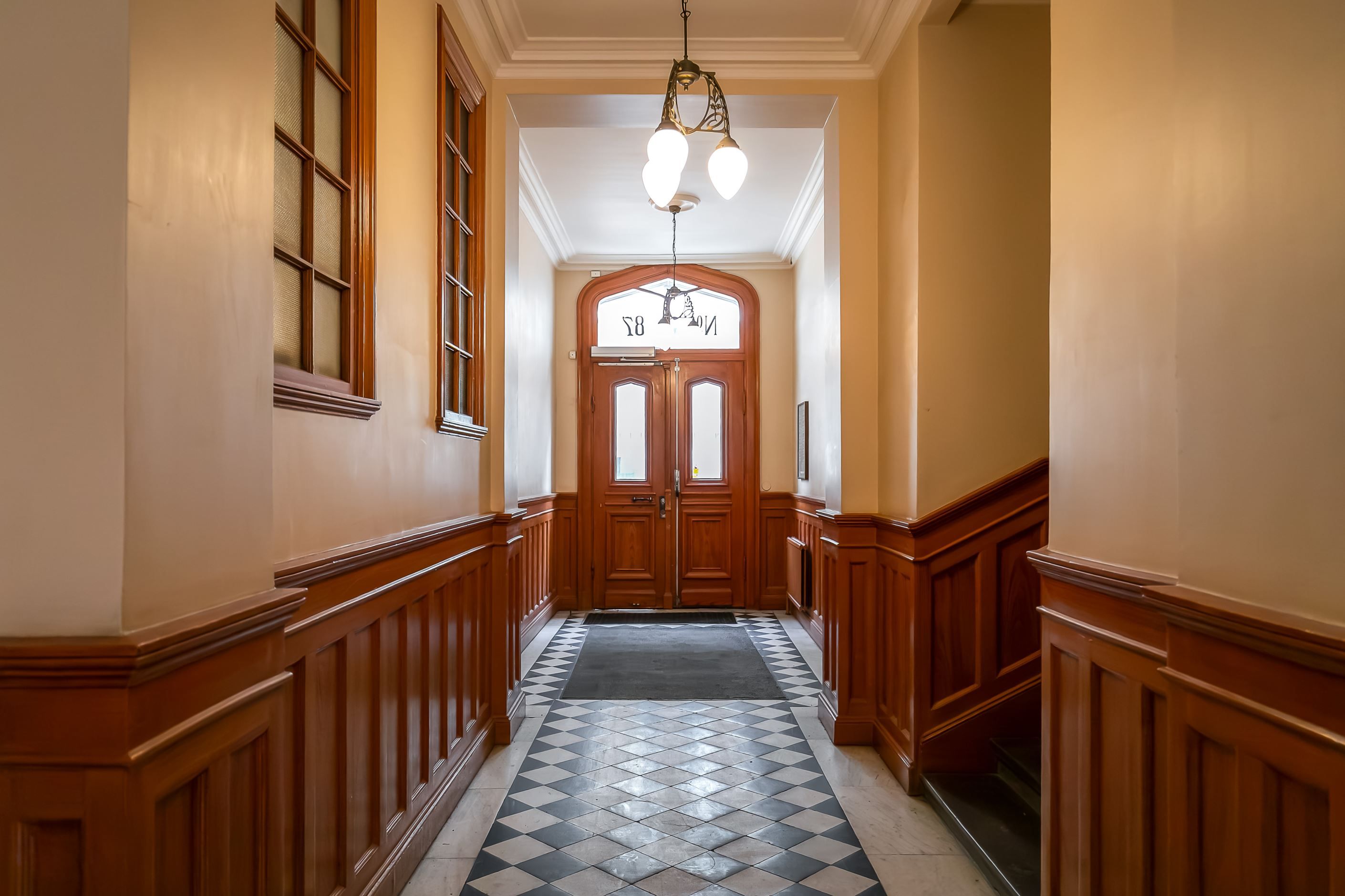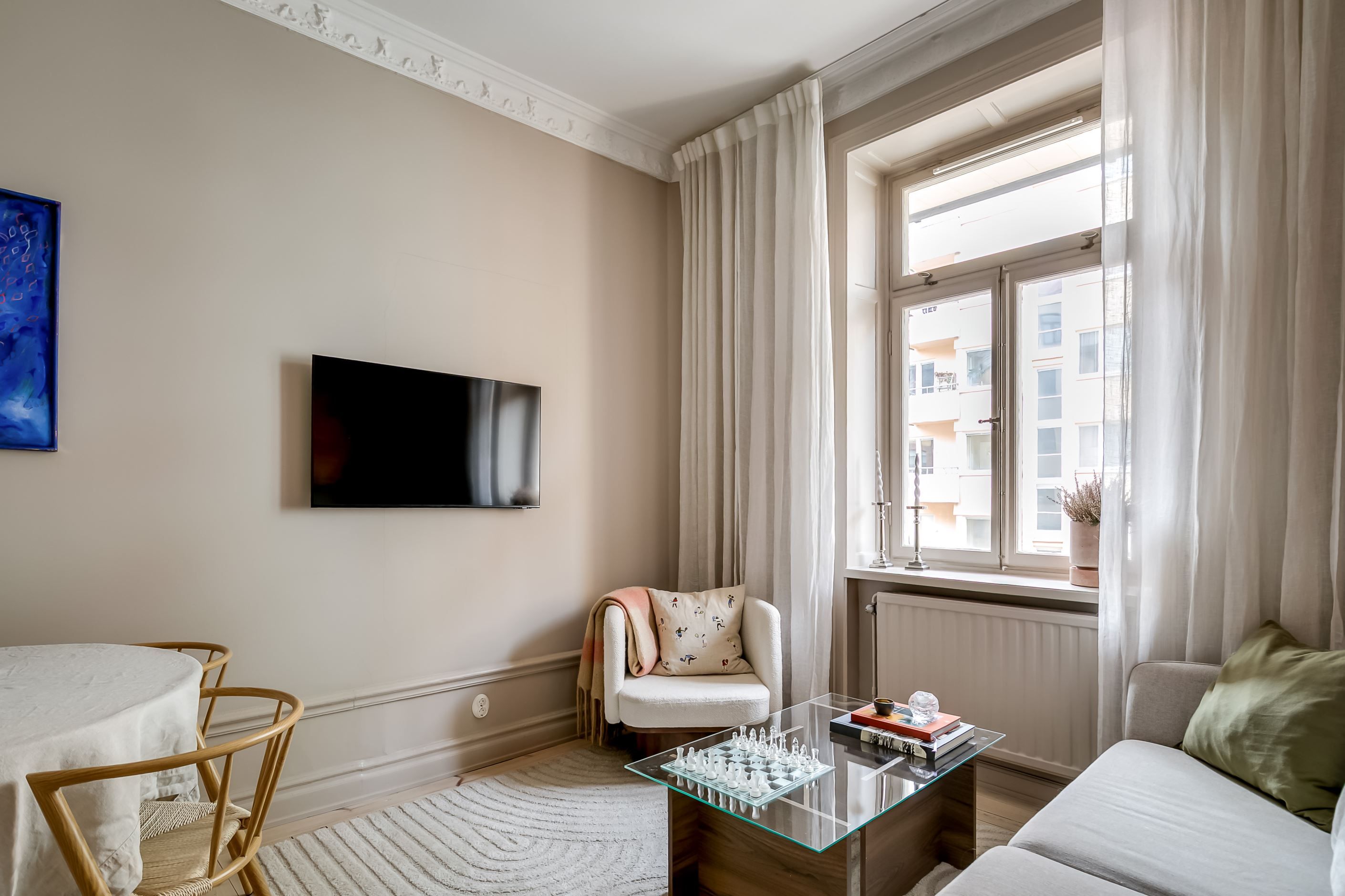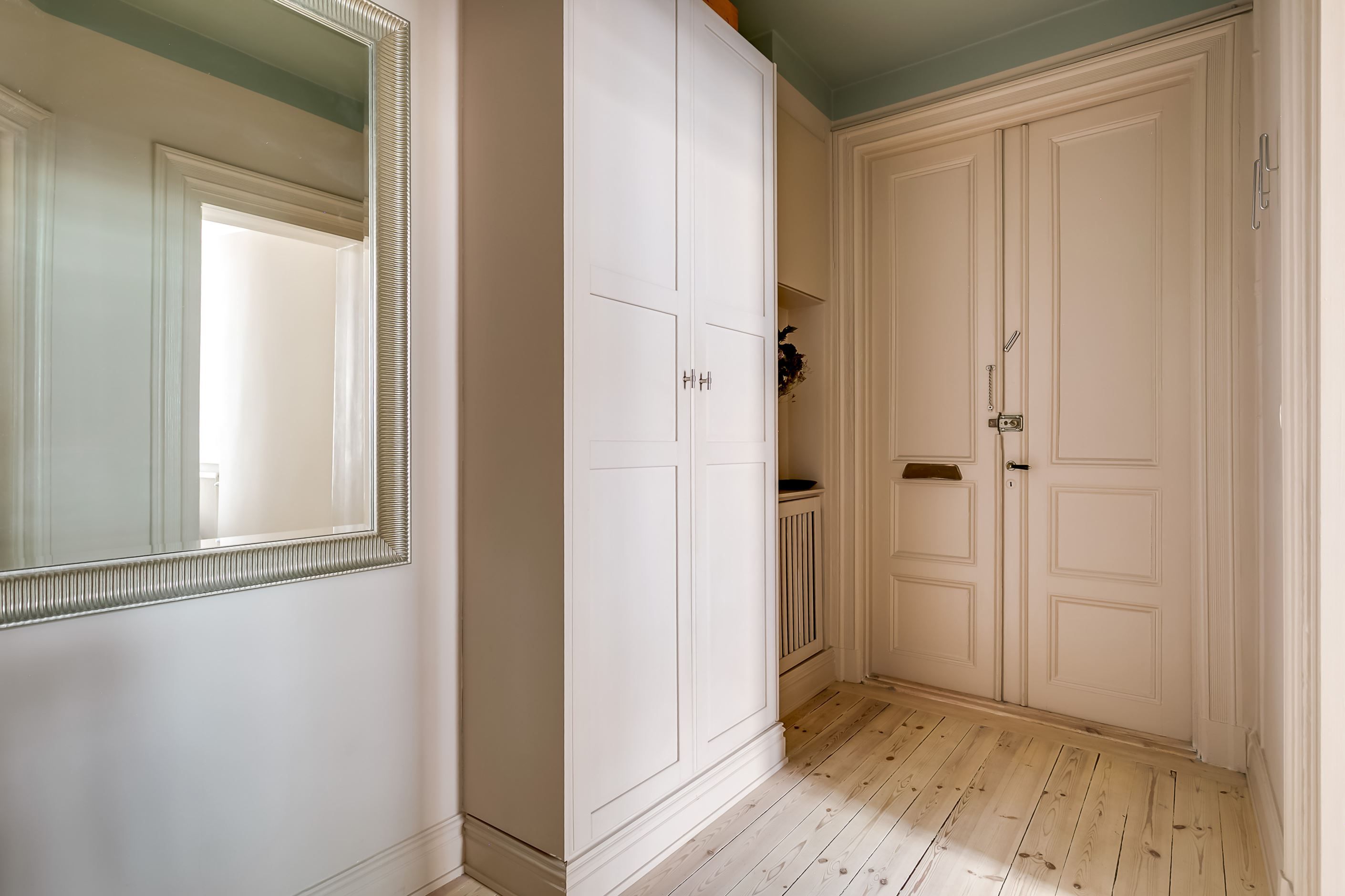 Lägenheten är belägen i gårdshuset, vilket skapar en ovanligt tyst och privat atmosfär – en sällsynt oas mitt i stadens puls. Via en grönskande innergård når du det vackra trapphuset som leder upp till bostaden, en entré som sätter tonen redan från första steget.