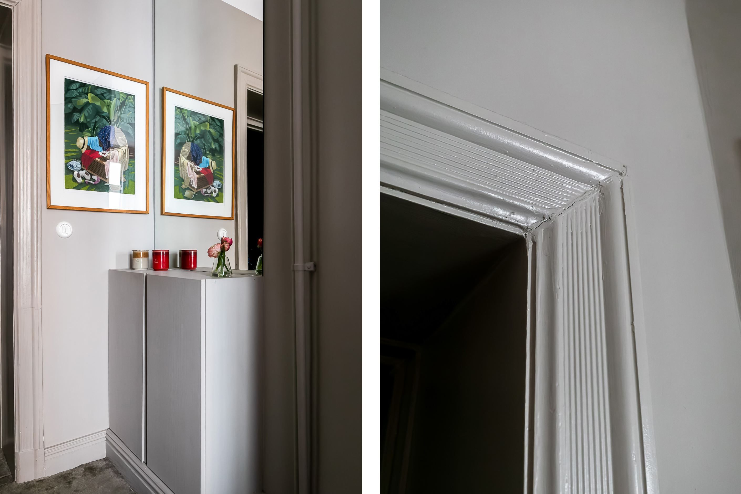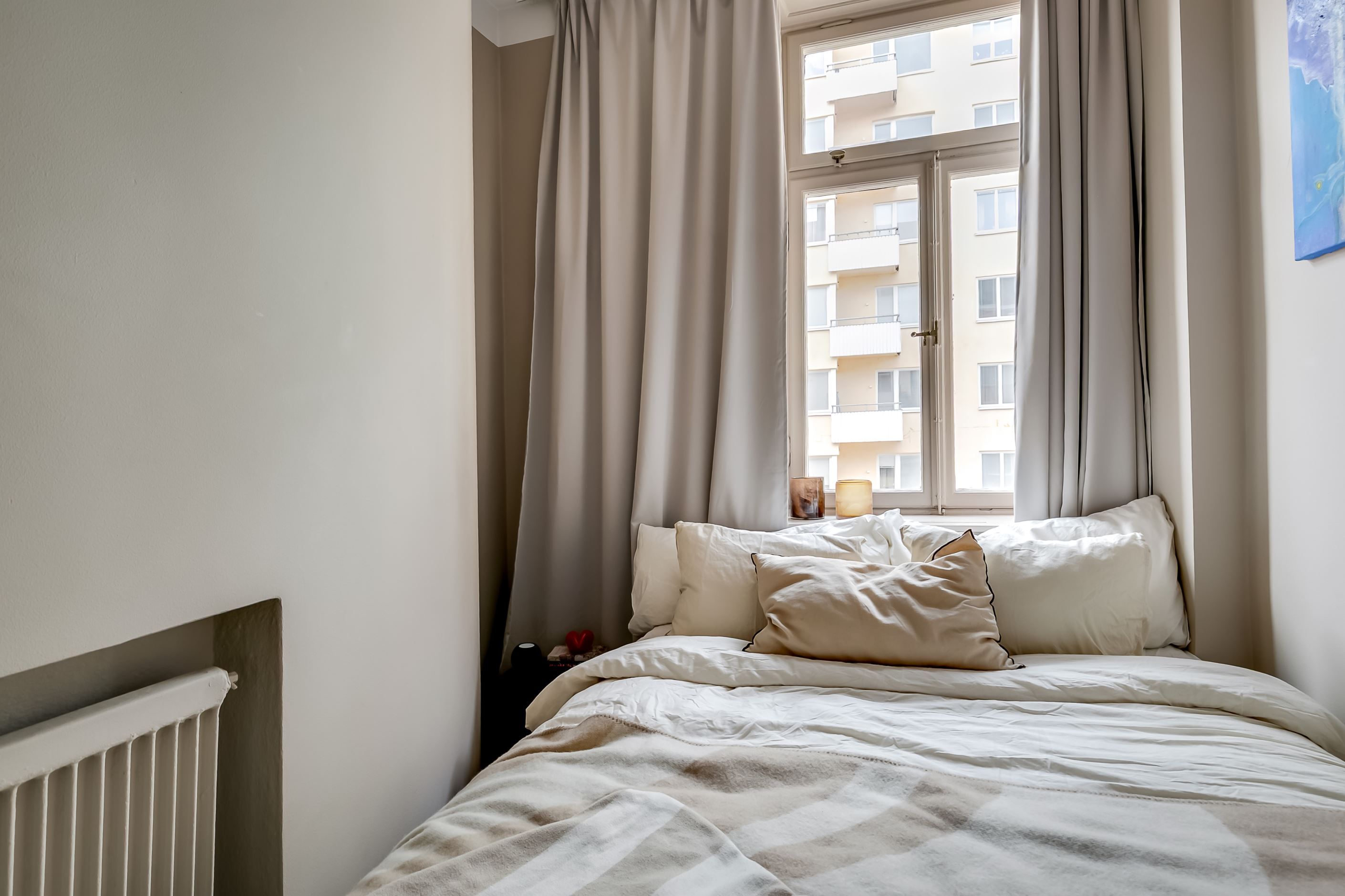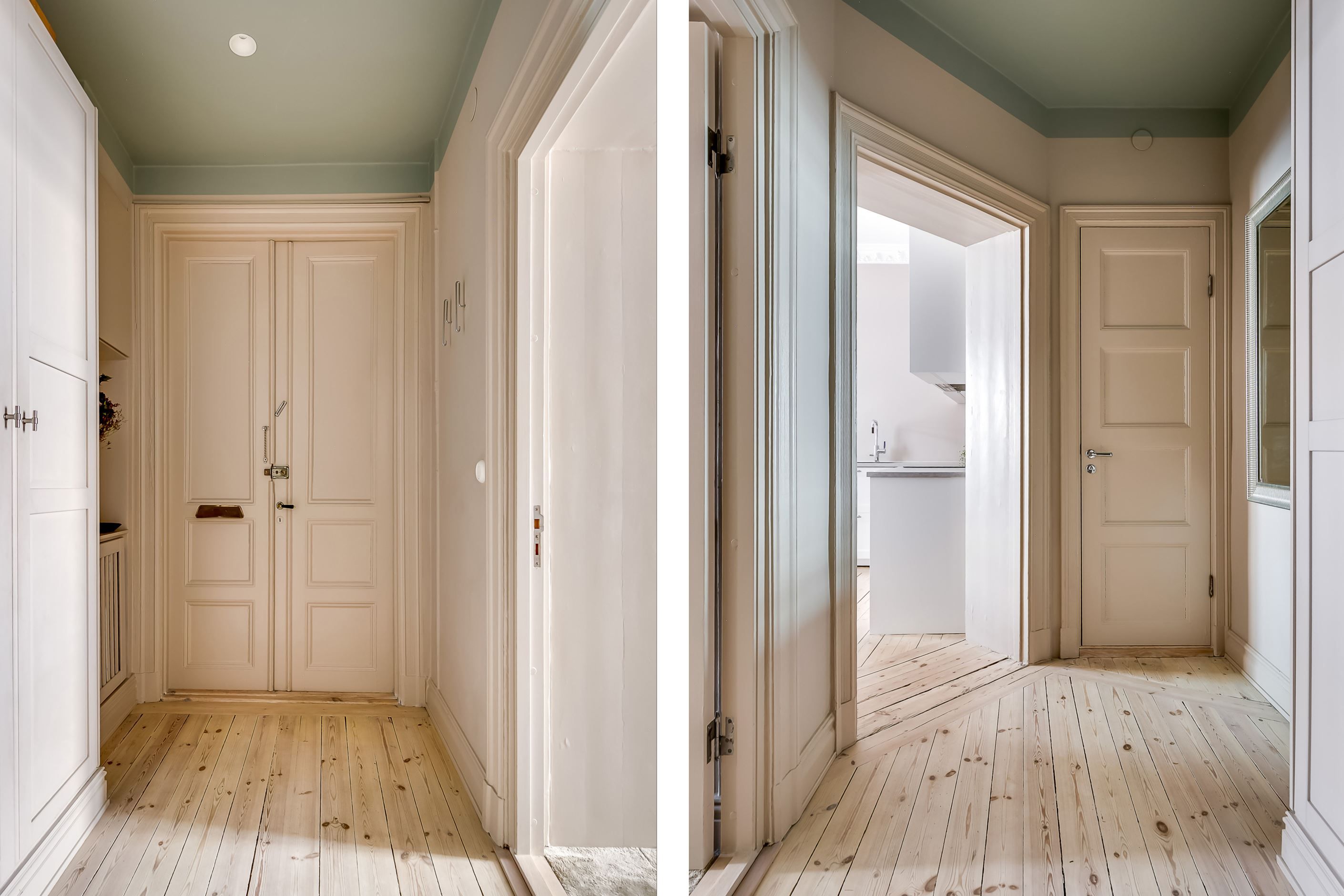 Lägenheten är belägen i gårdshuset, vilket skapar en ovanligt tyst och privat atmosfär – en sällsynt oas mitt i stadens puls. Via en grönskande innergård når du det vackra trapphuset som leder upp till bostaden, en entré som sätter tonen redan från första steget.