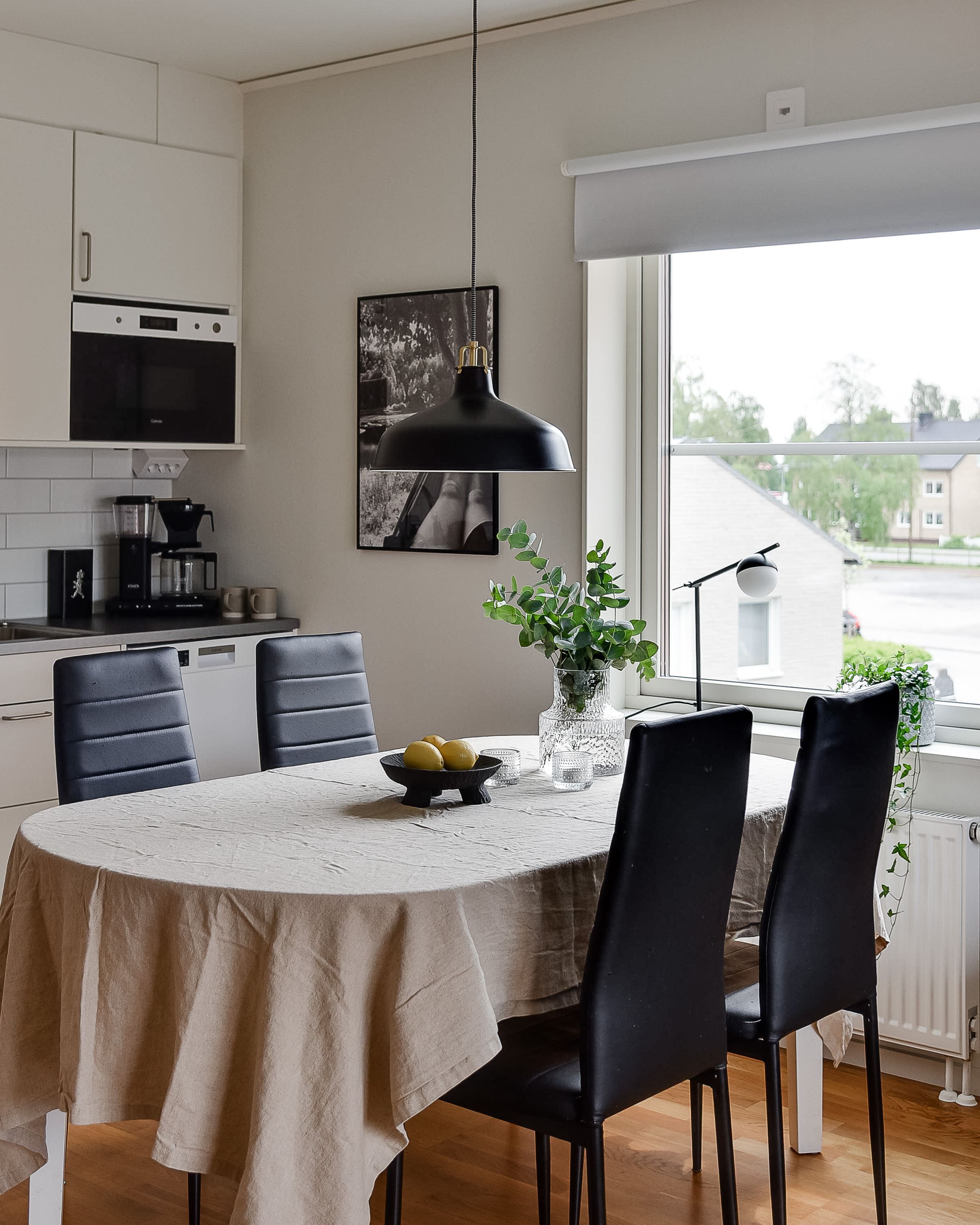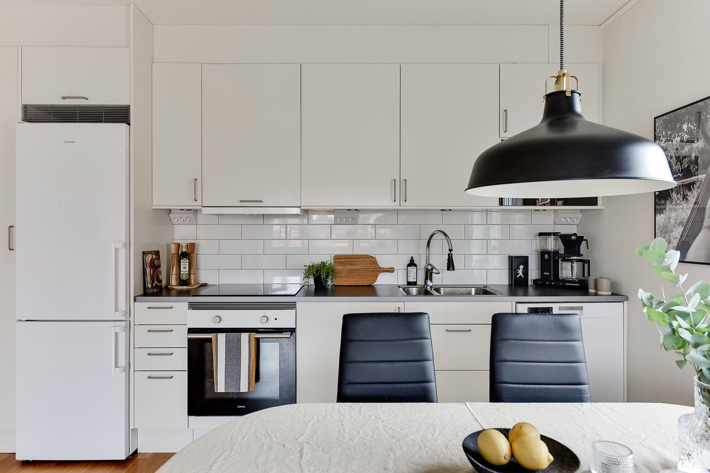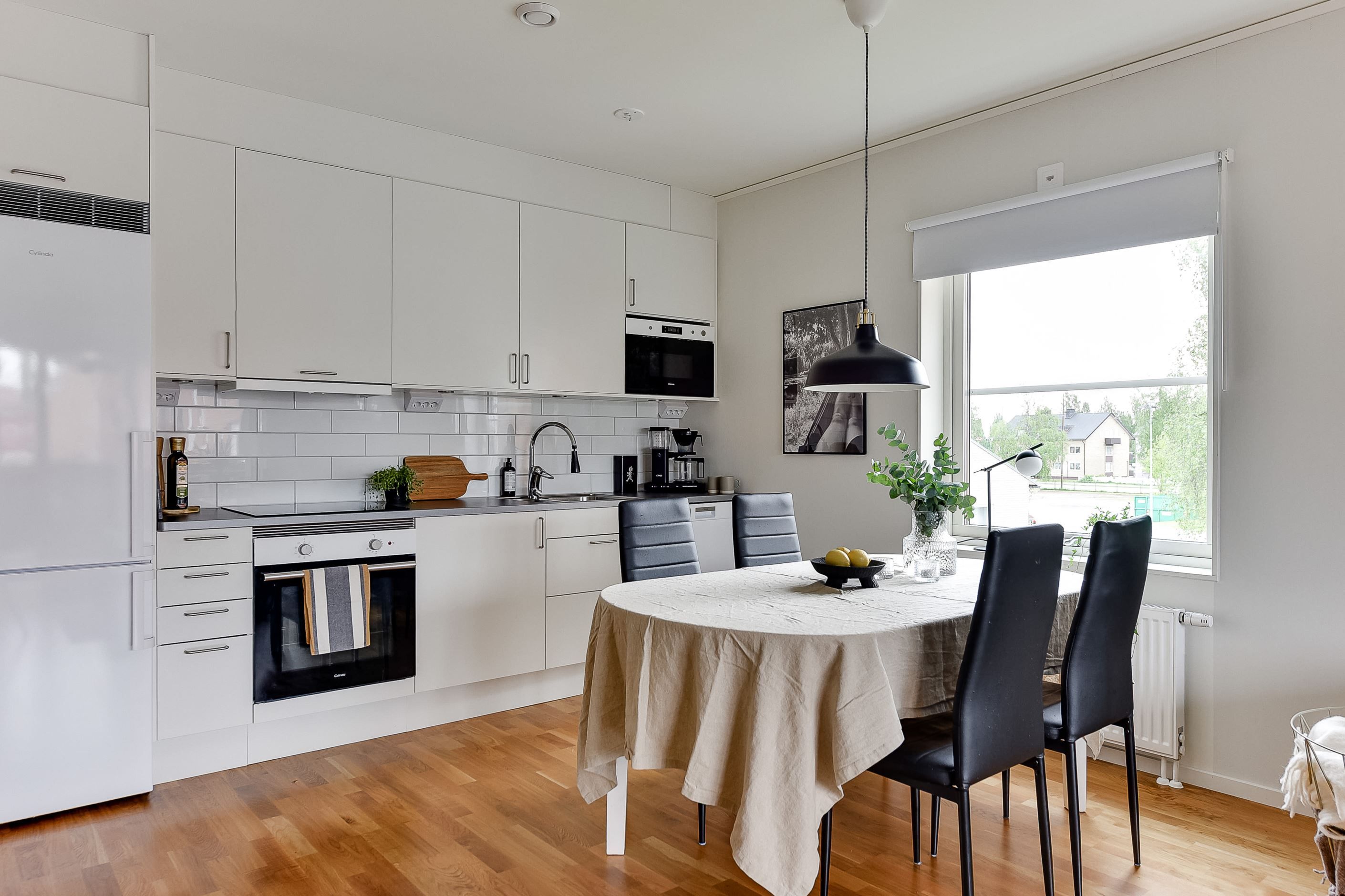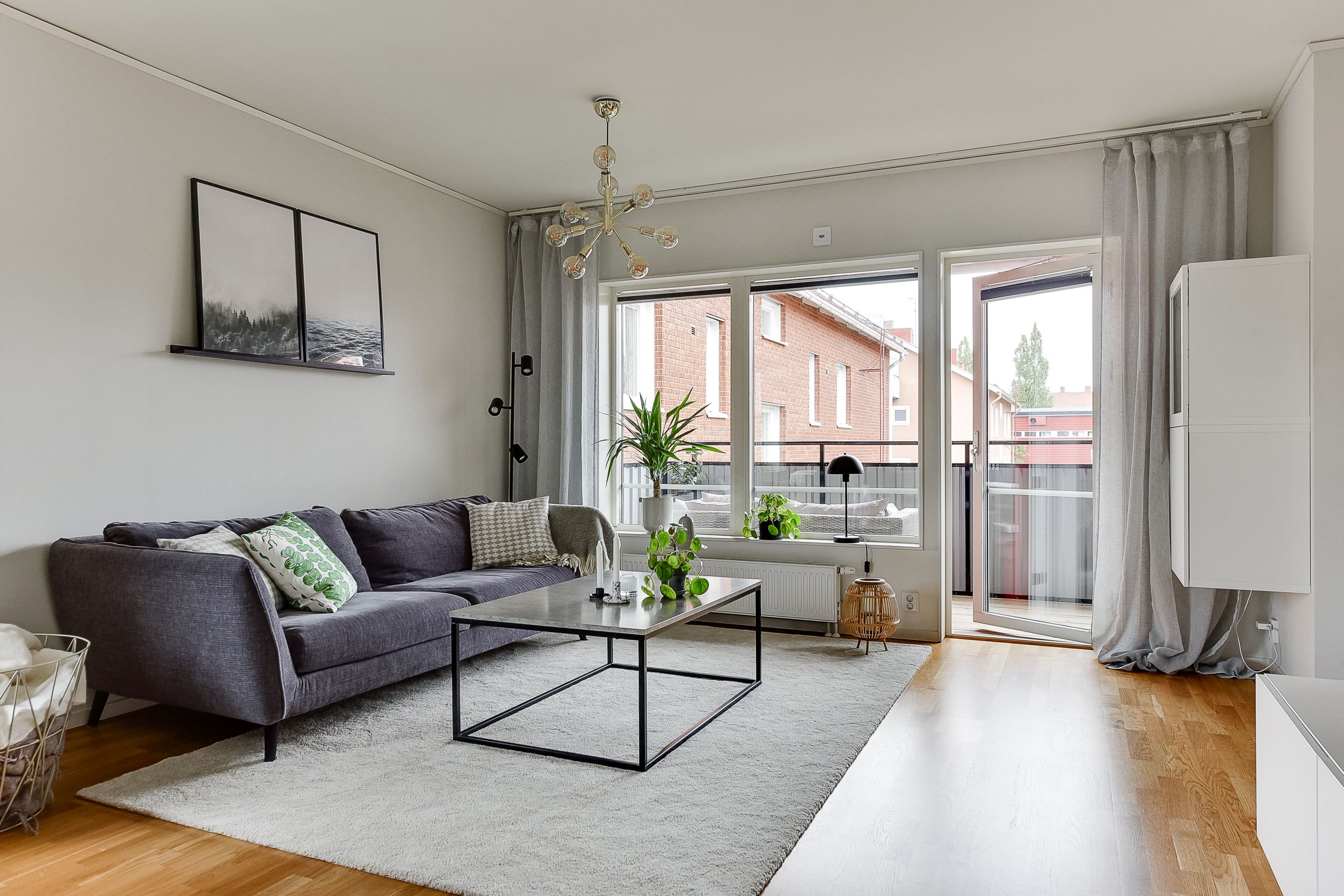Bostaden präglas av ett gavelläge som tillsammans med den öppna planlösningen mellan kök och vardagsrum ger ett generöst ljusflöde och en tydlig känsla av rymd. De stora fönsterpartierna förstärker den luftiga känslan och låter dagsljuset bli en naturlig del av inredningen. Köket är fullt utrustat och utformat i stilrena, tidlösa toner med genomtänkta materialval som håller över tid. Vardagsrummet är lätt att möblera och skapar en naturlig samlingsyta med direkt utgång till balkongen.