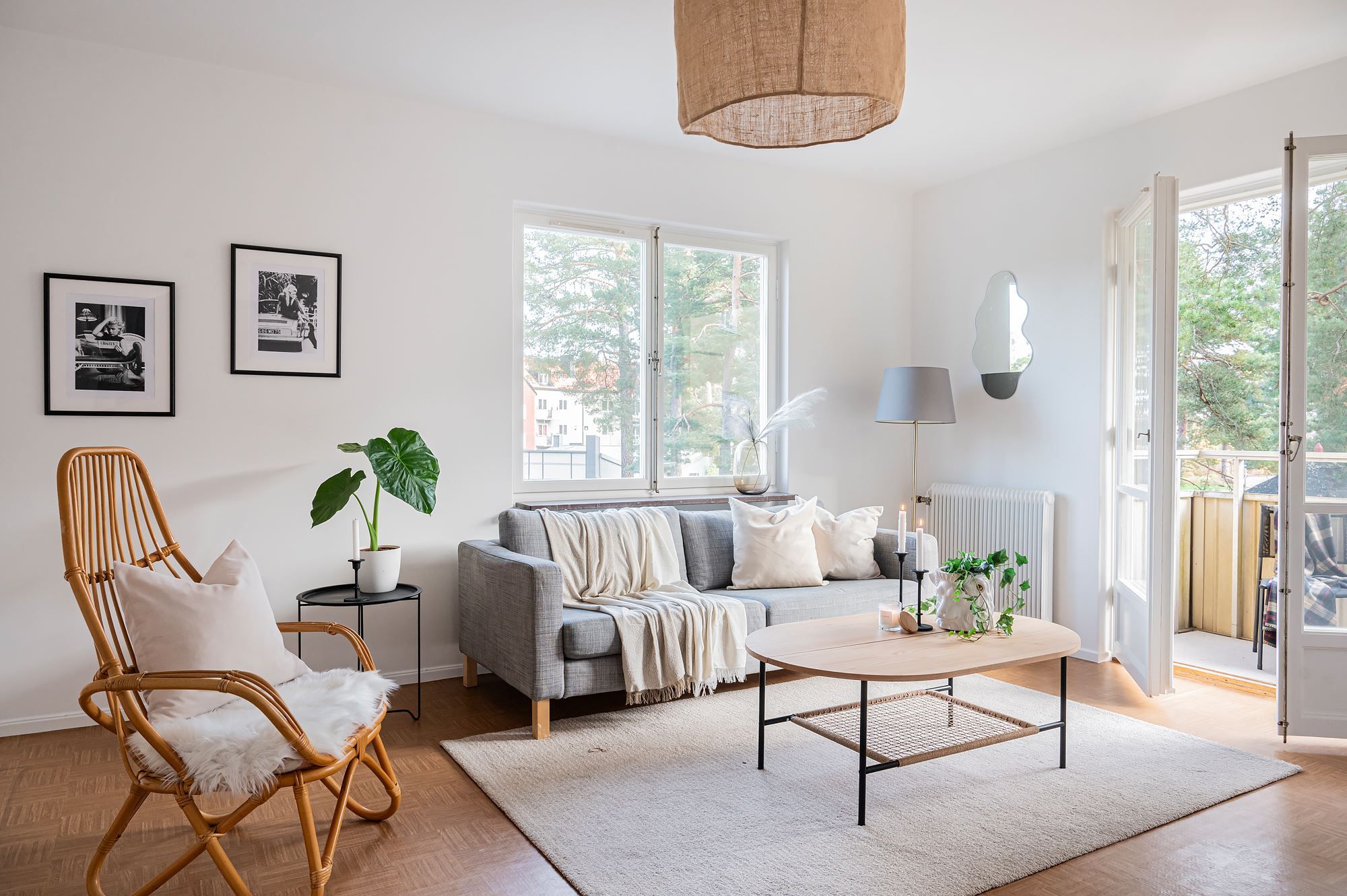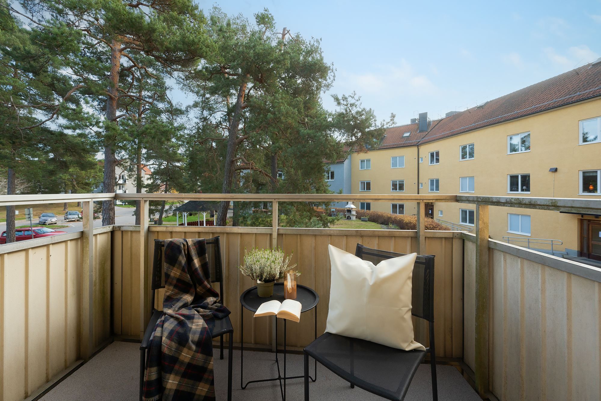 Rymligt kök med plats för matbord och yta att laga mat på. Ett luftigt vardagsrum med en mysig balkong i ett rofyllt läge mot innergården. Vardagsrummet går att inreda på flera sätt och ljuset flödar in från både balkongen och fönstren.