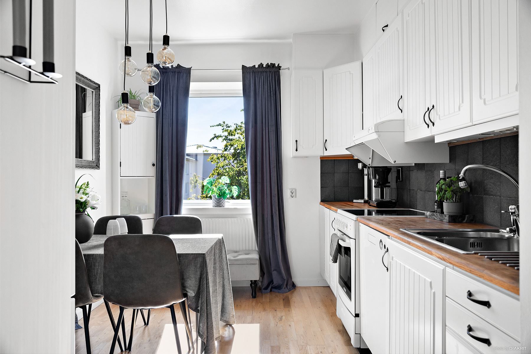 Bostaden har ett helkaklat modernt badrum med tvättmaskin samt ett charmigt kök med bl.a diskmaskin.