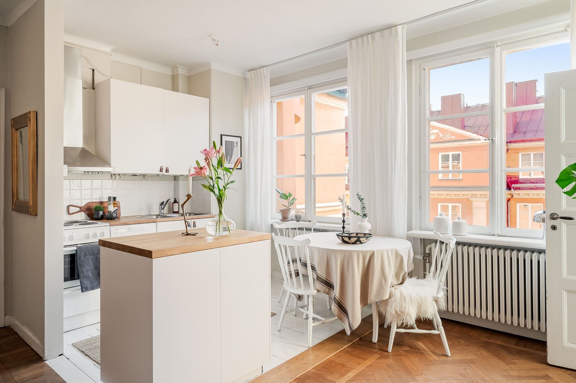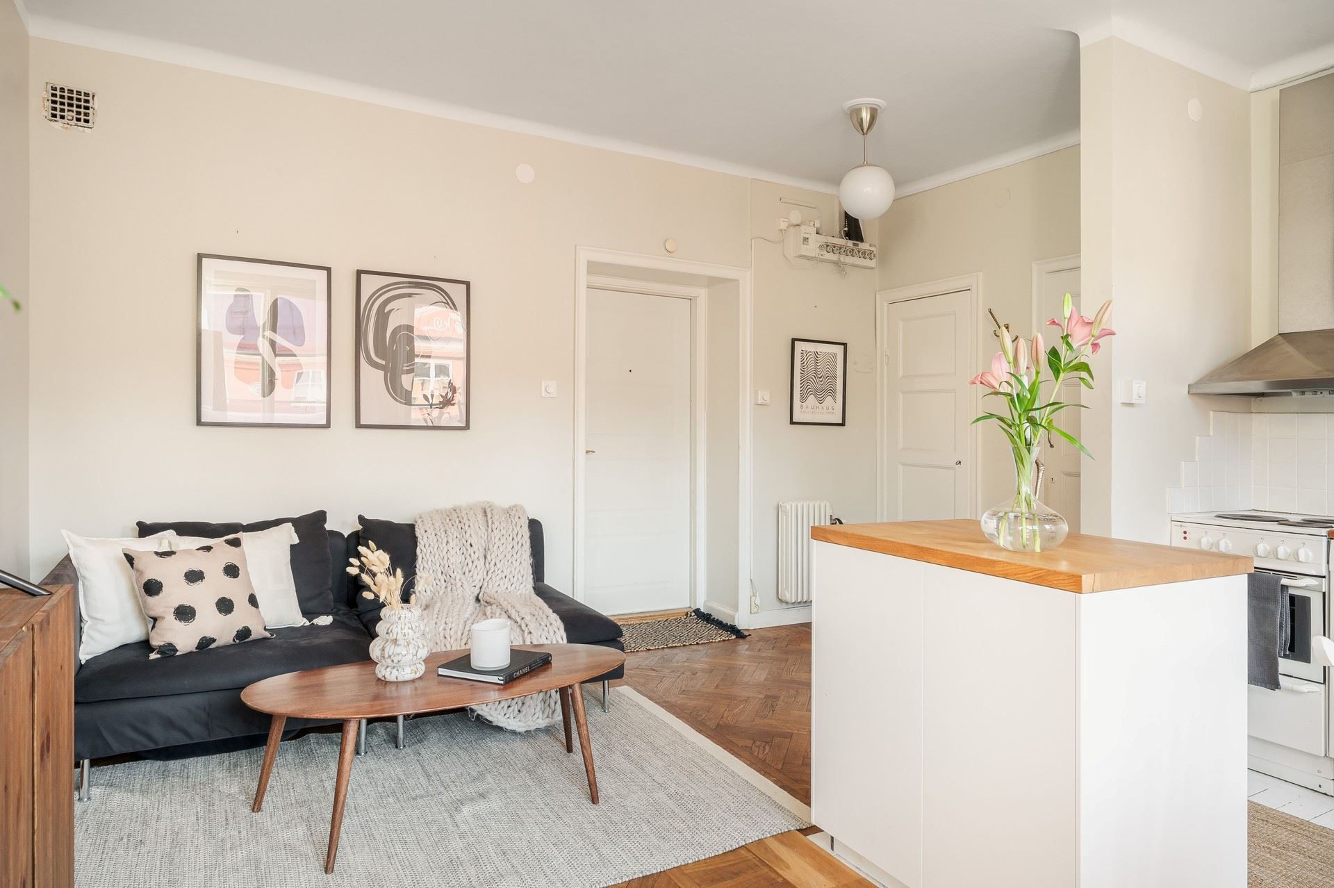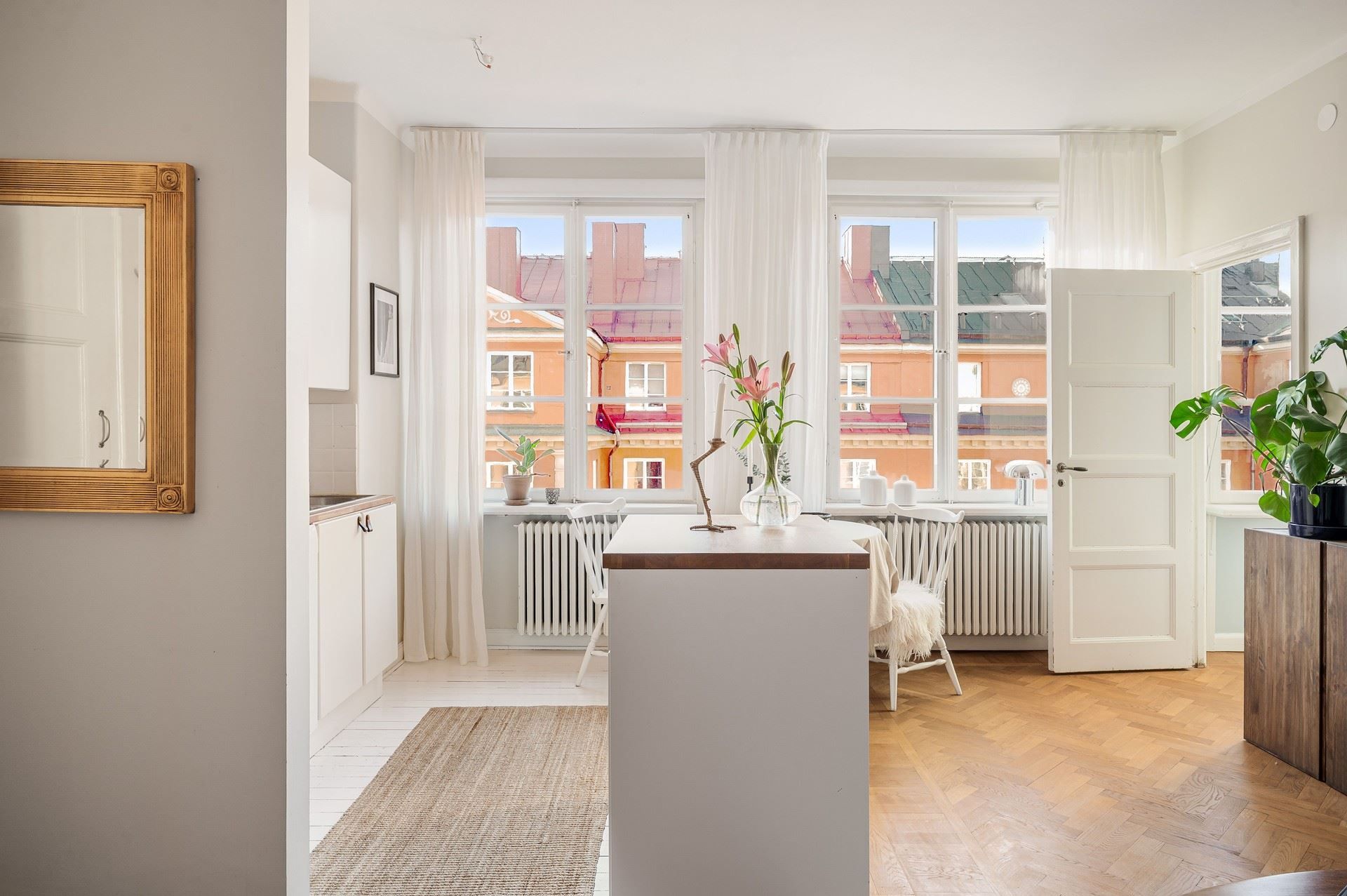 Den smart planerade bostaden erbjuder öppna och sociala ytor med plats för soffa, tv-bänk och matgrupp intill köksfönstret. Köksön fungerar som en naturlig avdelare och en självklar samlingspunkt. Det separata sovrummet rymmer en 1,60-säng och har ett högt placerat fönster mot en lugn tvärgata.