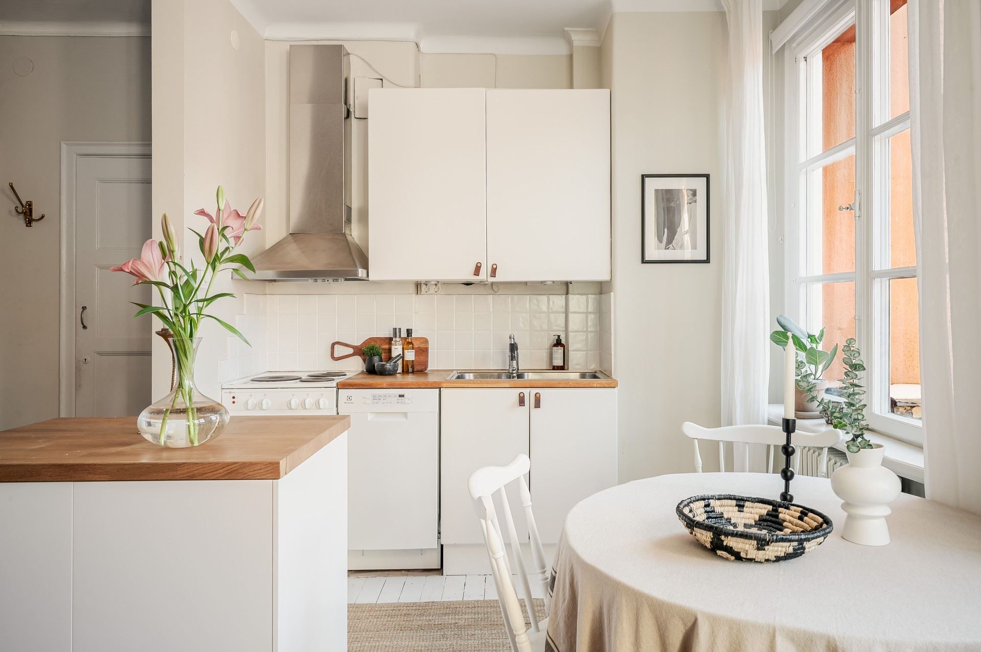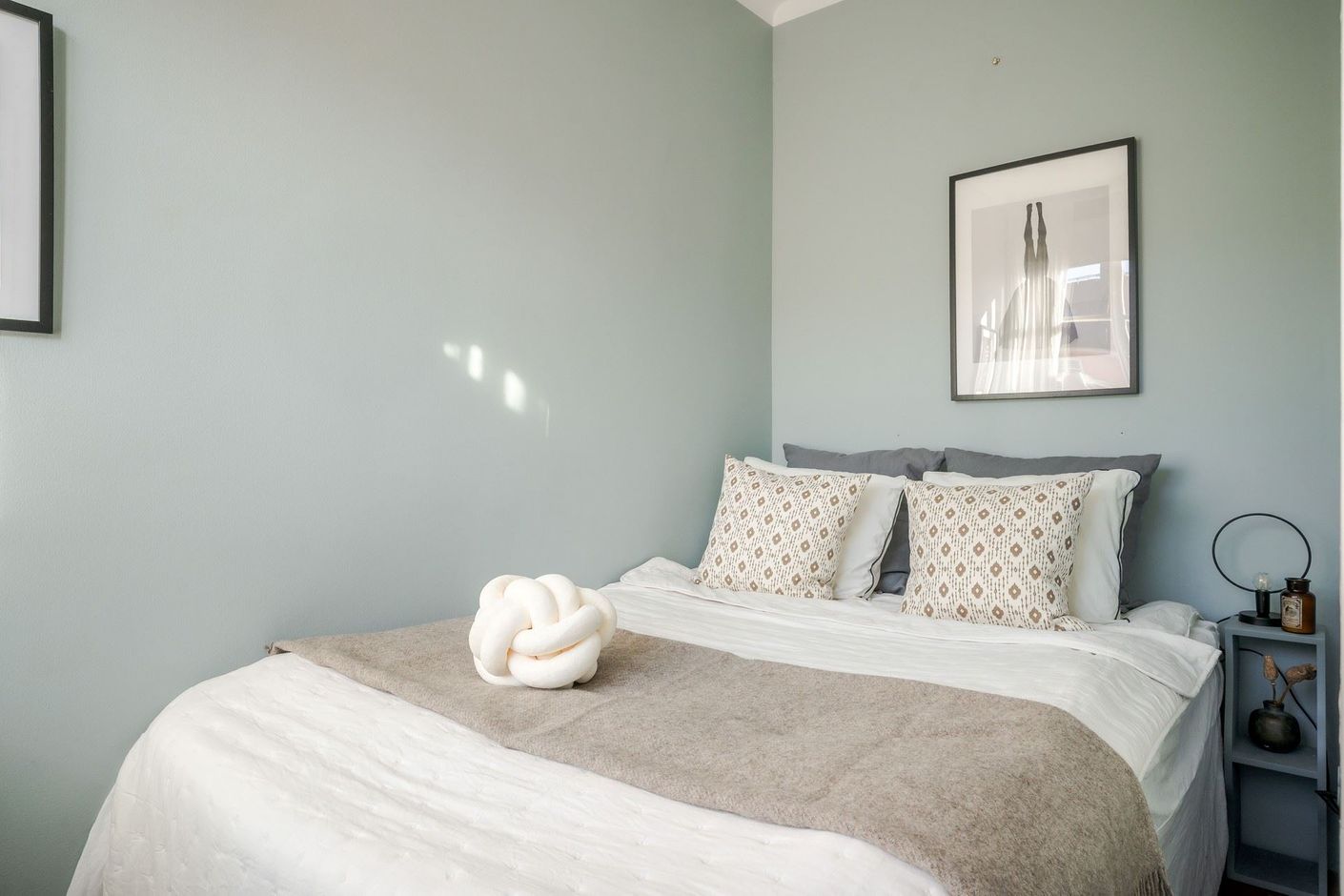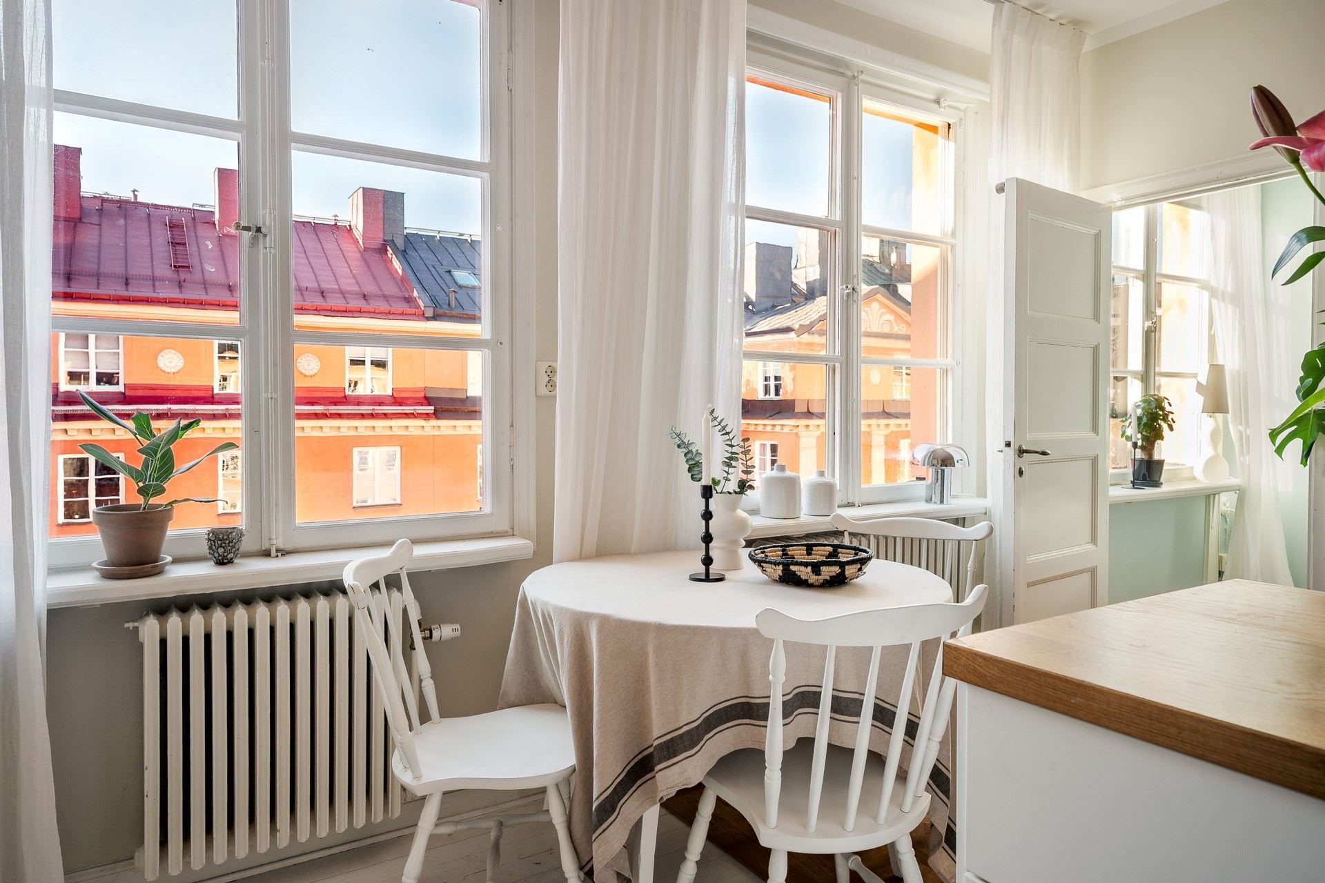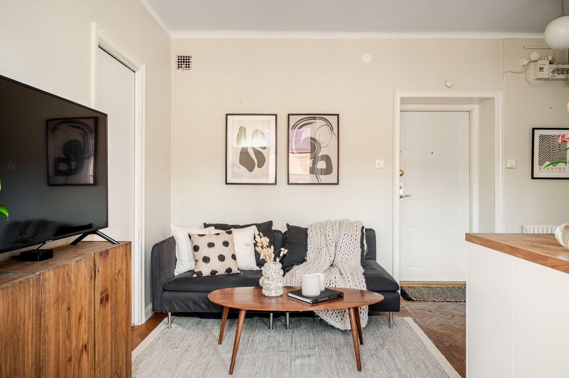 Den smart planerade bostaden erbjuder öppna och sociala ytor med plats för soffa, tv-bänk och matgrupp intill köksfönstret. Köksön fungerar som en naturlig avdelare och en självklar samlingspunkt. Det separata sovrummet rymmer en 1,60-säng och har ett högt placerat fönster mot en lugn tvärgata.