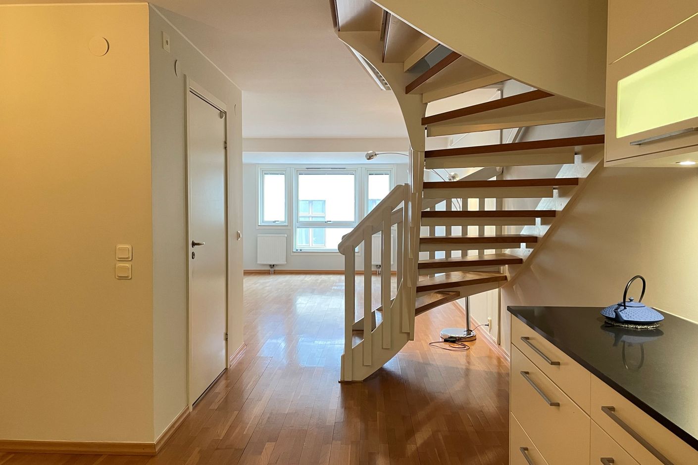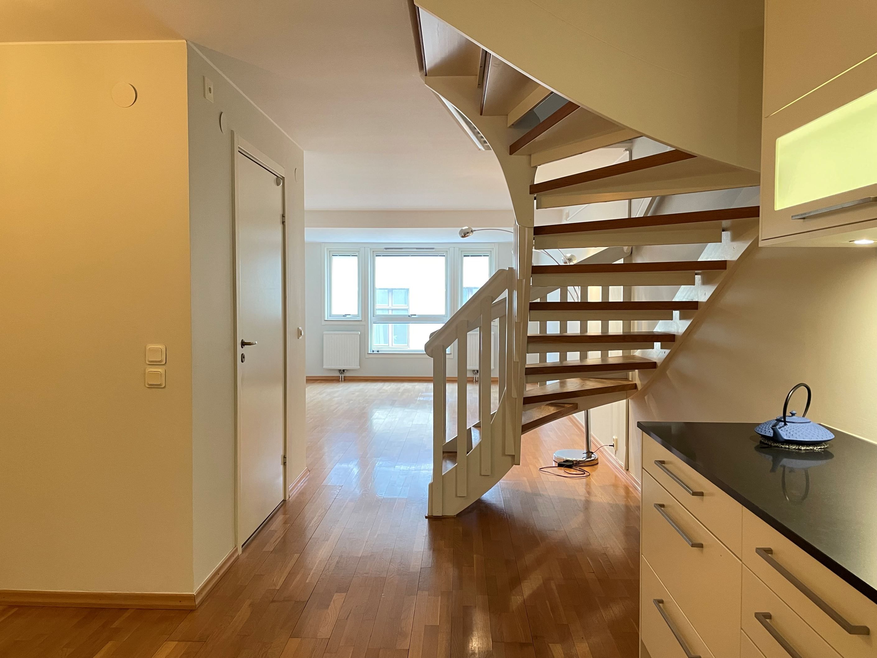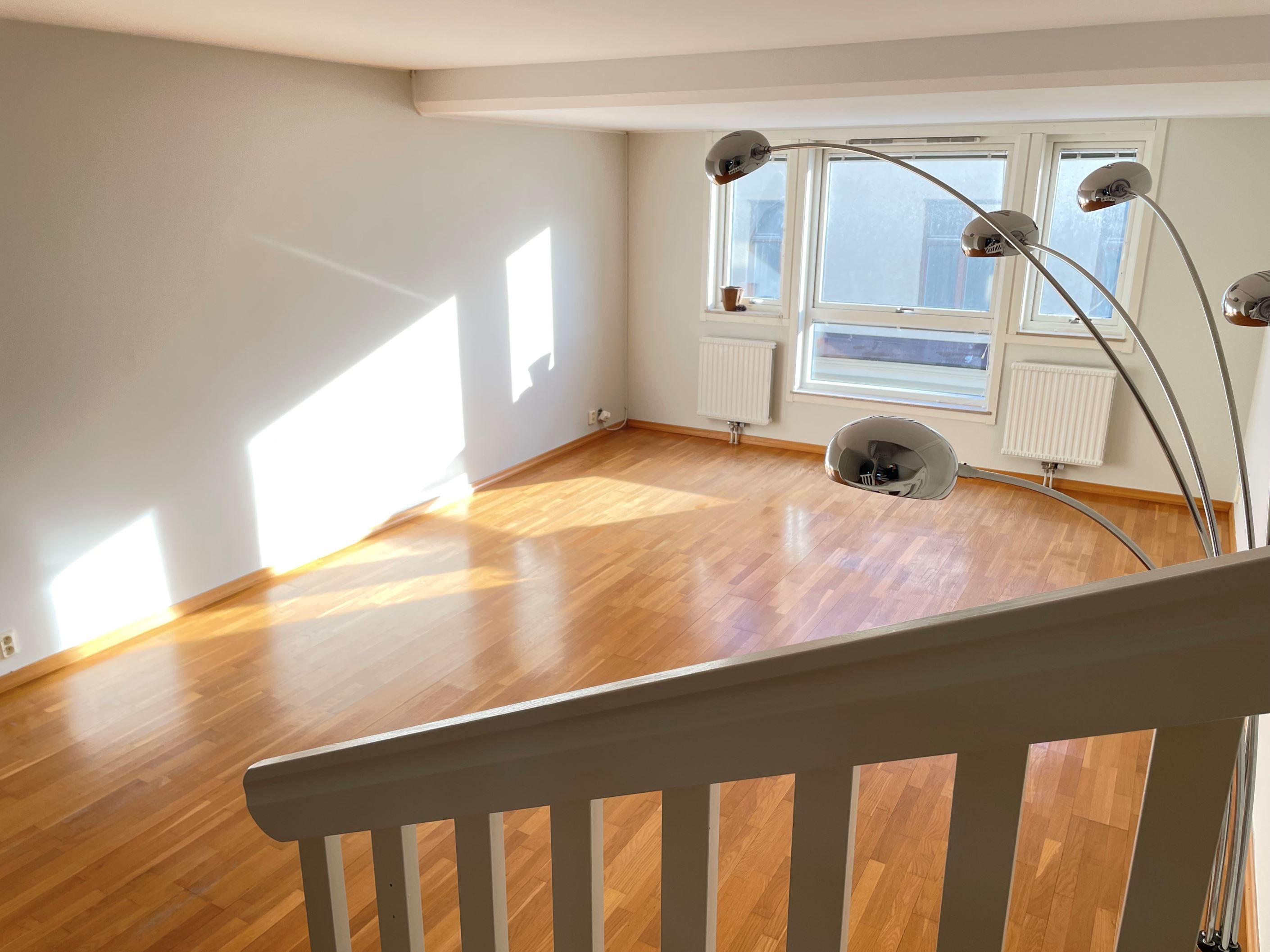 Högt ovanför stadens puls finner ni detta ljusa och välplanerade etagelägenhet. Entréplanet är öppet och socialt utformat där kök, matplats och vardagsrum flyter samman i en harmonisk helhet. De stora fönsterpartierna i vardagsrummet släpper in generöst med ljus och skapar en luftig känsla genom hela våningsplanet. Det stilrena köket är fullt utrustat och genomtänkt in i minsta detalj. På övre plan finns två rymliga sovrum, varav ett har direkt access till den härliga terrassen med soligt läge och utsikt över Domkyrkans klocktorn.Det andra rummet kan enkelt byggas om till två separata sovrum vid behov. Förvaringsmöjligheterna är utmärkta med både garderober och klädkammare, och båda våningarna erbjuder helkaklade badrum.