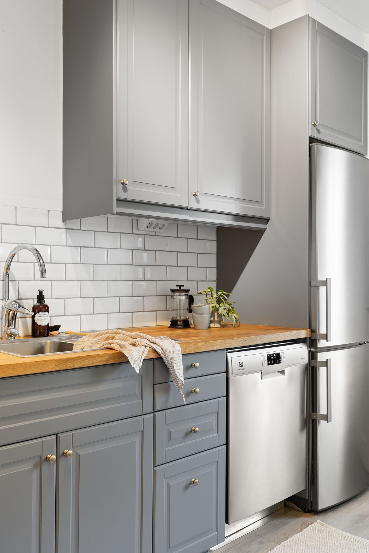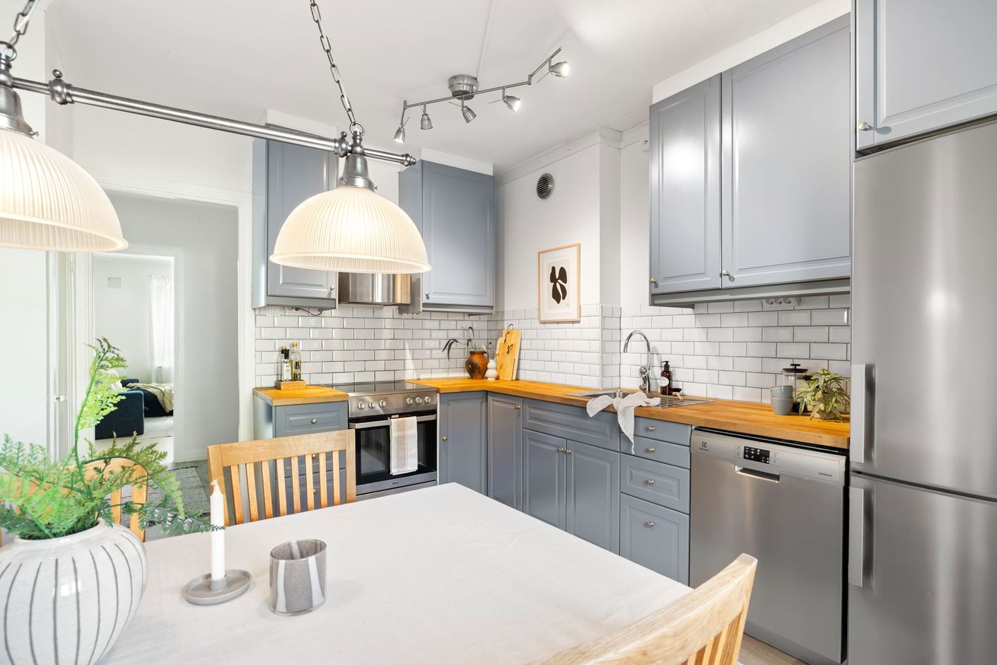 På Drottninggatan 31C finner du en tydlig social respektive privat del mellan rum och kök. Köket är lantligt och renoverat i stilrena, sobra grå toner. Köket är renoverat 2016.